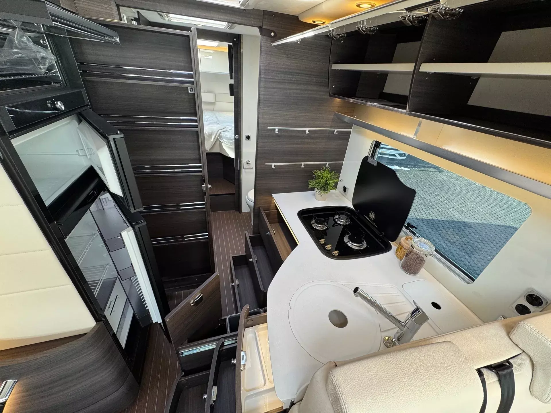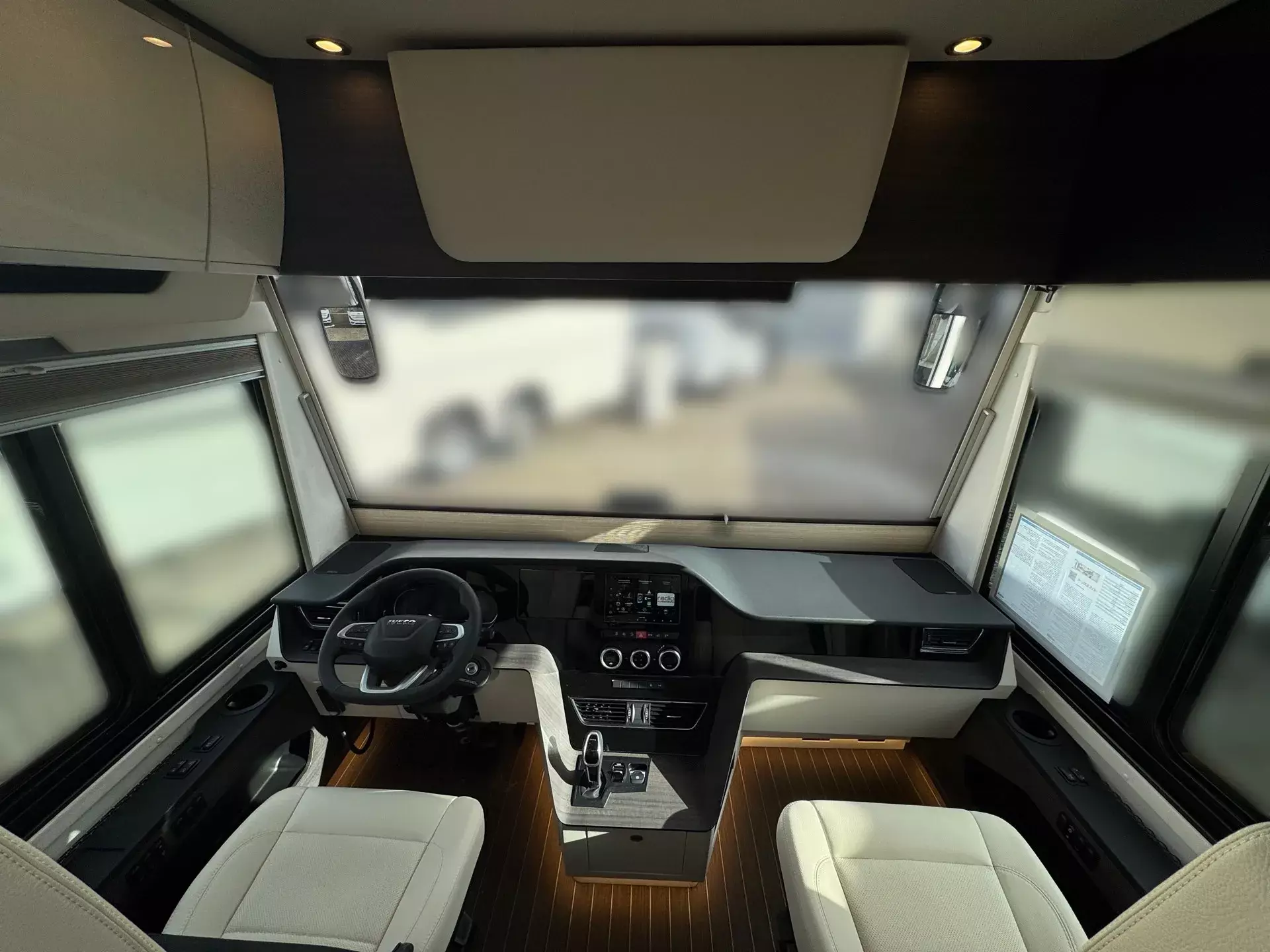-Centurion Style-Paket: Möbelbau in Atlas Zeder mit Dachschrank-Möbelfronten in „high gloss“ Senosan Creme Weiß und Griffleisten in Edelstahl-Optik, Außendekor „Centurion Style“ im bruched Folien Design inklusive Schriftzug, Aufbaufenster mit Tönung in Privacy Black, Jalousien Wohnraum in Holzoptik, Objektboden Soft-Walk im Yacht-Style, Shadow Line LED Hauptscheinwerfer und im Stoßfänger integrierte LED-Nebelscheinwerfer, sowie statisches Kurvenlich. Tagfahr-Blinklicht mit LED