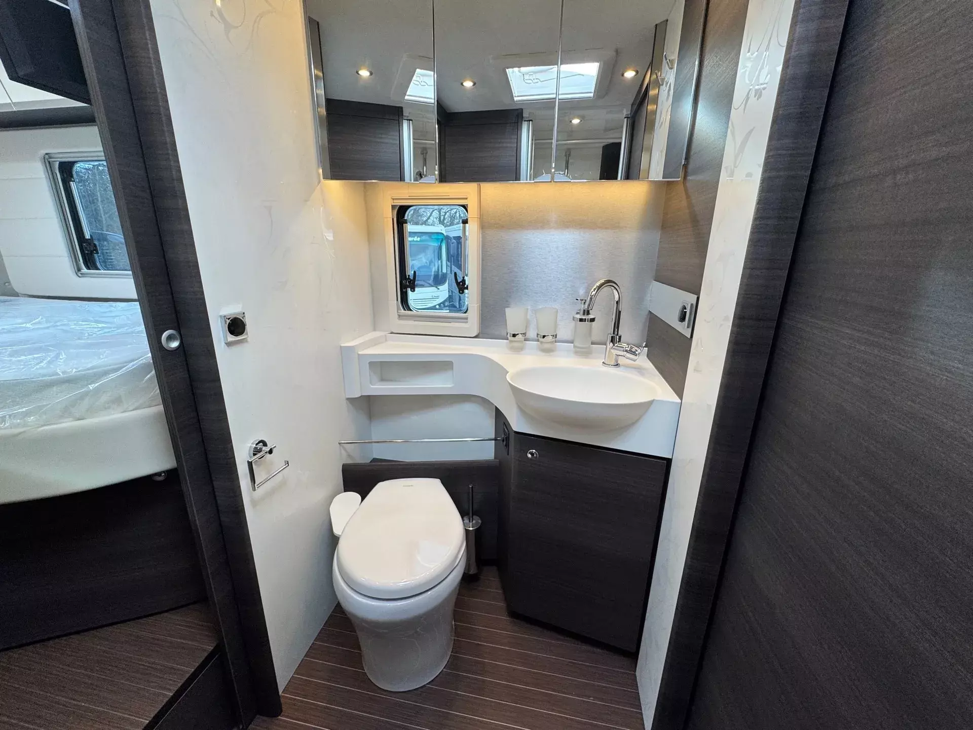 -Satelliten-TV-Anlage mit Full HD LED Smart TV 32“ im Oberschrank rechts, elektrisch absenkbar. Satelliten-TV-Anlage mit 85-cm-Spiegel, vollautomatische Ausrichtung, Mehrteilnehmer-Ausstattung durch TWIN-LNB, Anschluss für zweiten Receiver mit 12 V und Antennensteckdose im Schlafraum, Tonwiedergabe über Radioanlage möglich (Fahrzeuggesamthöhe plus ca. 120 mm)