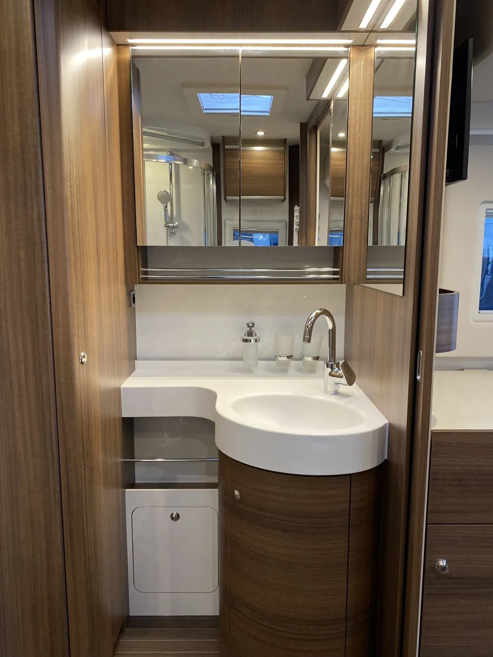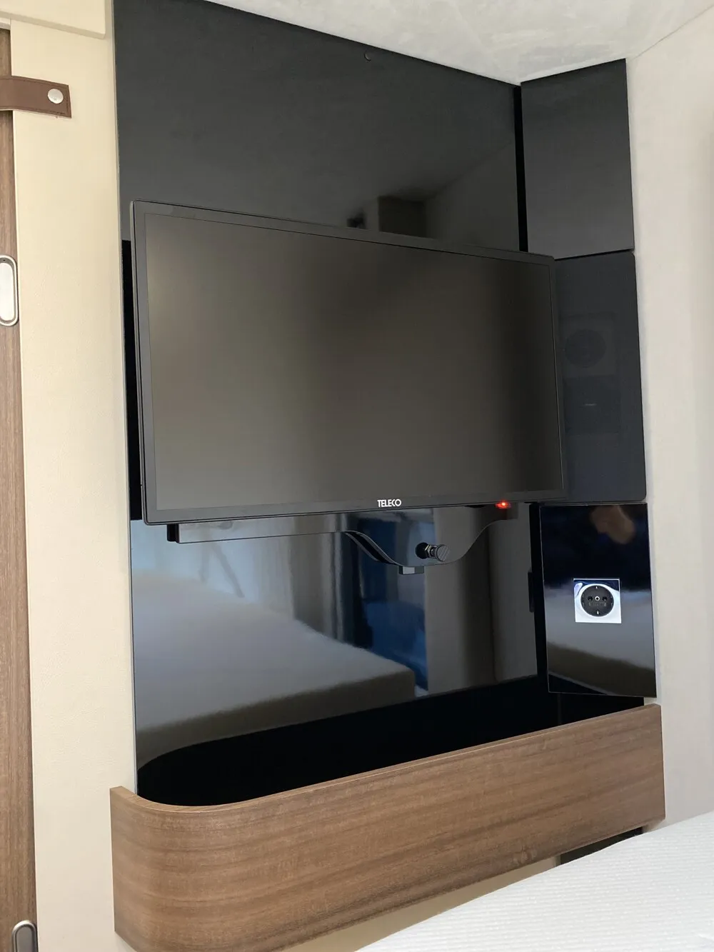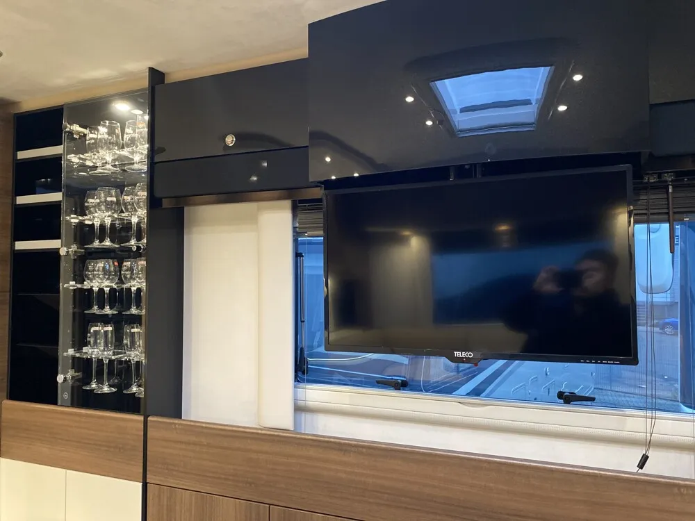 - Satelliten-TV-Anlage mit Full HD LED Smart TV 32" Heck rechts (nur 890 RRL) (Satelliten-TV-Anlage mit 85-cm-Spiegel, vollautomatische Ausrichtung, Mehrteilnehmer-Ausstattung durch TWIN-LNB, Anschluss für zweiten Receiver mit 12 V und Antennensteckdose im Schlafraum, Tonwiedergabe über Radioanlage möglich (Fahrzeuggesamthöhe plus ca. 100 mm) ) Achtung: SAT-Gelenk entgegen der Fahrtrichtung - Der Drehradius der SAT-Anlage geht über das Heki im Bad. Somit könnte es zu einer Kollision kommen, wenn das Heiki offen / göffnet ist.