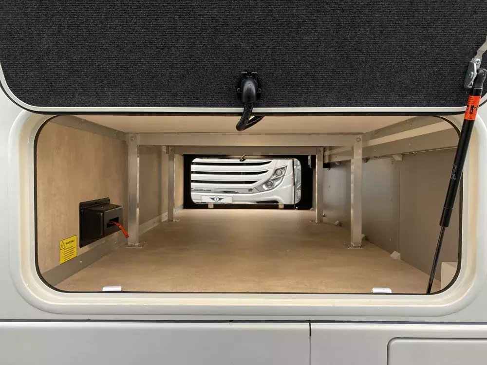 - Steckdosenkombination, 230 V / 12 V / Antenne (im Doppelboden mit Bodendurchführung, Position: im Außenstaufach rechte Fahrzeugseite (für wahlweisen TV-Außenanschluss) (Sat-Ausgang))