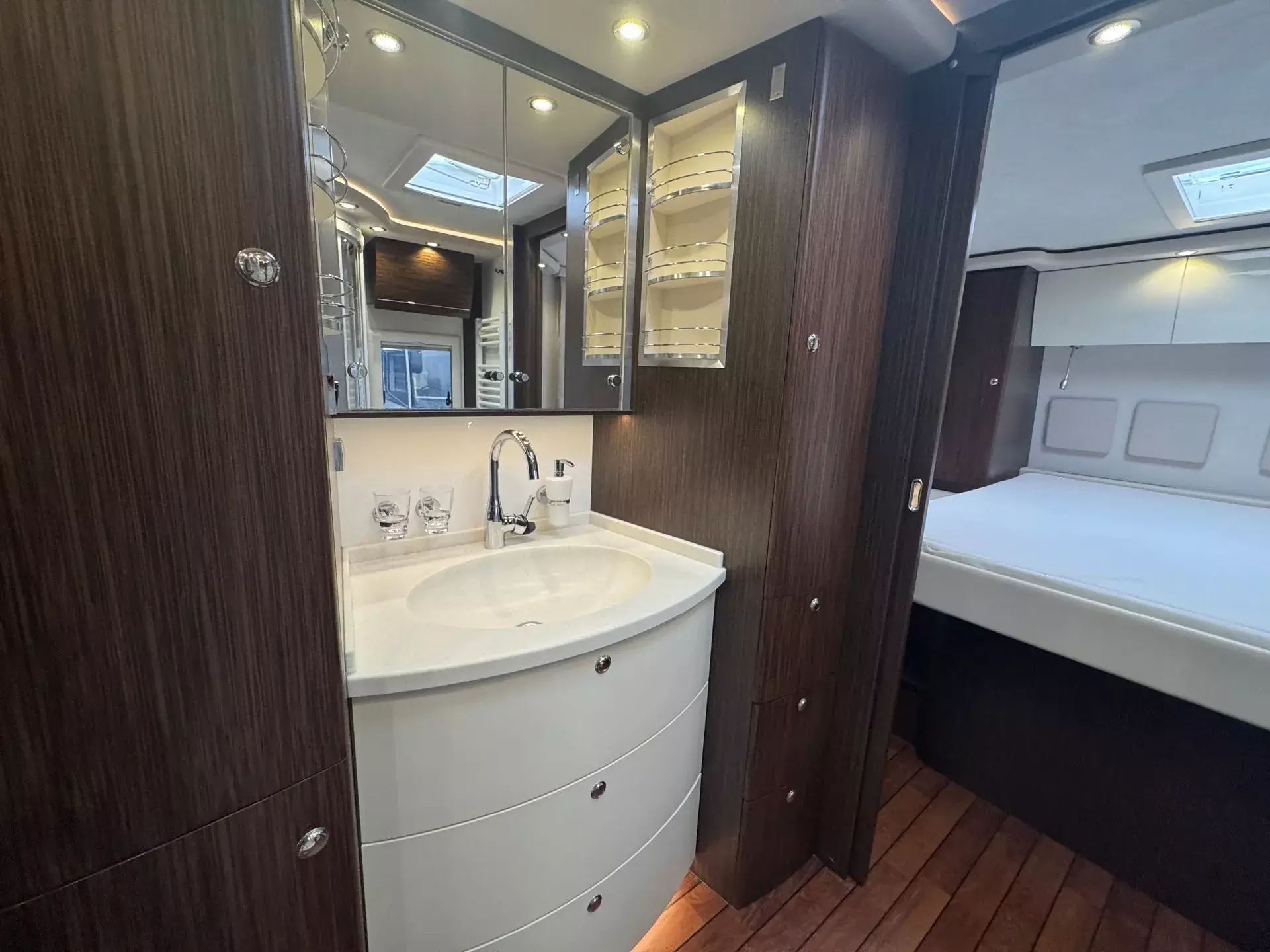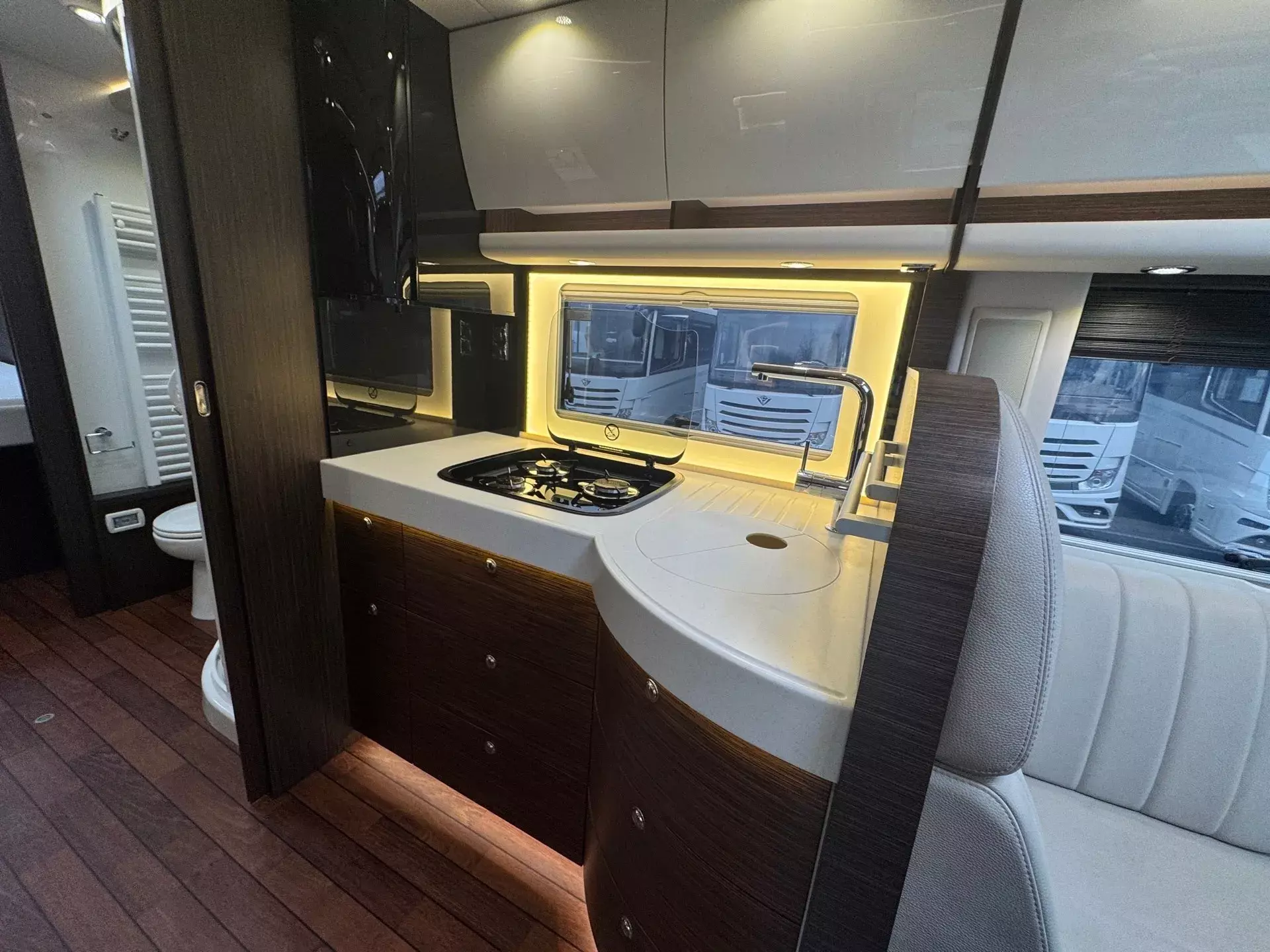 -Holzjalousien Wohnraum; Ledereinfassungen an Wohnraum- und Fahrerhausfenstern
