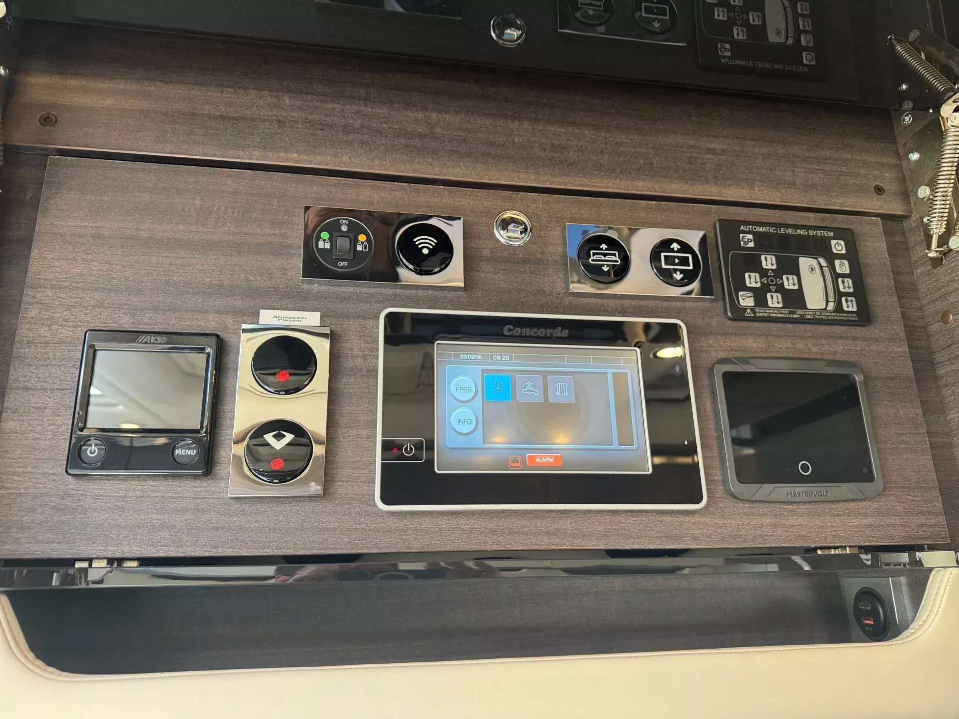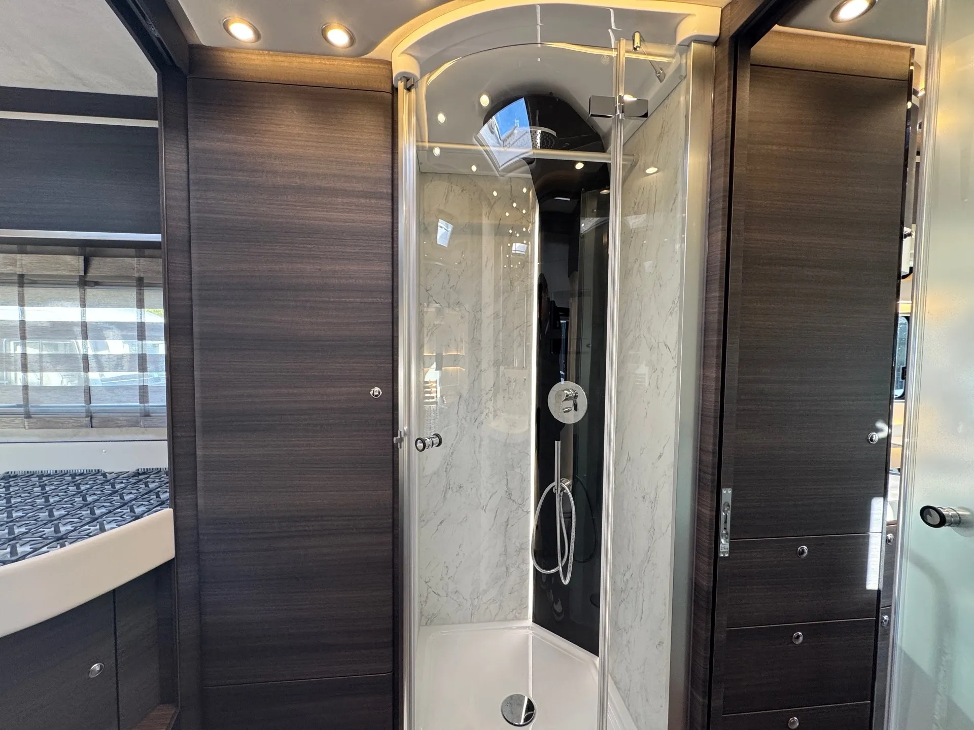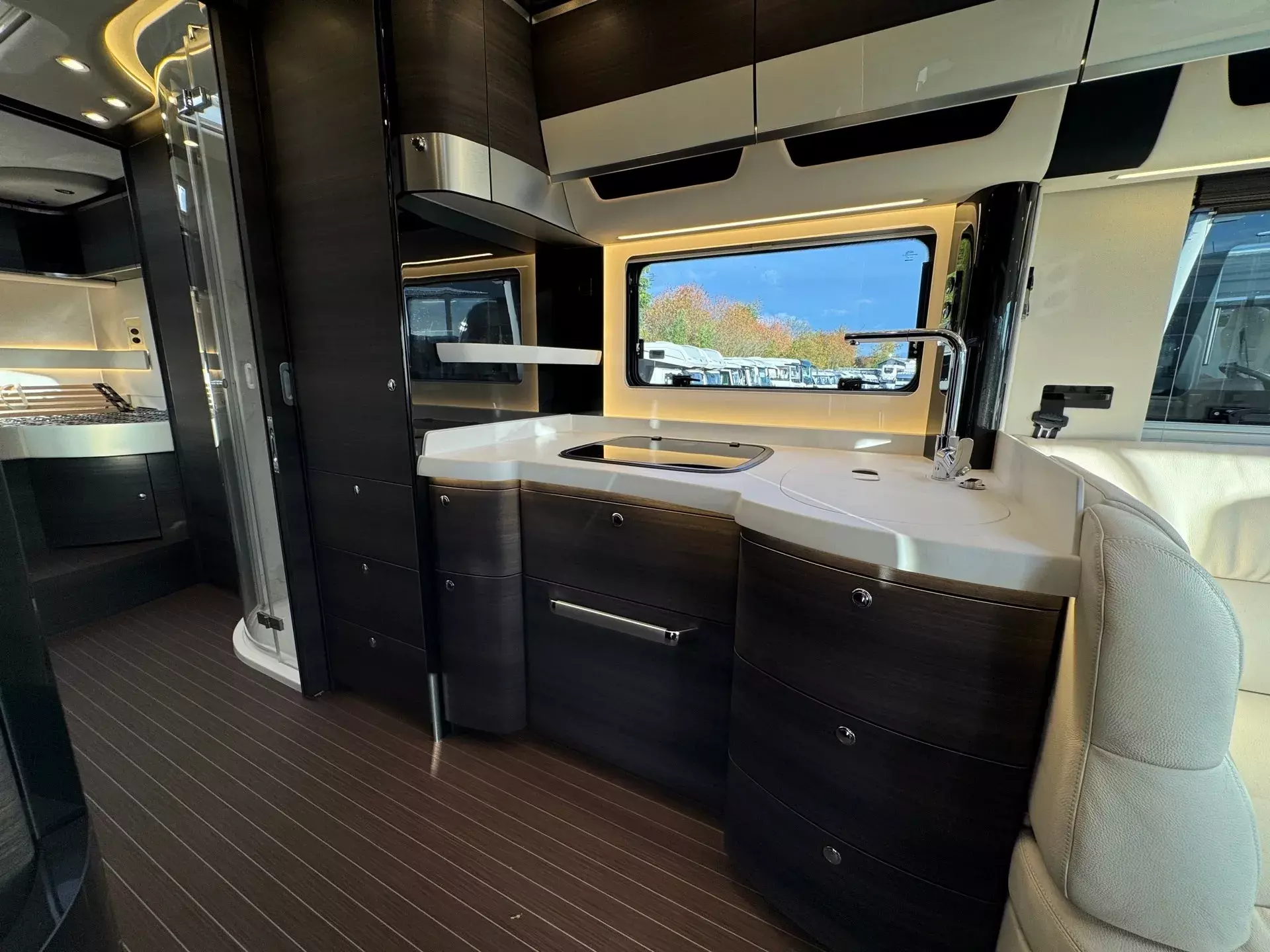 Innen mit Möbelbau in Atlas Zeder und exklusiven Dachschrank-Möbelfronten im Wohnraum in 2/3 Zeder und 1/3 Sensosan creme-weiß mit Griffleisten in Edelstahl-Optik, Jalousien im Wohnraum in Holzoptik und Objektbodenbelag Soft-Walk im Yacht-Style.