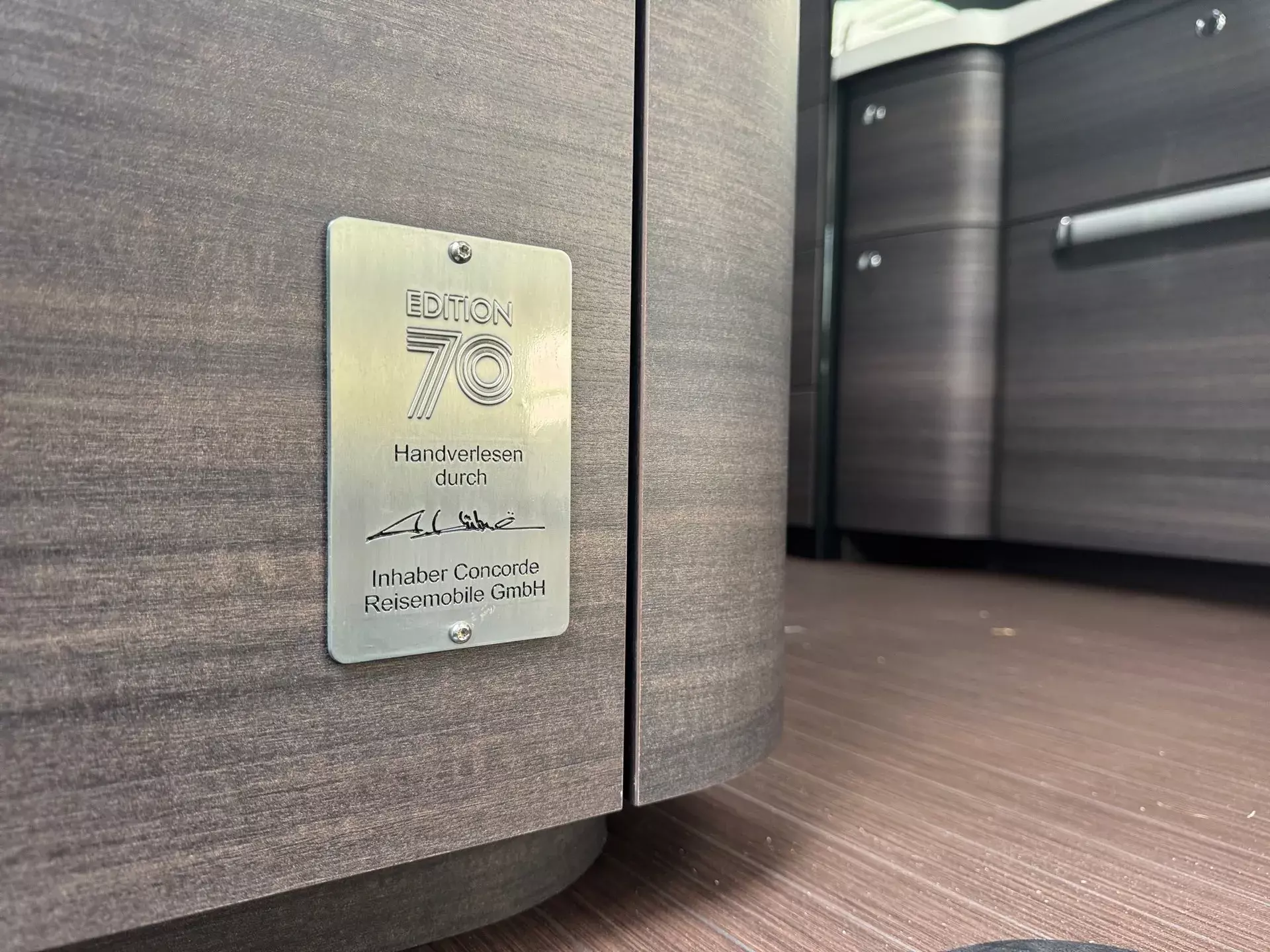 Andreas Kühne, Inhaber von Concorde, verleiht mit seiner Unterschrift auf einer Plakette im Eingang der "EDITION 70"-Landyacht sein persönliches Gütesiegel.