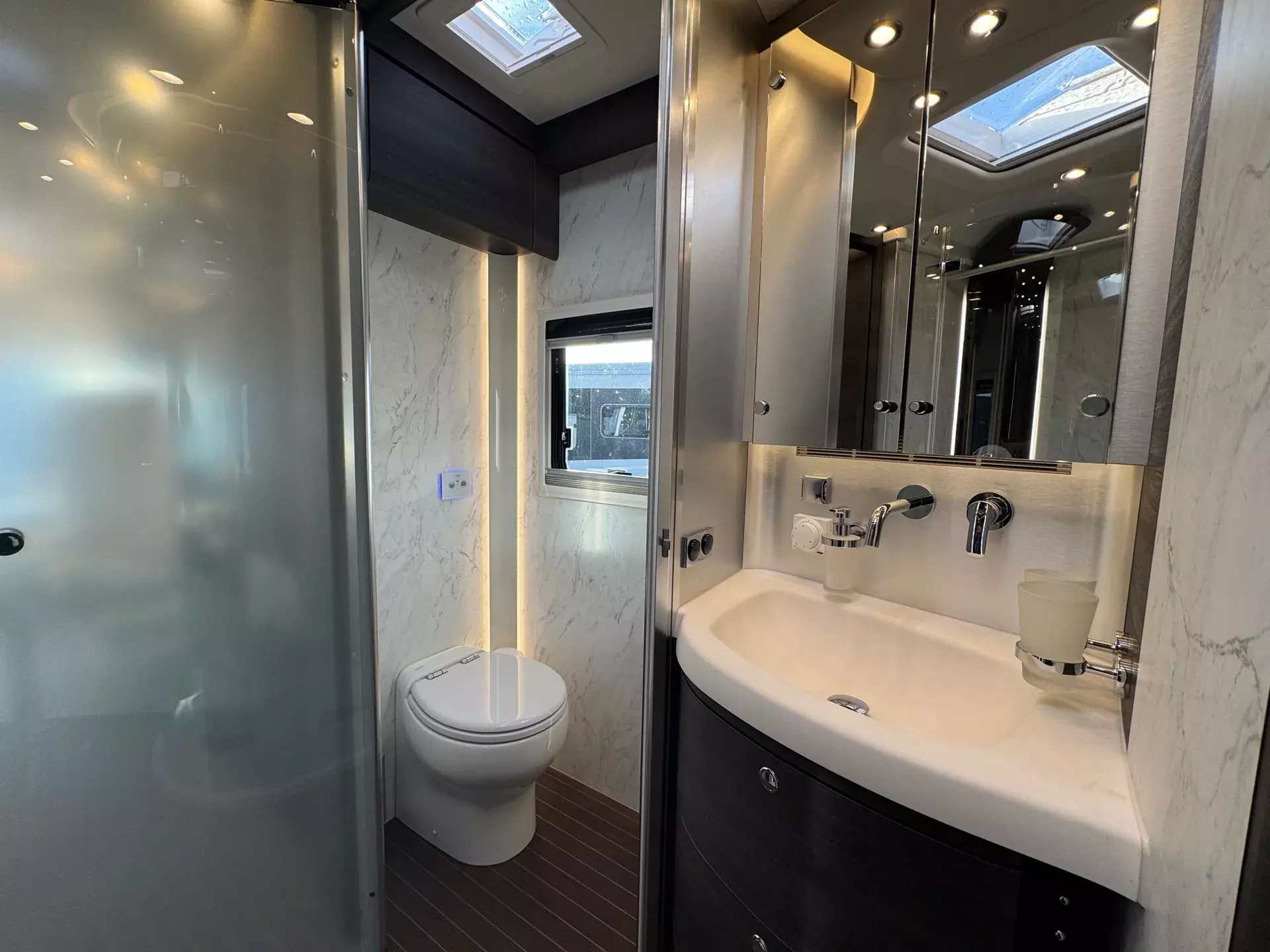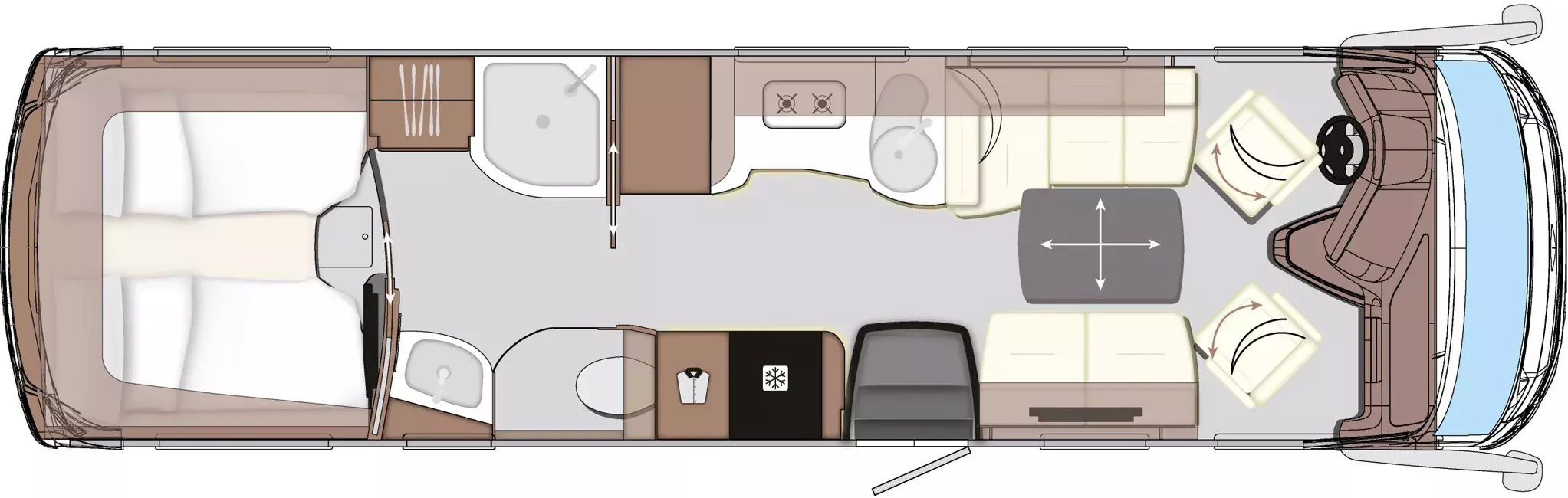 Praktische Alltagsfunktionen wie ein Kompressor-Kühlschrank, ein Li-Ionen-Batteriepaket, ein Solarpaket und eine Spülmaschine sorgen für Komfort. Durchdachte Entsorgungsfunktionen wie Umpump-Funktionen des Tanks, eine Kamera über elektrischen Ablassventilen und ein Wasserfiltersystem runden das Gesamtpaket ab.