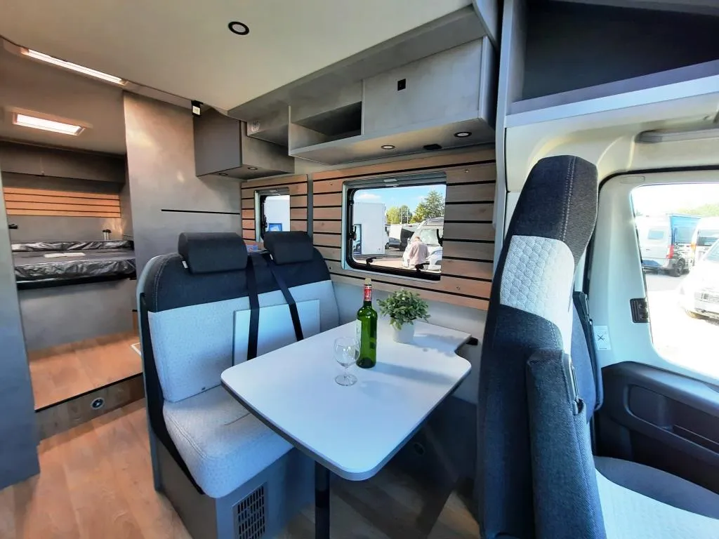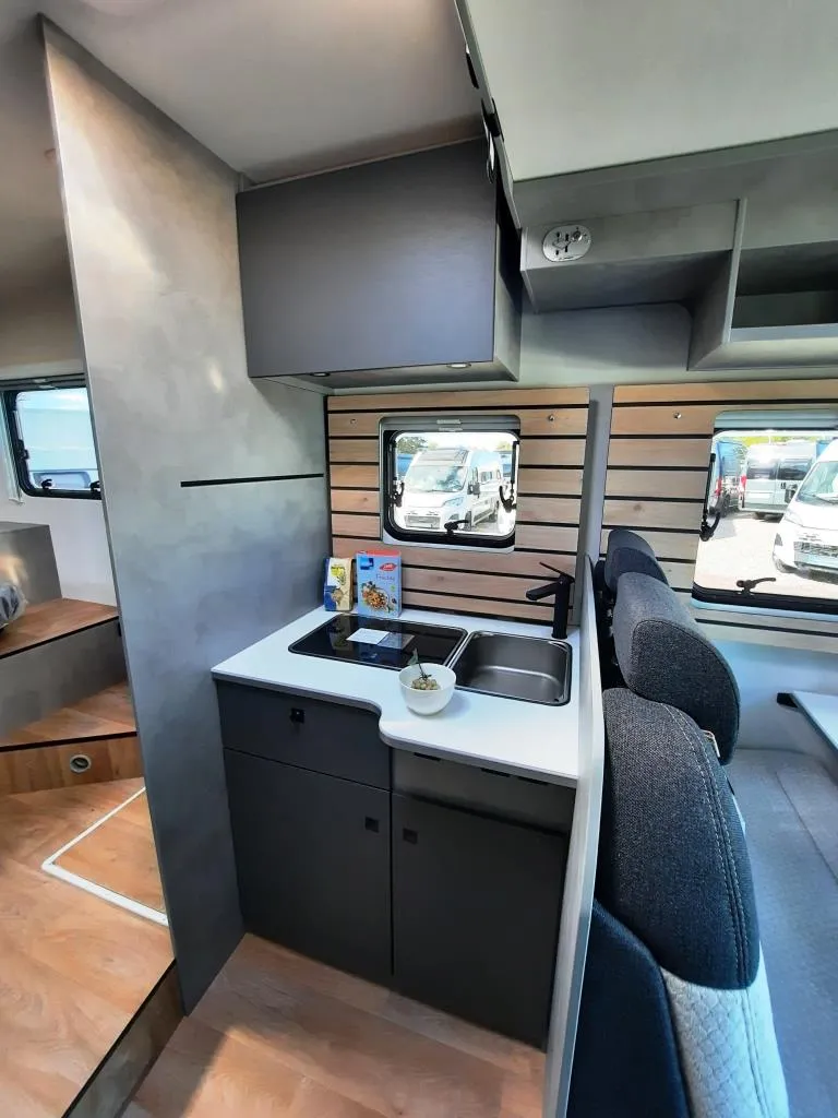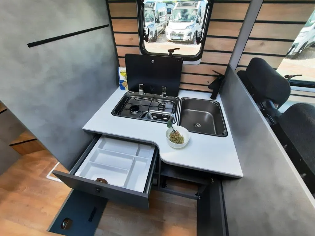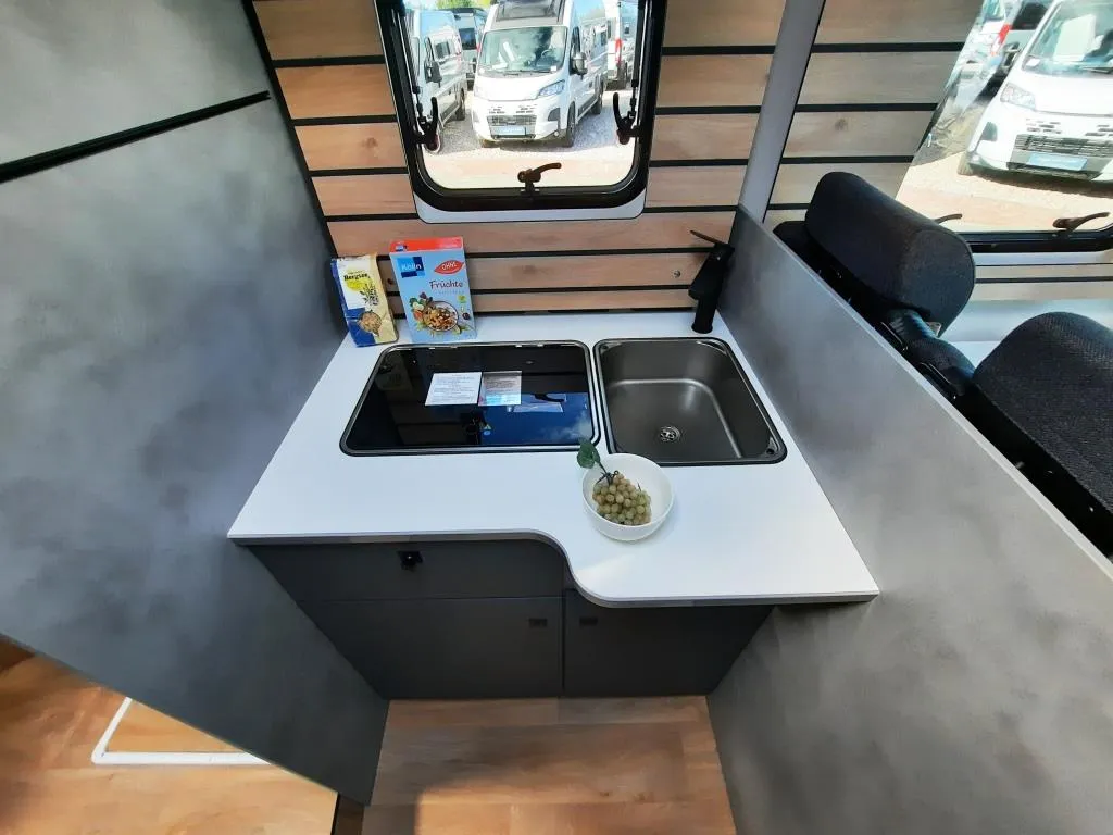 - Base Kit (Verdunklungsjalousien im Fahrerhaus, Fliegengitter-Aufbautür, Isofix 2x, Duschrost, Light Moments: Indirekte Ambientebeleuchtung über den Dachstauschränken, Light Moments: Küchenrückwand beleuchtet, Light Moments: Fensterverkleidung im Wohnraum beleuchtet)