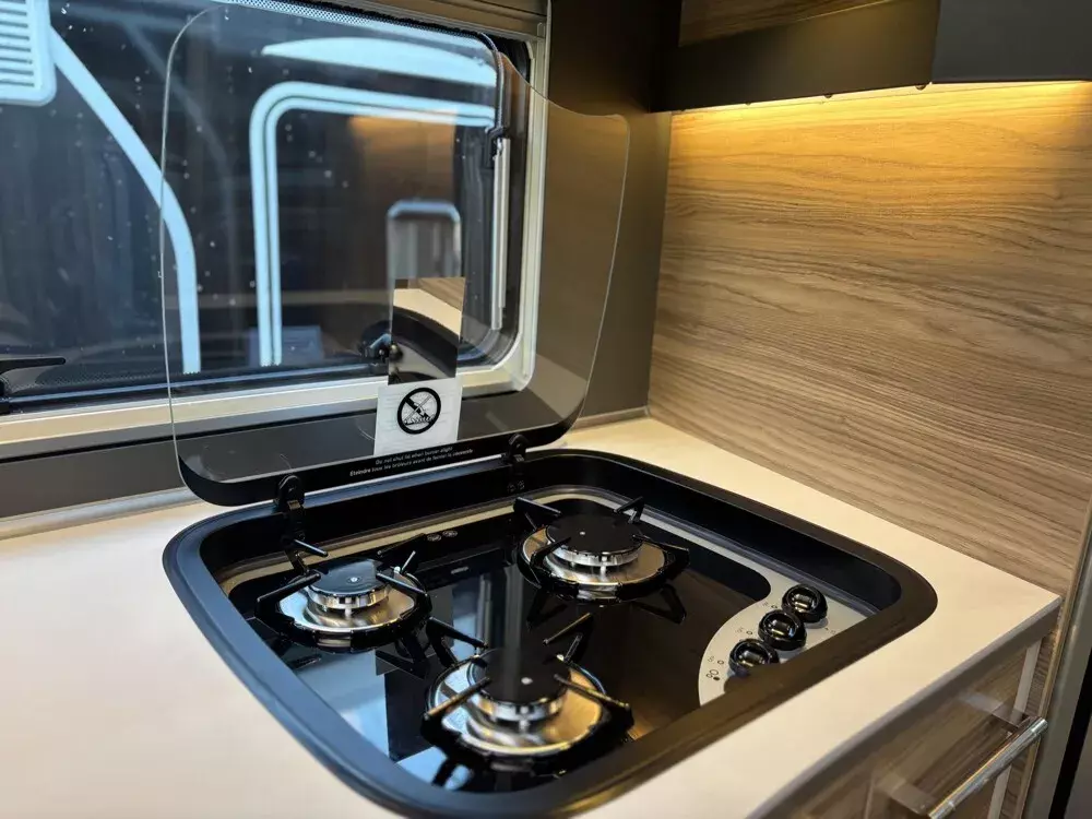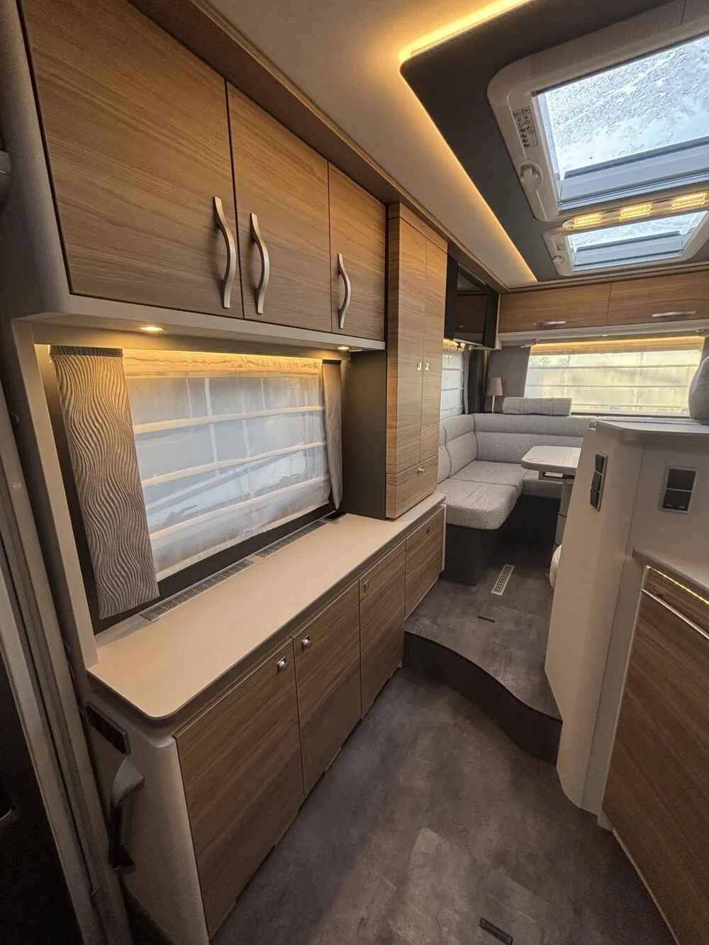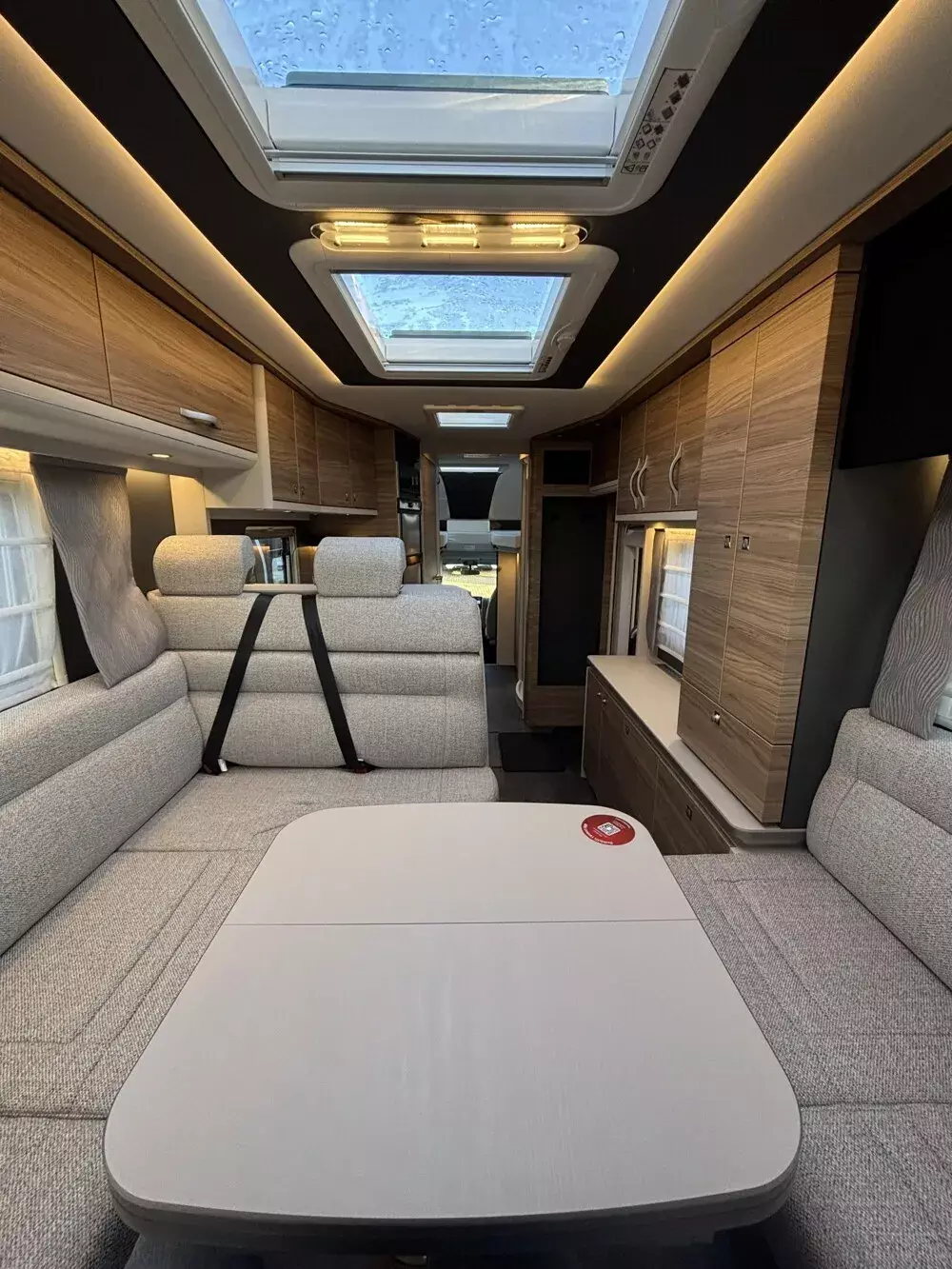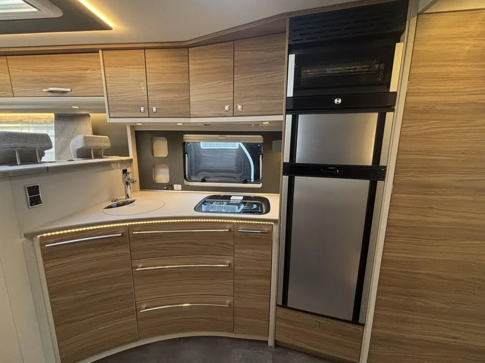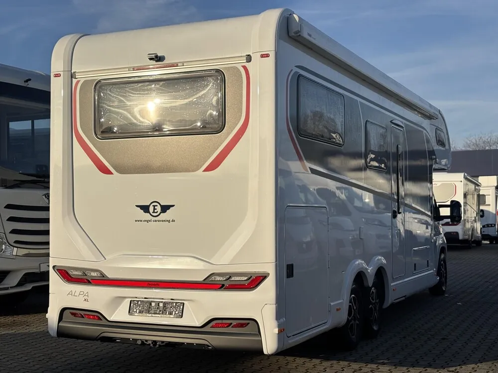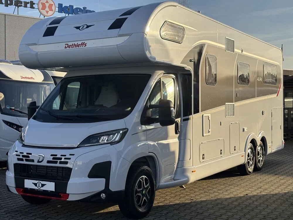 - 95 Jahre-Paket A 7820-2 (Light Moments: Indirekte Ambientebeleuchtung über den Dachstauschränken, Verdunklungsjalousien im Fahrerhaus, Dunstabzugshaube (Abluft) mit Zugluft-Stopper, Stützen (2 Stk.) für Anbau hinten, Automatische Gasflaschenumschaltung inkl. Crash Sensor und EisEx, Rückfahrkamera (Einfachkamera), Panoramafenster (zweite Panoramadachhaube 75x105 cm längs über Sitzgruppe Heck) inkl. Baldachin und Raumleuchte, Zentralverriegelung für Fahrerhaus-, Wohnraumtüre und Garagentüren, Styling-Paket (Alkovenaufsatz), Panorama-Dachhaube 70 x 50 cm im Alkoven, Außendesign GT (Heckleuchtenträger mit schwarzem Diffusor, Skidplate "rot"), Hoher charakteristischer Dethleffs Exklusiv Heckleuchtenträger mit ShapeLine LED Rückleuchten und 3. Bremsleuchte, Light Moments: Indirekte Wandflächen-Ambientebeleuchtung, Light Moments: Indirekte Beleuchtung im Badezimmer mit beleuchteter Duschkonsole, Light Moments: Beleuchtete Garderobe, Light Moments: Sockelbeleuchtung in der Küche, Victron PowerAssist und PowerControl, Elektroblock EBL 102, Victron Bedienpaneel über der Aufbautür, Victron Energy MultiPlus Lade-/Wechselrichterkombination 1600W/70A, 168 Ah Lithium Batterie, Automatische SAT Anlage 85 Twin mit 32" TV (inkl. Halter) inkl. Soundboard, Kühlschrank (177 l), Türe beidseitig zu öffnen mit integriertem Backofen, Wärmetauscher für Warmwasserheizung, Dethleffs Naviceiver inkl. DAB+, Truck Navigation, Wireless Apple CarPlay und Android Auto, Cassettenmarkise Omnistor 6,0 m (elektrisch), Gurtbank inkl. zwei 3-Punkt-Gurte entgegen der Fahrtrichtung inkl. Bettenbau Sitzgruppe, Auflastung auf 5.400 kg)