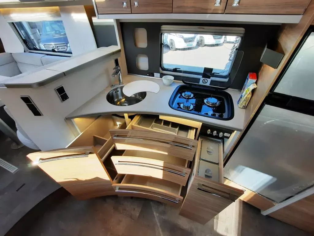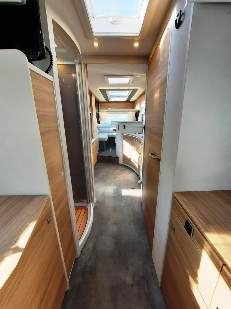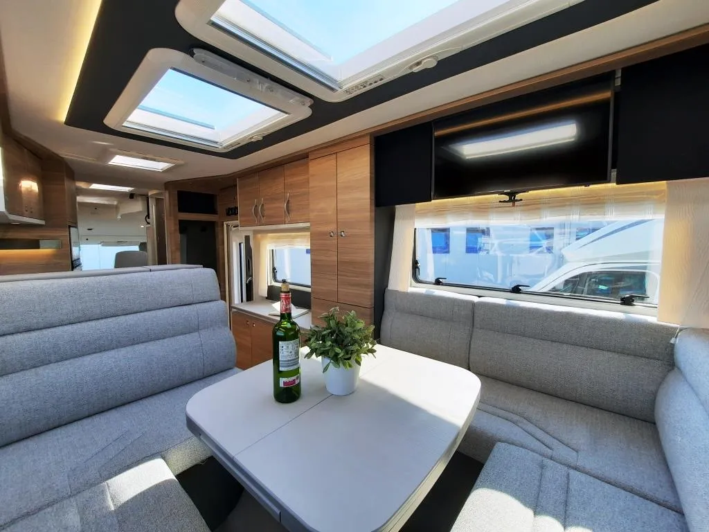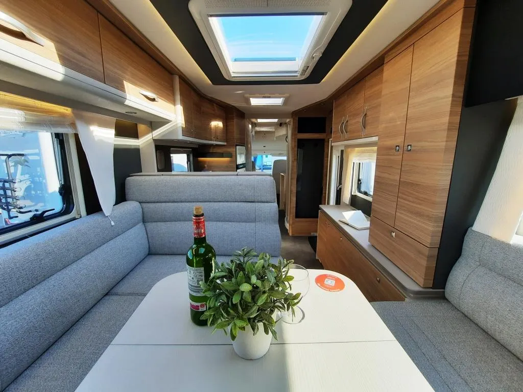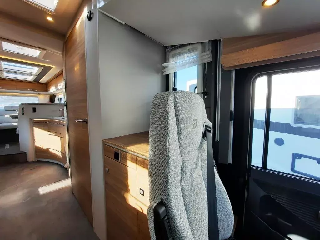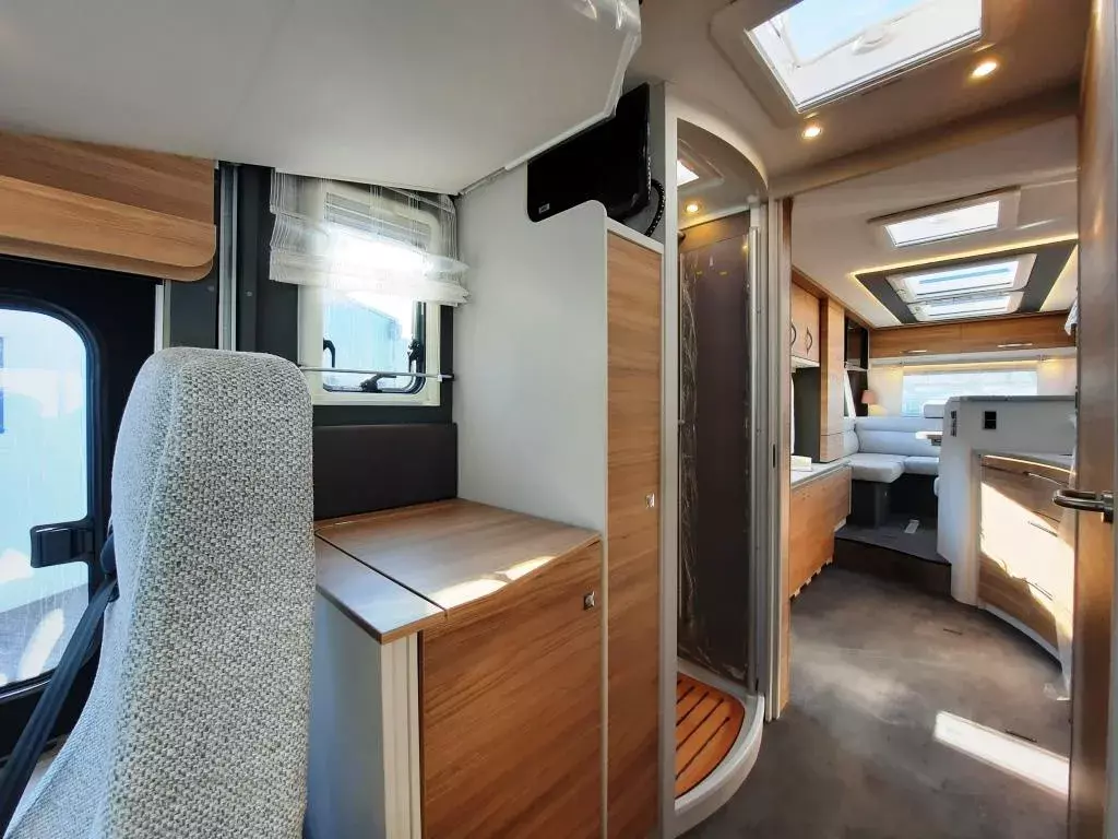 - Travel Paket (Vorbereitung für Radiosystem inkl. Soundpaket im Fahrerhaus, indirekte Ambientebeleuchtung über den Dachschränken, Dunstabzugshaube (Abluft) mit Zugluft-Stopper, Stützen (2 Stk.) für Anbau hinten, Radioantenne DAB+ auf dem Dach montiert, Automatische Gasflaschenumschaltung inkl. Crash Sensor, Eis-EX und Gasfilter, Rückfahrkamera (Einfachkamera), Panoramafenster (zweite Panoramadachhaube 75x105cm längs über Sitzgruppe Heck) inkl. Baldachin und Raumleuchte, Zentralverriegelung für Fahrerhaus-, Wohnraumtüre und Garagentüre+*)