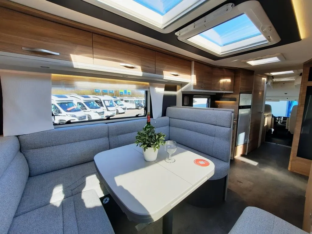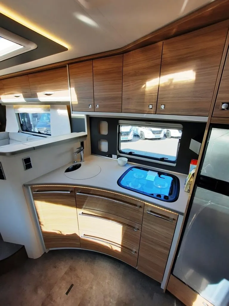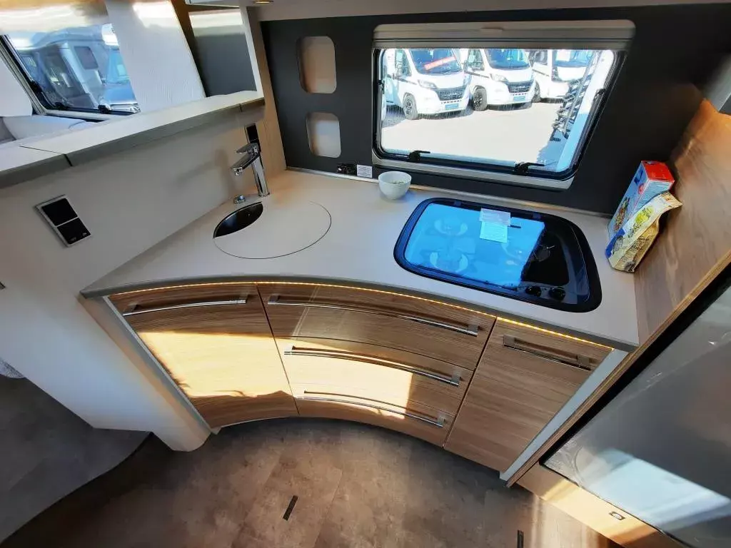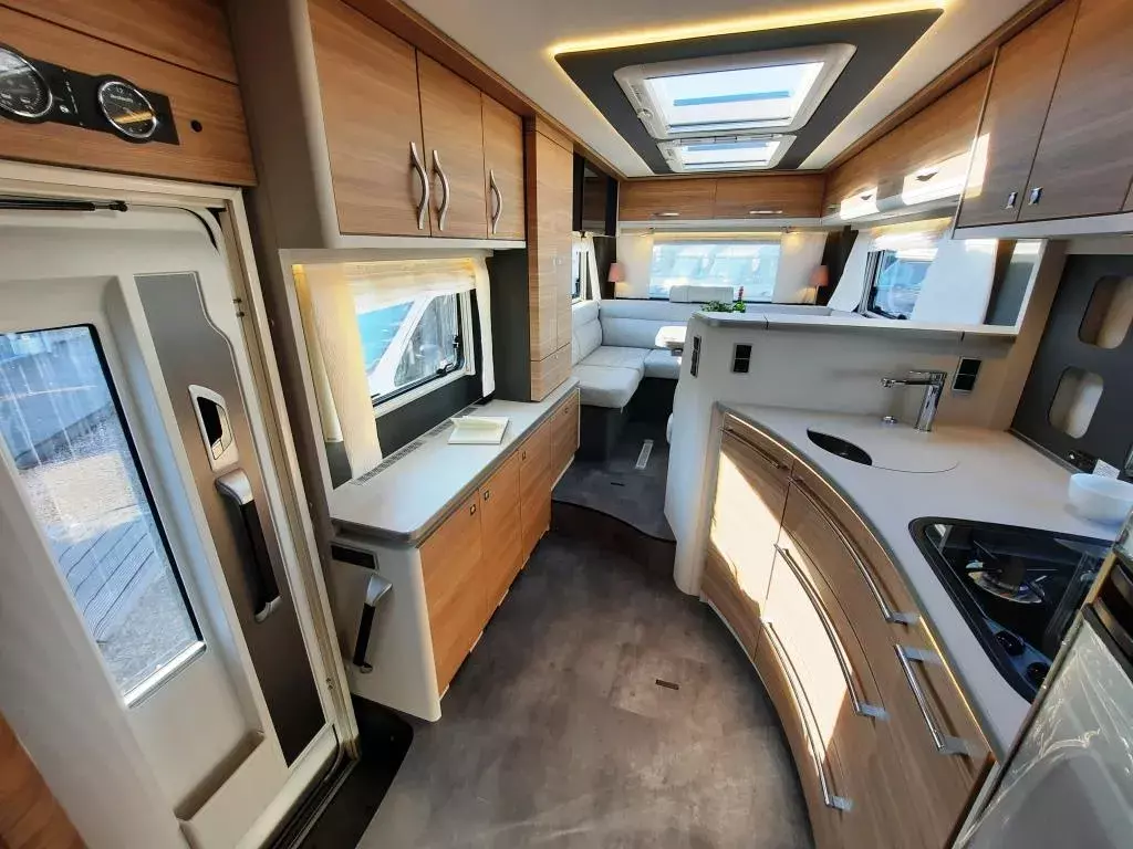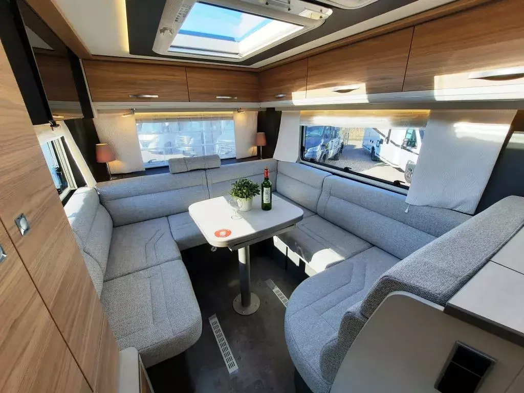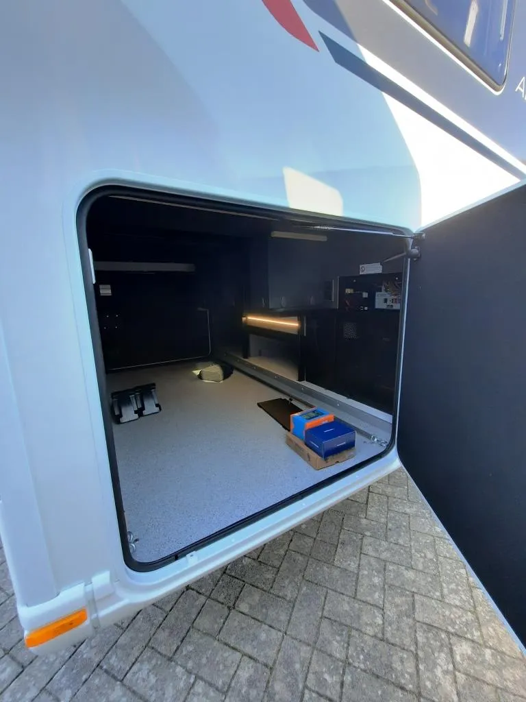 - Travel Paket (Vorbereitung für Radiosystem inkl. Soundpaket im Fahrerhaus, indirekte Ambientebeleuchtung über den Dachschränken, Dunstabzugshaube (Abluft) mit Zugluft-Stopper, Stützen (2 Stk.) für Anbau hinten, Radioantenne DAB+ auf dem Dach montiert, Automatische Gasflaschenumschaltung inkl. Crash Sensor, Eis-EX und Gasfilter, Rückfahrkamera (Einfachkamera), Panoramafenster (zweite Panoramadachhaube 75x105cm längs über Sitzgruppe Heck) inkl. Baldachin und Raumleuchte, Zentralverriegelung für Fahrerhaus-, Wohnraumtüre und Garagentüre+*)