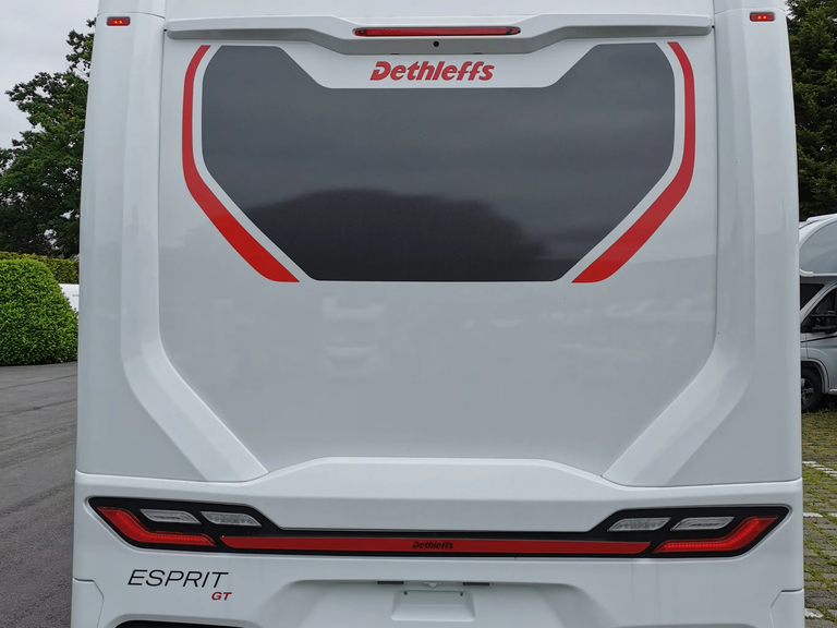 - Esprit GT Paket (LED-Abblendlicht, Sonnenblenden seitlich, als Rollo für Fahrer und Beifahrer, Panorama-Dachhaube 70 x 50 cm im Schlafraum, Innendesign GT inkl. erweiterter Küchenrückwand, Außendesign GT Advance (Heckleuchtenträger mit schwarzem Diffusor, lackierung I-Front teilweise schwarz, Kühlergrill mit Chromkeder, Skidplate "rot"), Hoher charakteristischer Dethleffs Exklusiv Heckleuchtenträger mit ShapeLine LED Rückleuchten, in Heckspoiler integrierter 3. Bremsleuchte und eingezogener Heckwand)