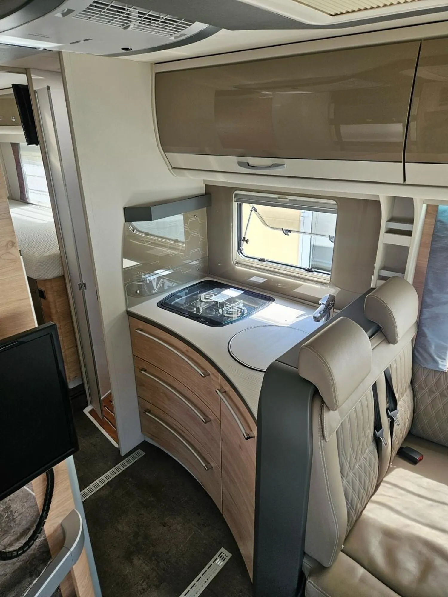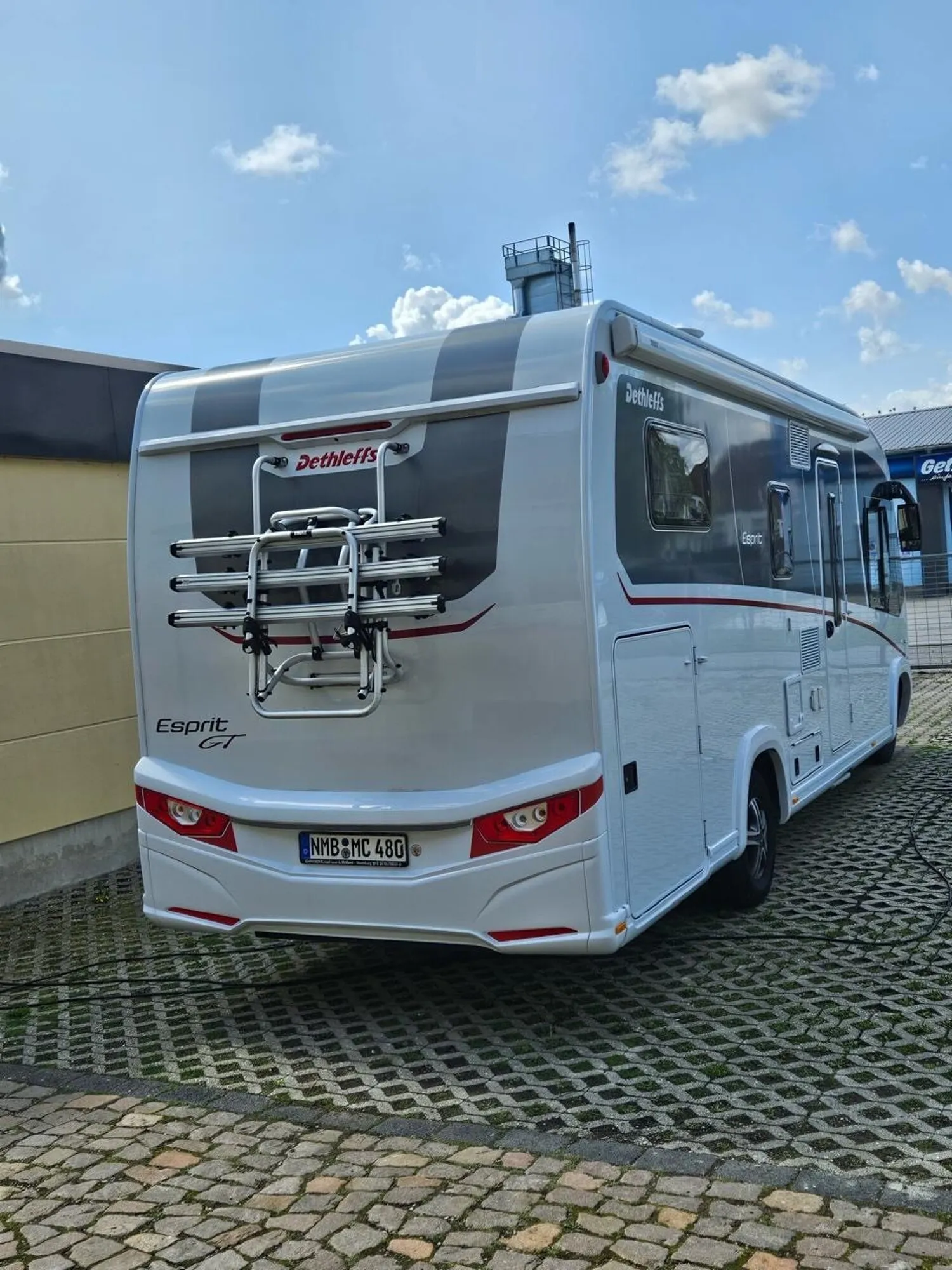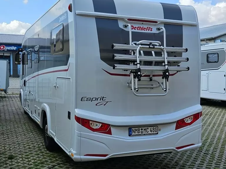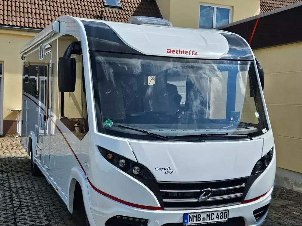 - Esprit GT Paket "Grey" (Vorbereitung für Radiosystem inkl. Soundpaket im Fahrerhaus, Radioantenne DAB+ auf dem Dach montiert, Fahrerhaustüre links, Panorama-Dachhaube 75x105 cm inkl. beleuchtetem Baldachin im Wohnraum, Indirekte Ambientebeleuchtung über den Dachstauschränken, Stützen (2 Stk.) für Anbau hinten, Elektrischer Frontscheiben-Rollo, Automatische Gasflaschenumschaltung inkl. Crash Sensor, EisEx und Gasfilter, Dunstabzugshaube (Abluft) mit Zugluft-Stopper, Integrierte Einlinsen Rückfahrkamera, Zentralverriegelung für Fahrerhaus-, Wohnraumtüre und Garagentüren, LED-Abblendlicht, Piloten-Luftschwingsitz von SKA, Sonnenblenden seitlich, als Rollo für Fahrer und Beifahrer, Panorama-Dachhaube 75x105 cm im Schlafraum, Innendesign GT inkl. erweiterter Küchenrückwand, Außendesign GT Advance Grey (Lackierung I-Front teilweise schwarz, erweiterte Beklebung GT Grey, Skidplate "rot"), Alufelgen Dethleffs 16 Zoll)