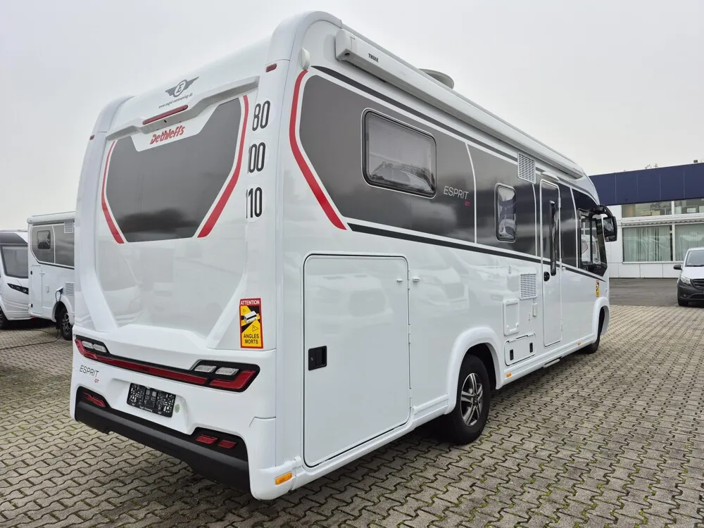 - Esprit GT Advance (Vorbereitung für Radiosystem inkl. Soundpaket im Fahrerhaus, Radioantenne DAB+ auf dem Dach montiert, Fahrerhaustüre links, Panorama-Dachhaube 75x105 cm im Wohnraum, Light Moments: Indirekte Ambientebeleuchtung über den Dachstauschränken, Stützen (2 Stk.) für Anbau hinten, Elektrischer Frontscheiben-Rollo, Automatische Gasflaschenumschaltung inkl. Crash Sensor, EisEx und Gasfilter, Dunstabzugshaube (Abluft) mit Zugluft-Stopper, Integrierte Einlinsen Rückfahrkamera, Zentralverriegelung für Fahrerhaus-, Wohnraumtüre und Garagentüren, LED-Abblendlicht, Sonnenblenden seitlich, als Rollo für Fahrer und Beifahrer, Panorama-Dachhaube 70 x 50 cm im Schlafraum, Innendesign GT inkl. erweiterter Küchenrückwand, Außendesign GT Advance (Heckleuchtenträger mit schwarzem Diffusor, lackierung I-Front teilweise schwarz, Kühlergrill mit Chromkeder, Skidplate "rot"), Alufelgen Dethleffs 16 Zoll, Hoher charakteristischer Dethleffs Exklusiv Heckleuchtenträger mit ShapeLine LED Rückleuchten, in Heckspoiler integrierter 3. Bremsleuchte und eingezogener Heckwand)