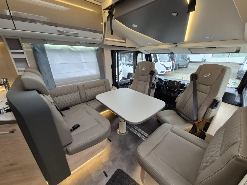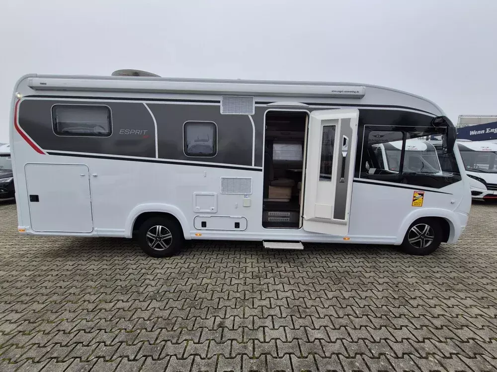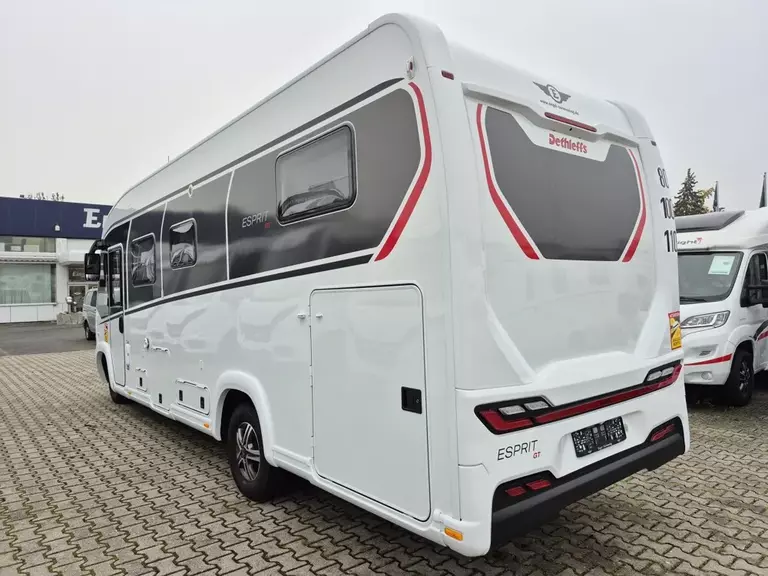 - Esprit GT Advance (Vorbereitung für Radiosystem inkl. Soundpaket im Fahrerhaus, Radioantenne DAB+ auf dem Dach montiert, Fahrerhaustüre links, Panorama-Dachhaube 75x105 cm im Wohnraum, Light Moments: Indirekte Ambientebeleuchtung über den Dachstauschränken, Stützen (2 Stk.) für Anbau hinten, Elektrischer Frontscheiben-Rollo, Automatische Gasflaschenumschaltung inkl. Crash Sensor, EisEx und Gasfilter, Dunstabzugshaube (Abluft) mit Zugluft-Stopper, Integrierte Einlinsen Rückfahrkamera, Zentralverriegelung für Fahrerhaus-, Wohnraumtüre und Garagentüren, LED-Abblendlicht, Sonnenblenden seitlich, als Rollo für Fahrer und Beifahrer, Panorama-Dachhaube 70 x 50 cm im Schlafraum, Innendesign GT inkl. erweiterter Küchenrückwand, Außendesign GT Advance (Heckleuchtenträger mit schwarzem Diffusor, lackierung I-Front teilweise schwarz, Kühlergrill mit Chromkeder, Skidplate "rot"), Alufelgen Dethleffs 16 Zoll, Hoher charakteristischer Dethleffs Exklusiv Heckleuchtenträger mit ShapeLine LED Rückleuchten, in Heckspoiler integrierter 3. Bremsleuchte und eingezogener Heckwand)