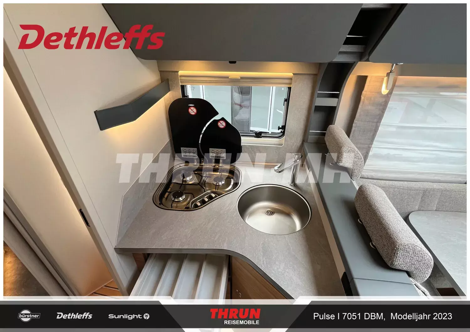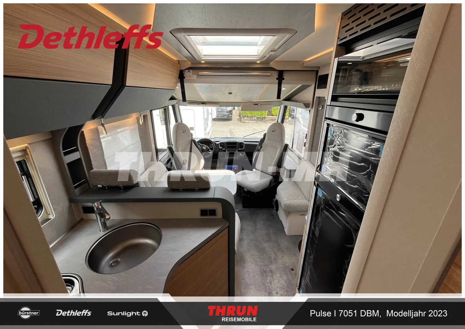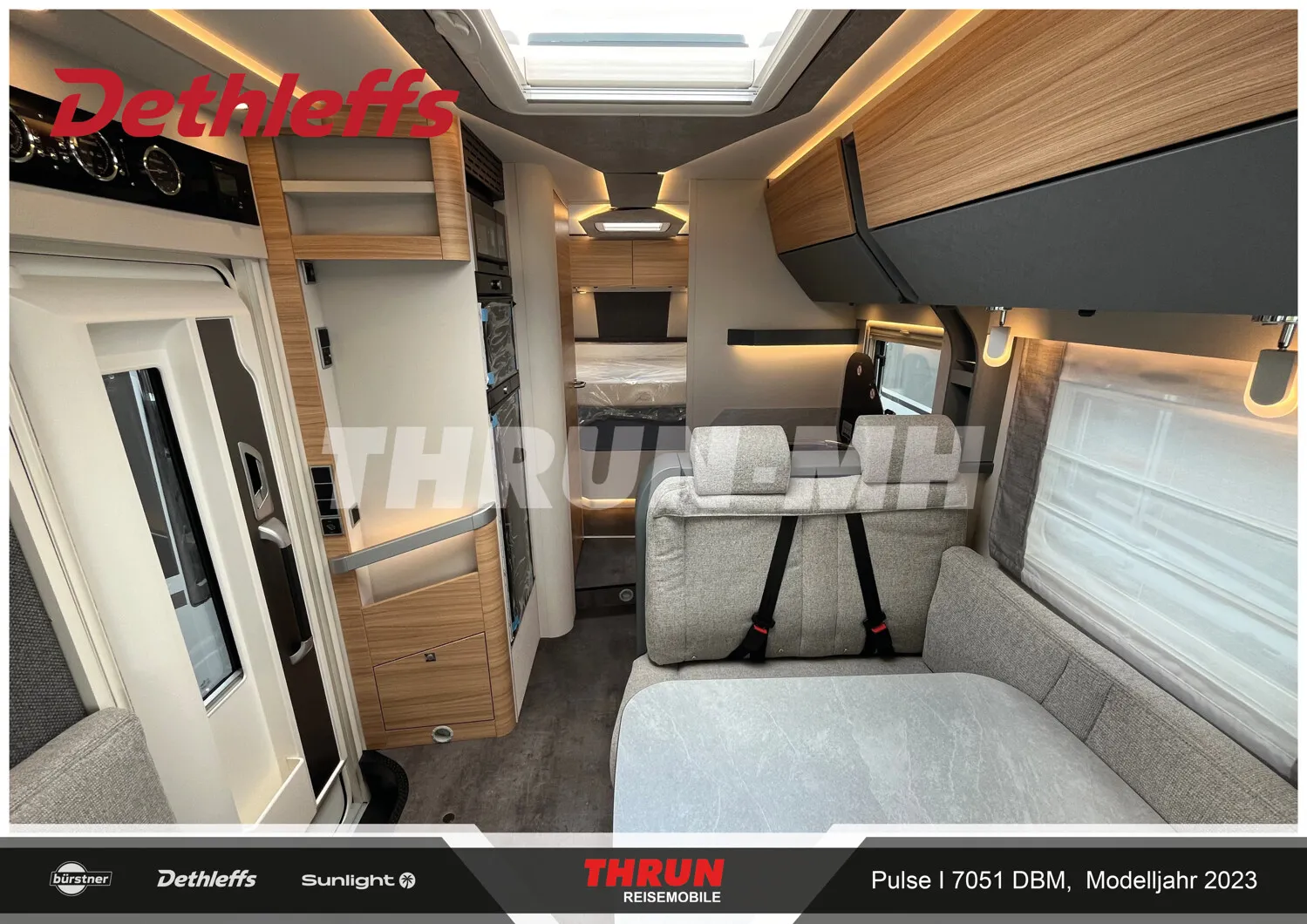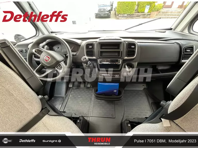 - Pulse GT Paket "Grey" (Elektrische Feststellbremse, Lederlenkrad und Schaltknauf mit Ledermanschette, Armaturenbrett mit Aluminium Applikation, Fahrerhaus Klimaanlage automatisch, Wohnraumtür mit Fenster inkl. Verdunkelung und Zentralverriegelung (inkl. Fahrerhaustüre), Bord-Control-Panel Luxus, Fahrerhaustüre links, Panorama-Dachhaube 75x105 cm inkl. beleuchtetem Baldachin im Wohnraum, Indirekte Ambientebeleuchtung über den Dachstauschränken, Radioantenne DAB+ auf dem Dach montiert, Vorbereitung für Radiosystem inkl. Soundpaket im Fahrerhaus, LED Tagfahrlicht, Steckdosen und Schalter in Bicolor, Doppelverglaste Rahmenfenster mit Verdunklung & Mückenschutz, Außendesign GT Grey (Lackierung I-Front teilweise schwarz, erweiterte Beklebung GT Grey, Skidplate "rot"), Dieseltank 90 Liter inkl. 19L AdBlue Tank, Lenkrad mit Bedienelementen, Alufelgen Dethleffs 16 Zoll)