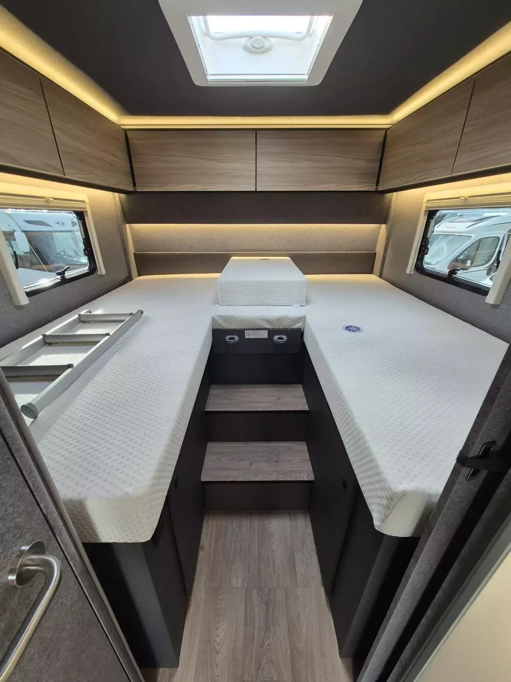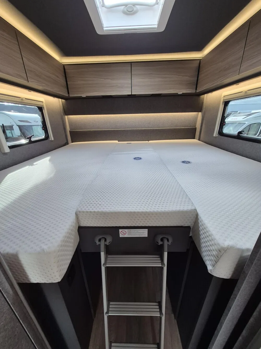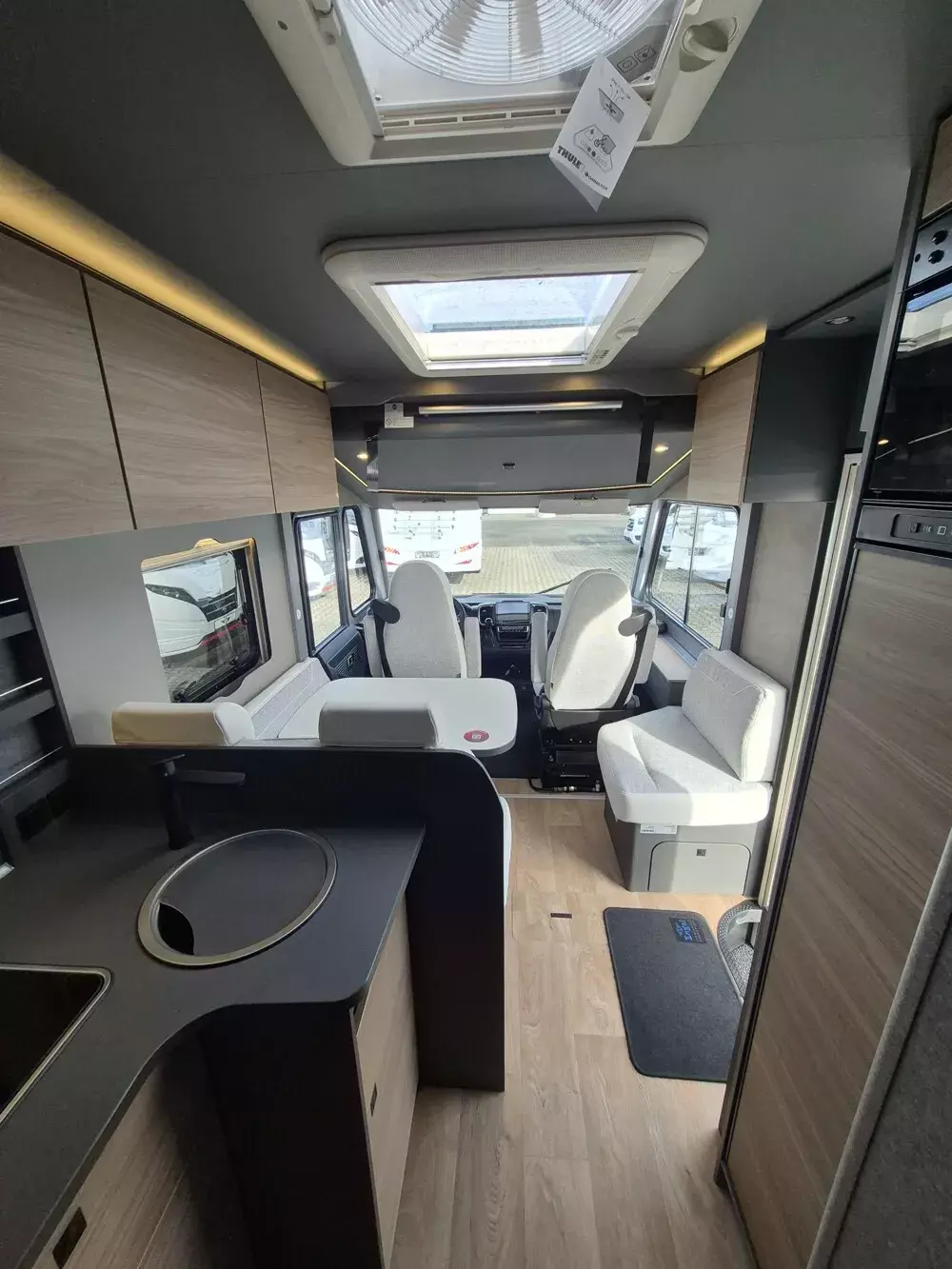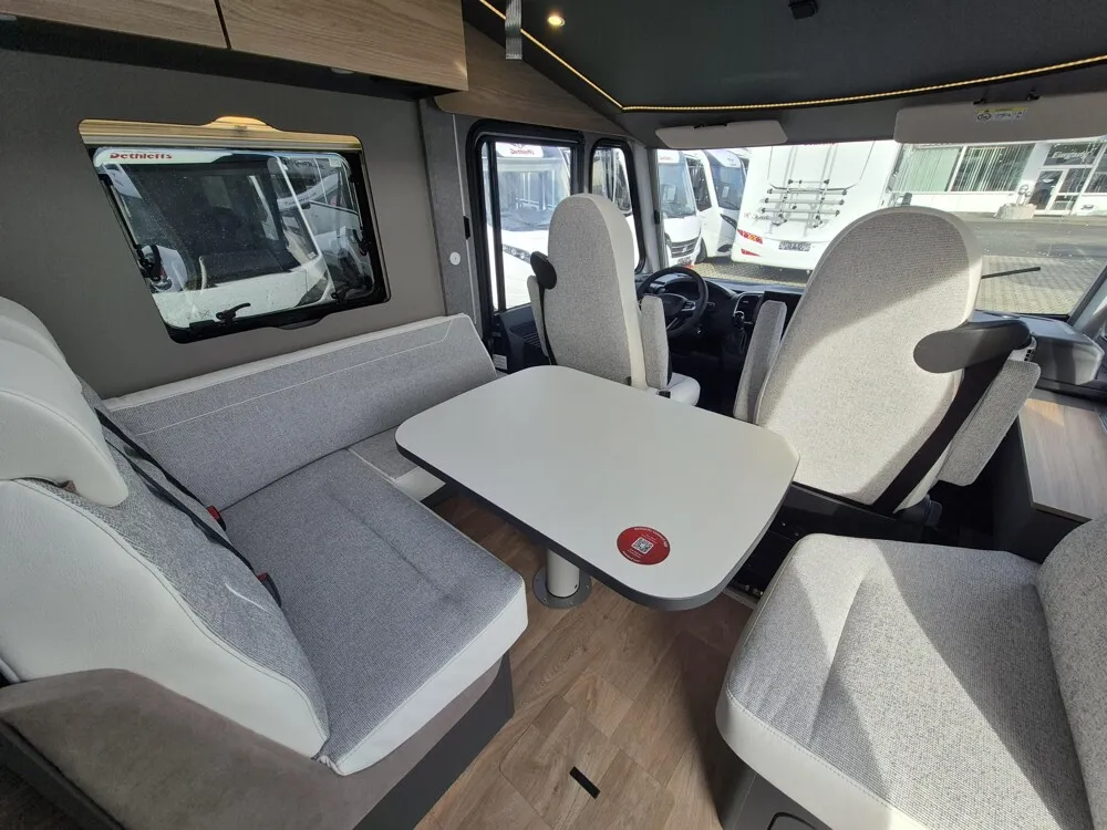 - Active-Paket I 6817, 7057 EB (Wohnraumtür mit Fenster inkl. Verdunkelung und Zentralverriegelung (inkl. Fahrerhaustür), Light Moments: Indirekte Ambientebeleuchtung über den Dachstauschränken, Light Moments: Indirekte Wandflächen-Ambientebeleuchtung, Light Moments: Küchenrückwand beleuchtet, Light Moments: Indirekte Beleuchtung im Badezimmer mit beleuchteter Duschkonsole, Vorbereitung für Radiosystem inkl. Soundpaket im Fahrerhaus, Radioantenne DAB+ auf dem Dach montiert, Light Moments: Eingangsmodul mit indirekter Beleuchtung, Light Moments: Verkleidete Sitztruhenwange mit indirekter Beleuchtung, Gemütliche L-Sitzgruppe mit freistehendem, absenkbarem Tischfuß und 2 integrierte 3-Punkt-Gurte, Bettumbau Einzelbetten zu Doppelbett, Außendesign GT (Heckleuchtenträger mit schwarzem Diffusor, erweiterte Beklebung, Skidplate "rot"), Integrierte Einlinsen Rückfahrkamera, Vorbereitung SAT-Anlage, Vorbereitung Dach-Klimaanlage, Vorbereitung Solar, Duschrost, Dethleffs Naviceiver inkl. DAB+, Truck Navigation, Wireless Apple CarPlay und Android Auto, Textilleder-Wohnwelt Heron, Fenster im Badezimmer)