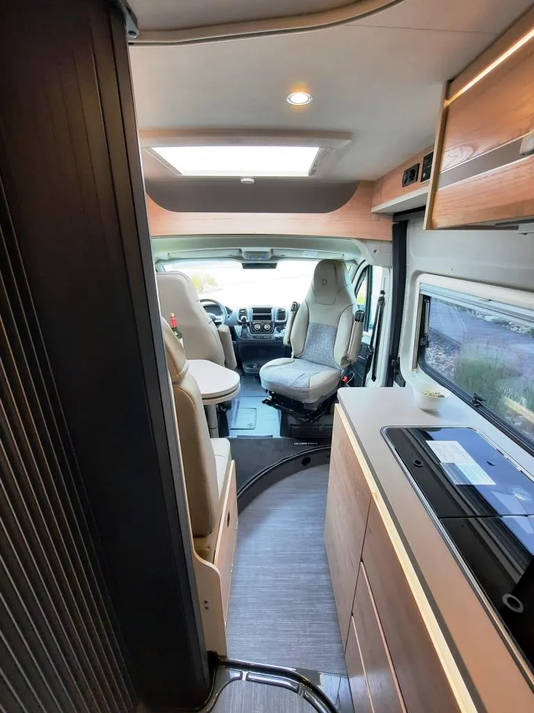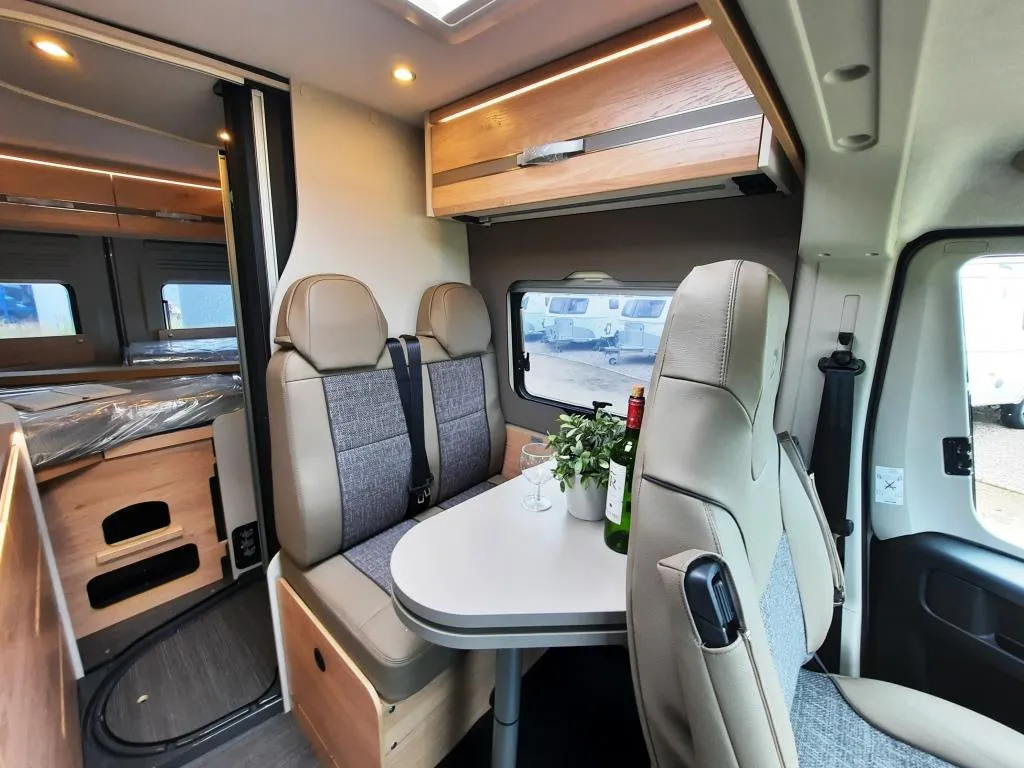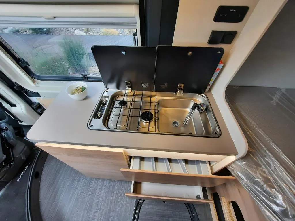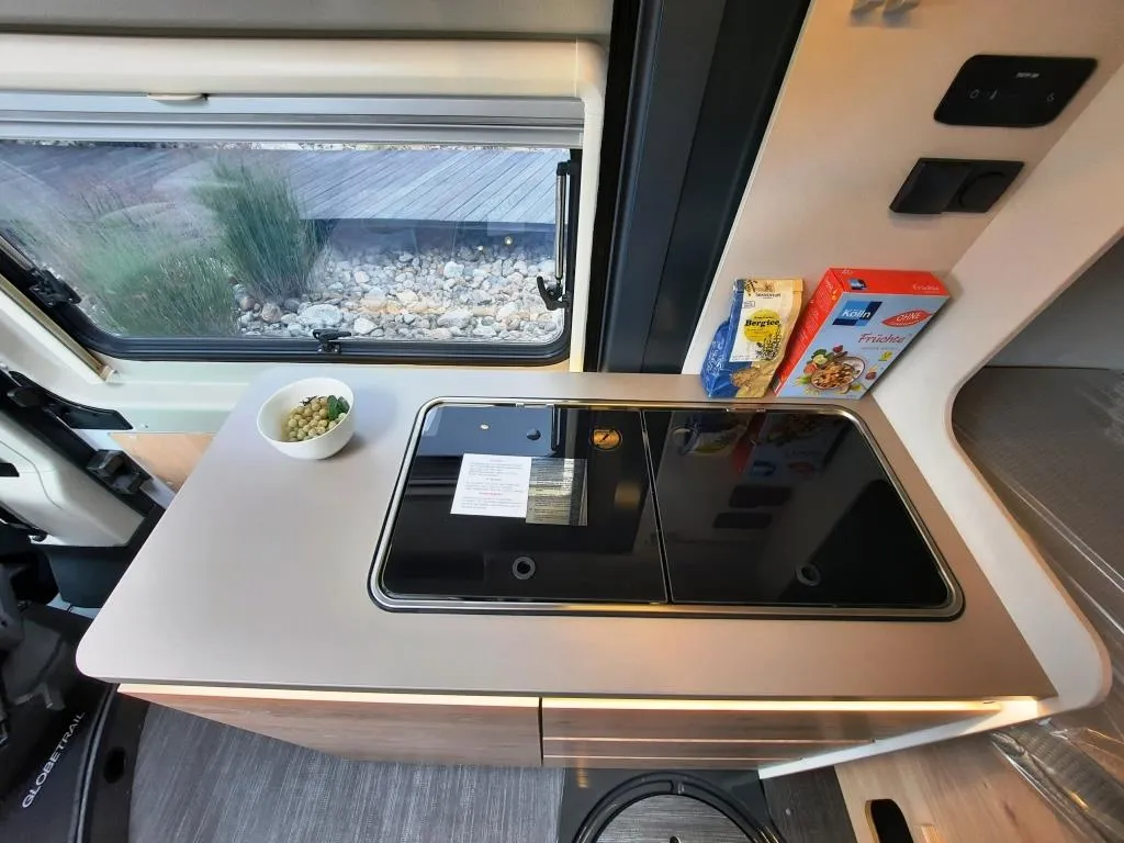 - Elektro-Paket (LED-Lichtröhre in der Küche, Zusätzliche Doppel-USB-Steckdose im Bug links, 230-V-Steckdose im Oberschrank Bug links (Sitzgruppe), indirekte Beleuchtung, 12-V-Steckdose im Heckbereich links unten, Vorbereitung Solarmodule)