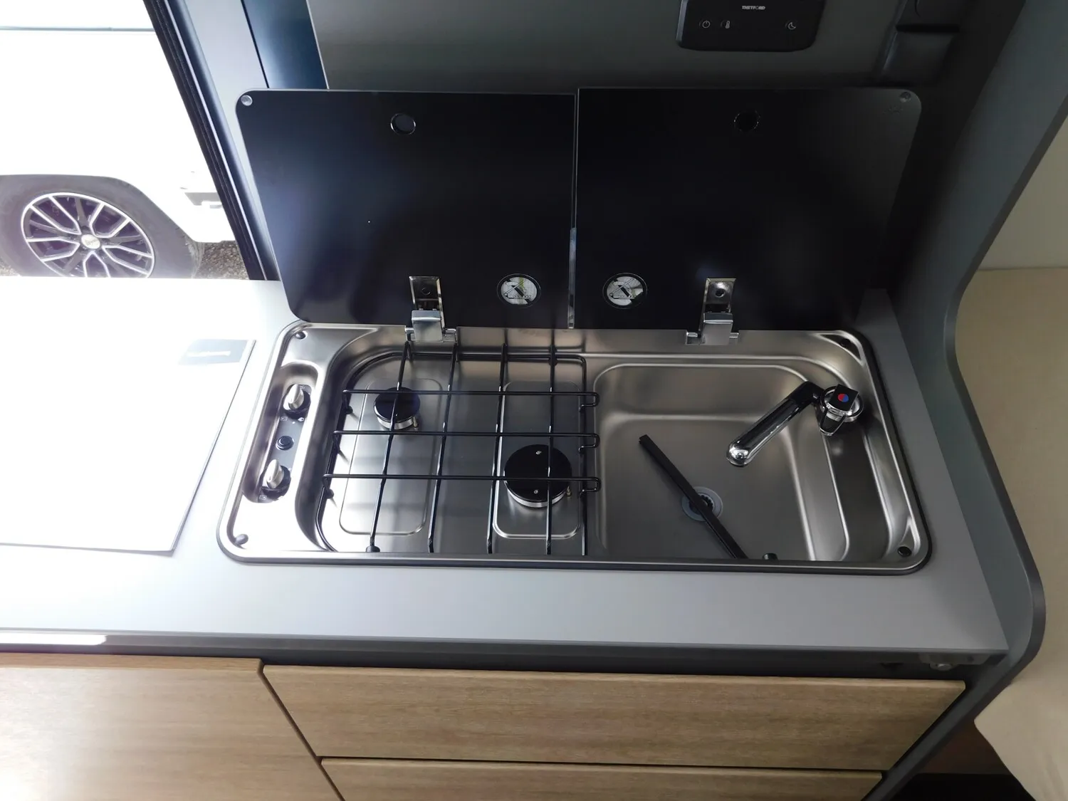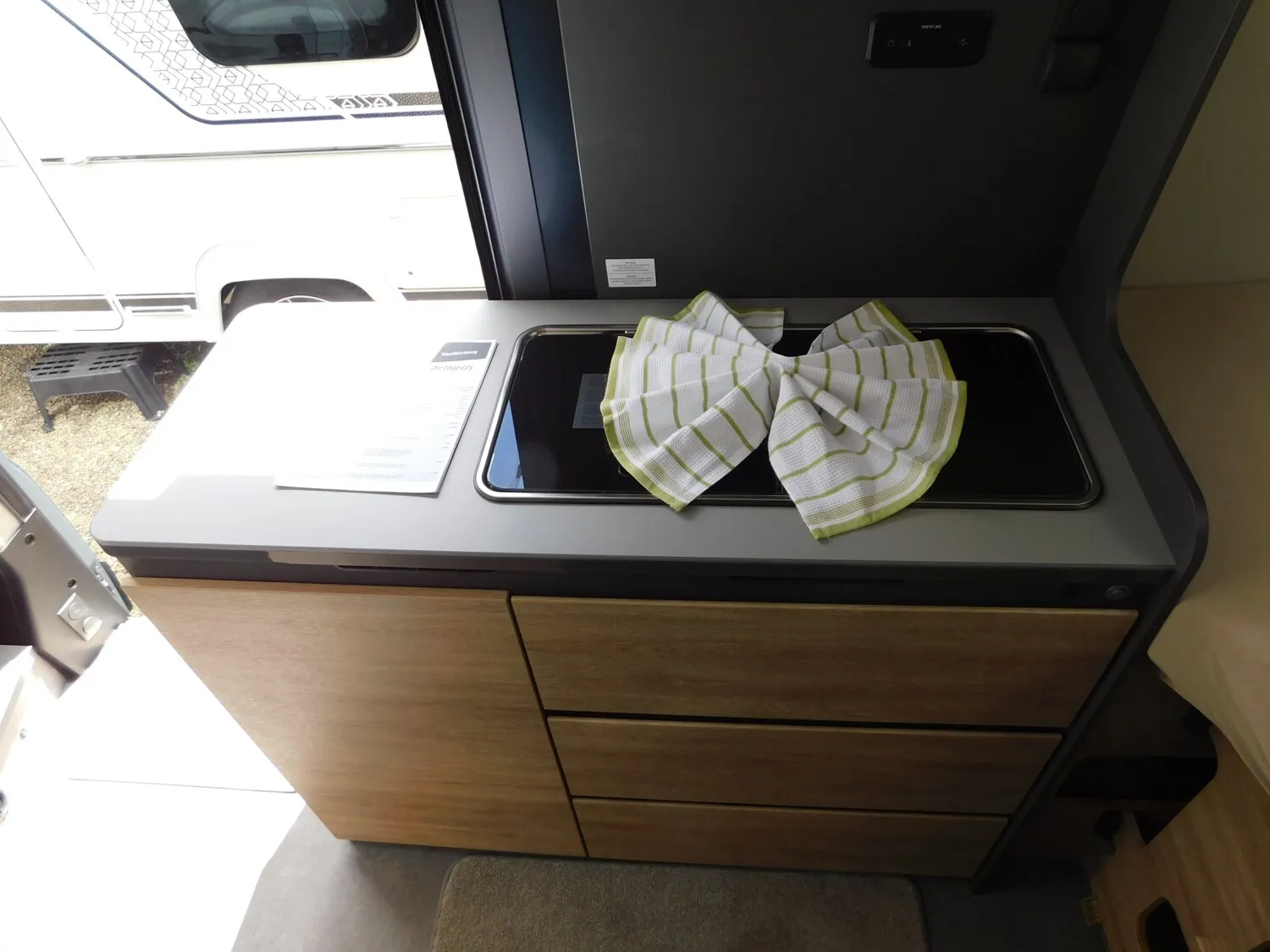 - Elektro Paket (Zusätzliche Doppel-USB-Steckdose im Bug links, 12-V-Steckdose im Heckbereich links unten, 230-V-Steckdose im Oberschrank Bug links (Sitzgruppe), Indirekte Beleuchtung, LED-Lichtröhre in der Küche, Vorbereitung Solarmodule)