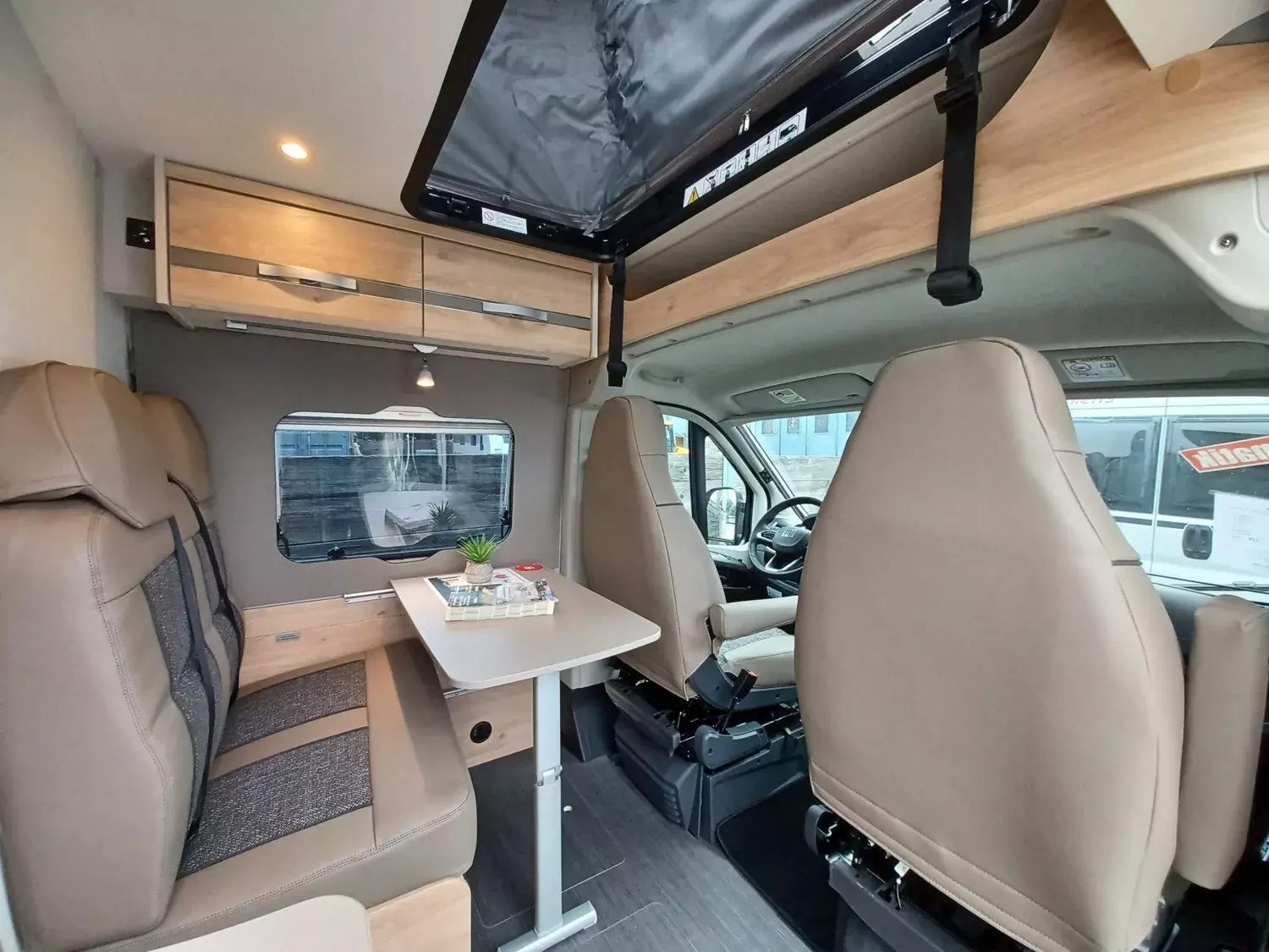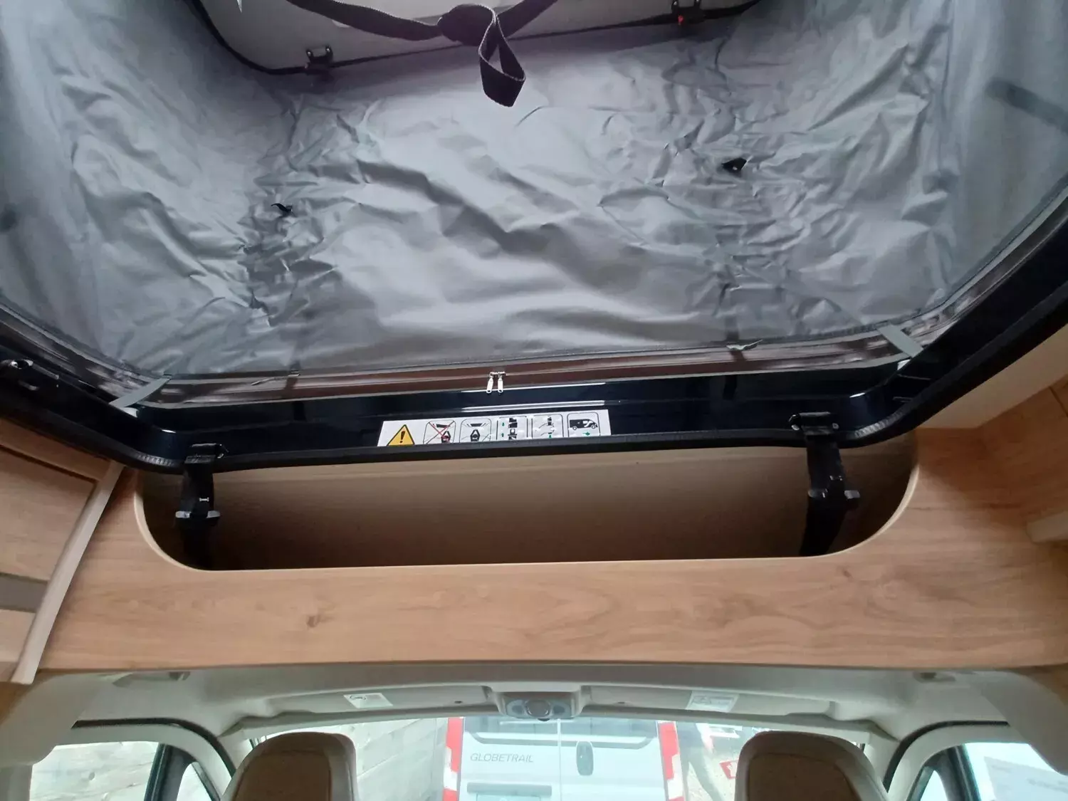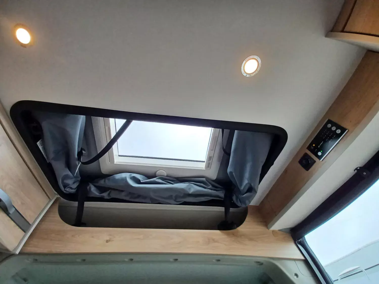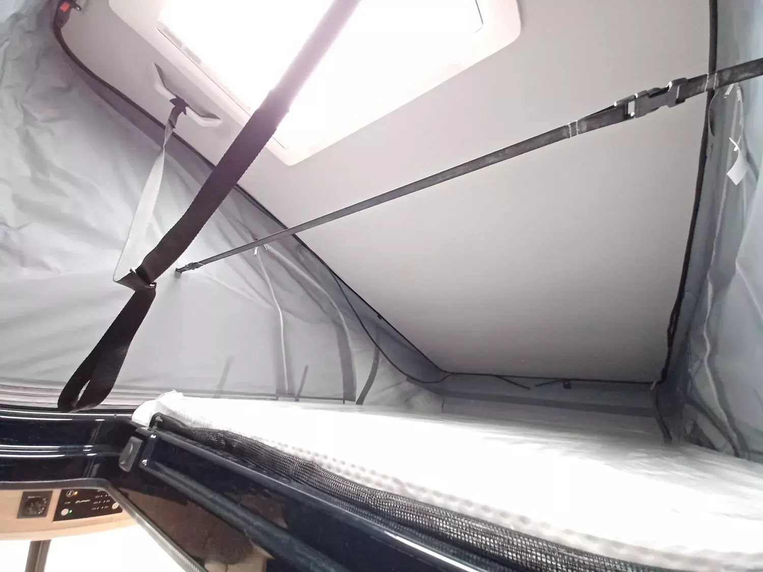 - Aufstelldach schwarz, vorne komplett zu öffnen inkl. elektrischem Schließassistenten, Fliegengitter, Schwanenhalsleuchte und USB-Steckdose, mit hochwertiger Matratze