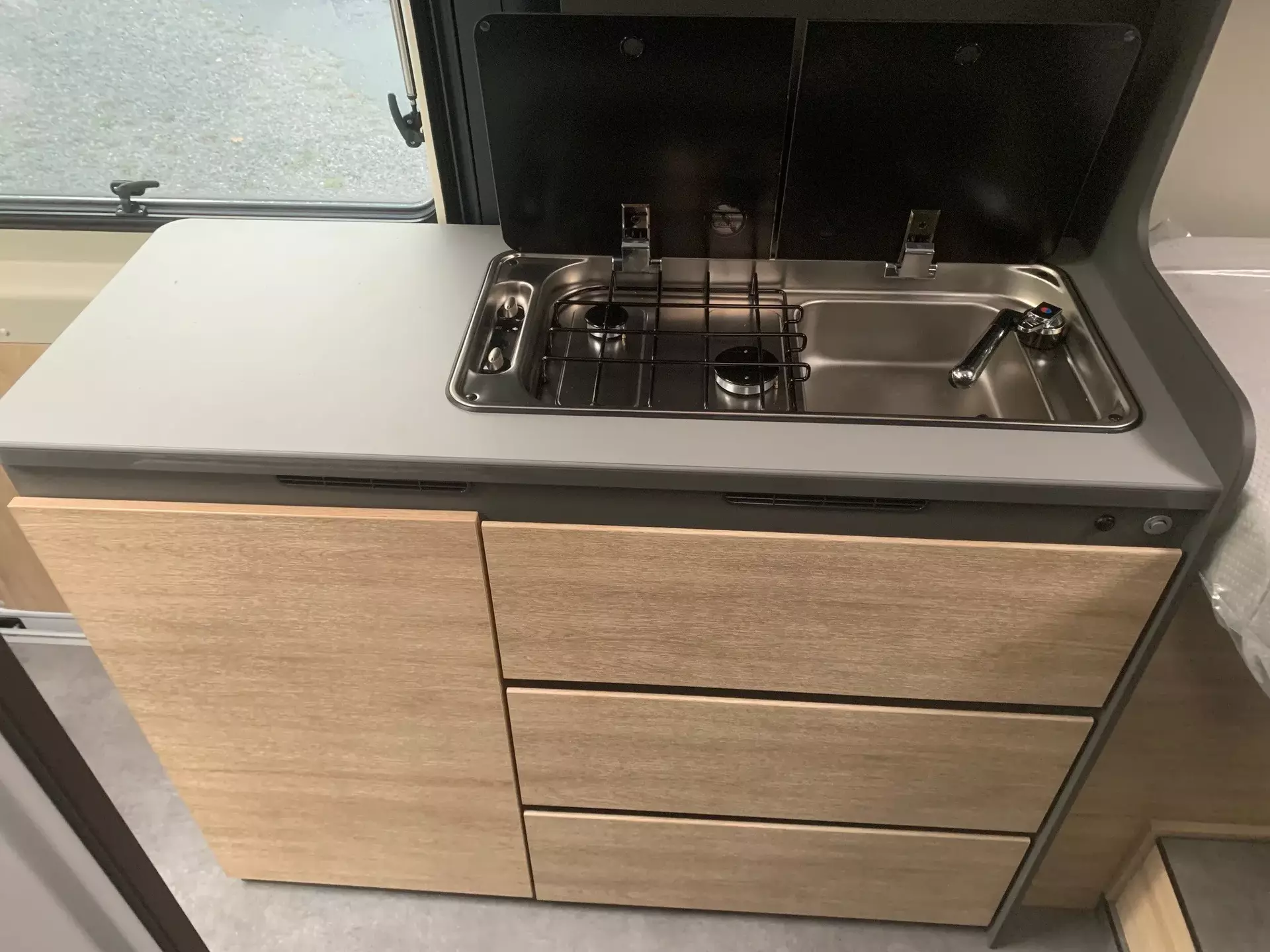 - Elektro Paket (Zusätzliche Doppel-USB-Steckdose im Bug links, 12-V-Steckdose im Heckbereich links unten, 230-V-Steckdose im Oberschrank Bug links (Sitzgruppe), Indirekte Beleuchtung, LED-Lichtröhre in der Küche, Vorbereitung Solarmodule)