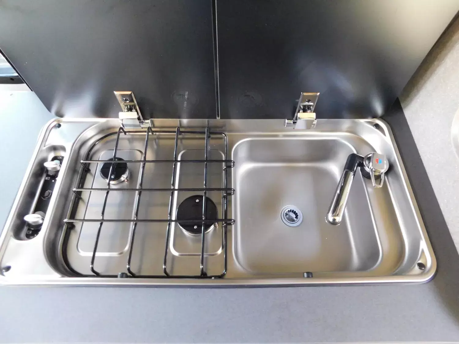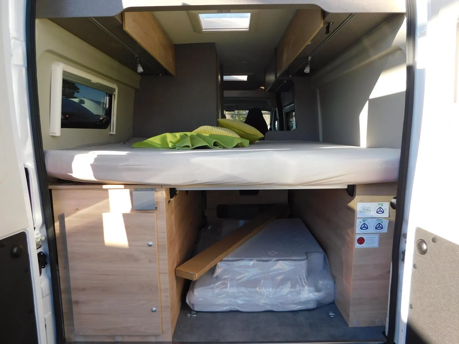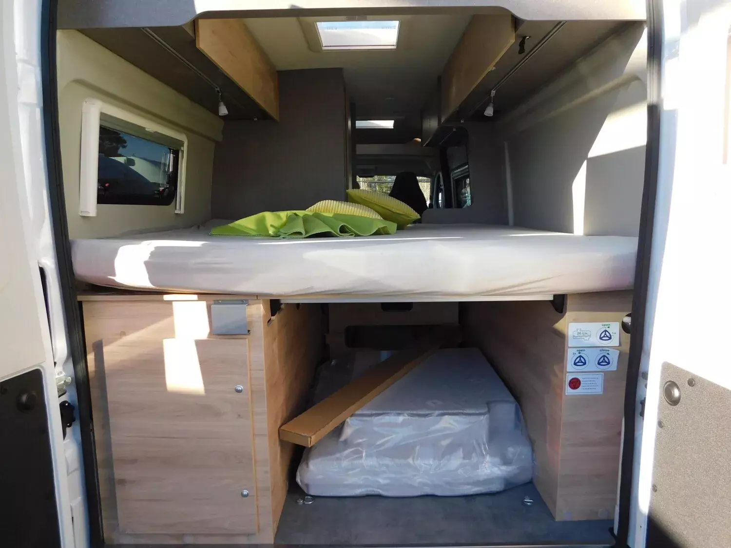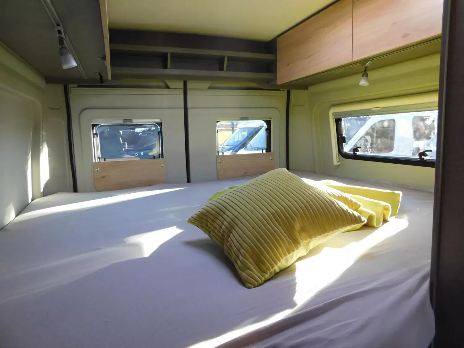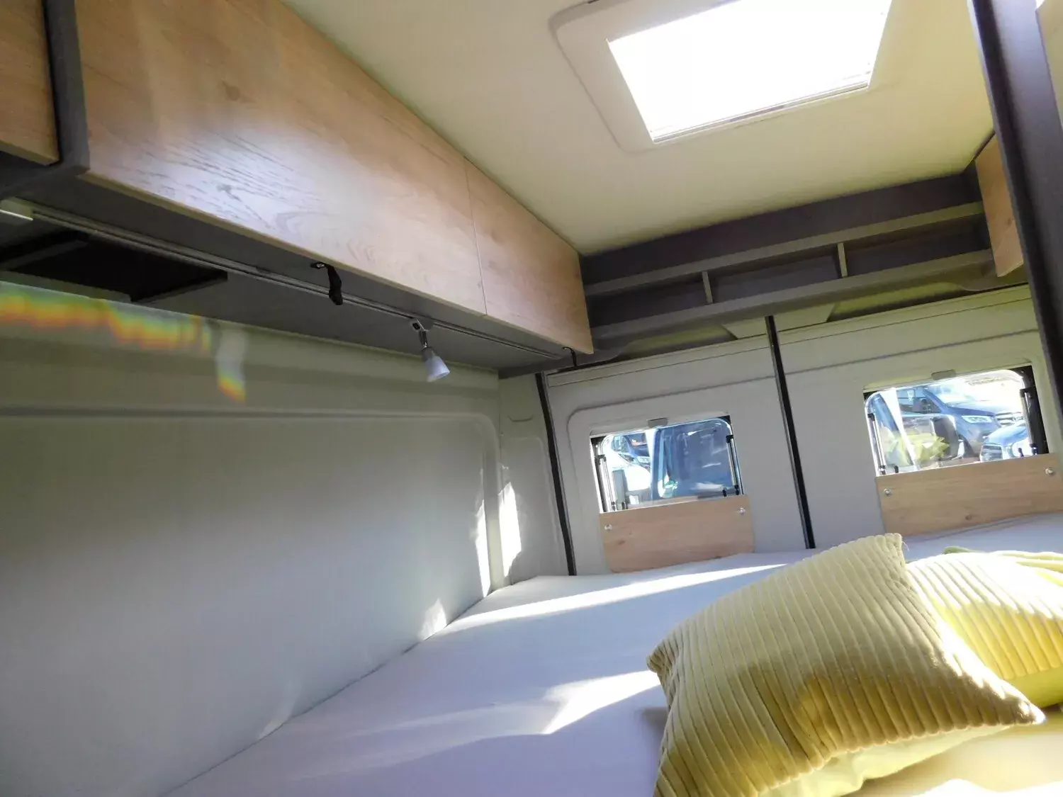 - Fenster mit Fliegenschutz und Verdunklungsrollo im Heck links