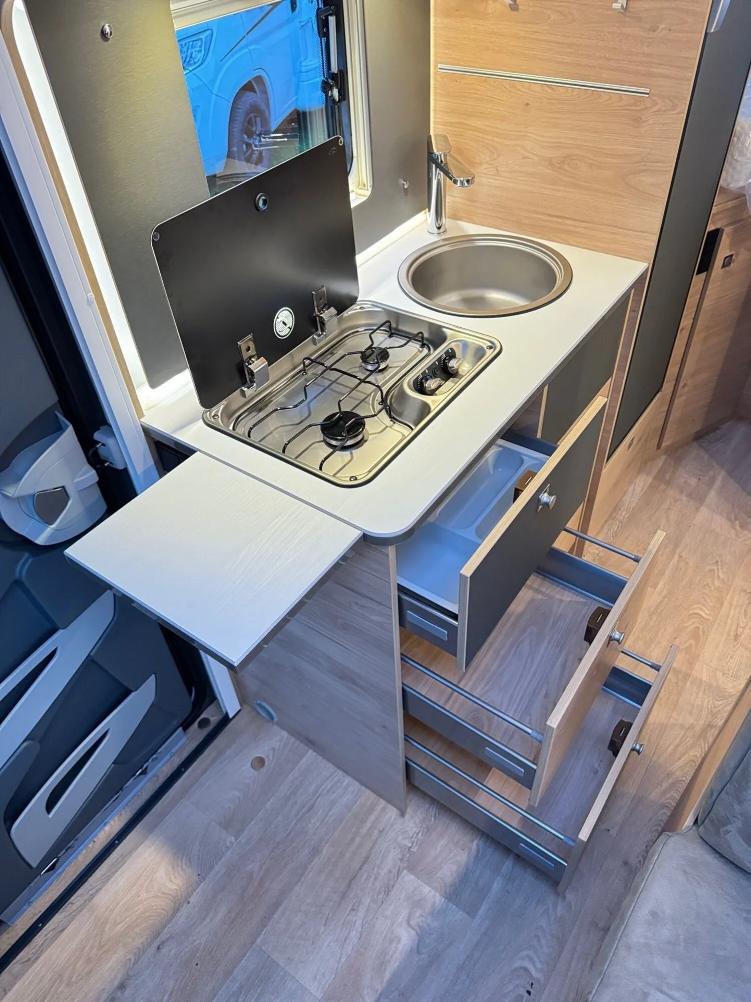 - Active-Paket T4 (Verdunklungsjalousien im Fahrerhaus, Wohnraumtür mit Fenster inkl. Verdunkelung und Zentralverriegelung (inkl. Fahrerhaustür), Panorama-Dachhaube 70 x 50 cm im Wohnraum, Küchenrückwand, Light Moments: Küchenrückwand beleuchtet, Light Moments: Fensterverkleidung im Wohnraum beleuchtet, Light Moments: Indirekte Ambientebeleuchtung über den Dachstauschränken, Light Moments: Indirekte Wandflächen-Ambientebeleuchtung, Bettumbau Einzelbetten zu Doppelbett, Fahrerhaus Klimaanlage automatisch, Digitaler Tacho mit 7"-Kombiinstrument und Wireless Phone Charger in der Mittelkonsole, Voll LED Frontscheinwerfer, Elektrische Feststellbremse, Rückfahrkamera (Einfachkamera), Dethleffs Naviceiver inkl. DAB+, Truck Navigation, Wireless Apple CarPlay und Android Auto, Doppelverglaste Rahmenfenster mit Verdunklung & Mückenschutz, Raumhoher Kompressor Kühlschrank mit separatem Frosterfach (131 l), Duschrost, Digitales Bedienelement für Warmluftheizung, Vorbereitung Solar, Vorbereitung Dach-Klimaanlage, Vorbereitung zweite Rückfahrkamera, Vorbereitung SAT-Anlage, Wohnwelt Jupiter, Active Außendesign (Heckleuchtenträger mit schwarzem Diffusor, erweiterte Beklebung, Skidplate "rot"), Sitzgruppe mit Gurtbank inkl. zwei 3-Punkt-Gurten und einhängbarem und erweiterbarem Tisch, Stauraum-Türe links, Dachmarkise Omnistor 4.0 m (manuell), Abwassertank isoliert)
