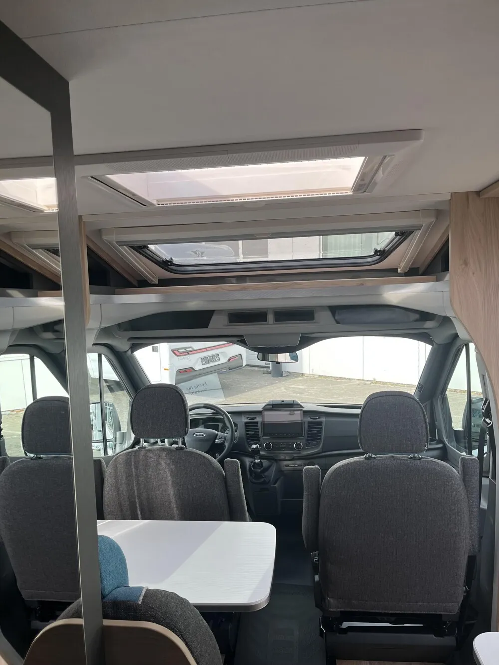 - Comfort Paket T 15 (Klimaanlage inkl. Staub- und Pollenfilter, Handschuhfach mit Deckel, abschließbar, Innenraumpaket Trend-Line, Seitenschutzleisten in Wagenfarbe lackiert, Stoßfänger vorn in Wagenfarbe lackiert, Nebelscheinwerfer, Scheinwerfer mit statischem Abbiegelicht, Außenspiegel elektrisch einstellbar und beheizbar, Alufelge Ford 16 Zoll, schwarz, Frontscheibe, beheizbar, Scheibenwischer mit Regensensor, Notbrems-Assistent, aktiv (kamerabasiert), Fahrspur-Assistent mit Müdigkeitswarner, Fernlicht-Assistent und Fahrspurhalte-Assistent, Scheinwerfer-Assistent mit Tag/Nacht-Sensor, Wohnraumtür mit Fenster inkl. Verdunkelung und Zentralverriegelung (inkl. Fahrerhaustüre), Ausstellfenster in der T-Haube, Verdunklungsjalousien im Fahrerhaus, Panorama-Dachhaube 70 x 50 cm im Wohnraum, Wohnwelt Salerno inkl. Fahrer- und Beifahrer-Sitzbezug, Light Moments: Indirekte Wandflächen-Ambientebeleuchtung, Light Moments: Indirekte Ambientebeleuchtung über den Dachstauschränken, Stauraum-Türe links)