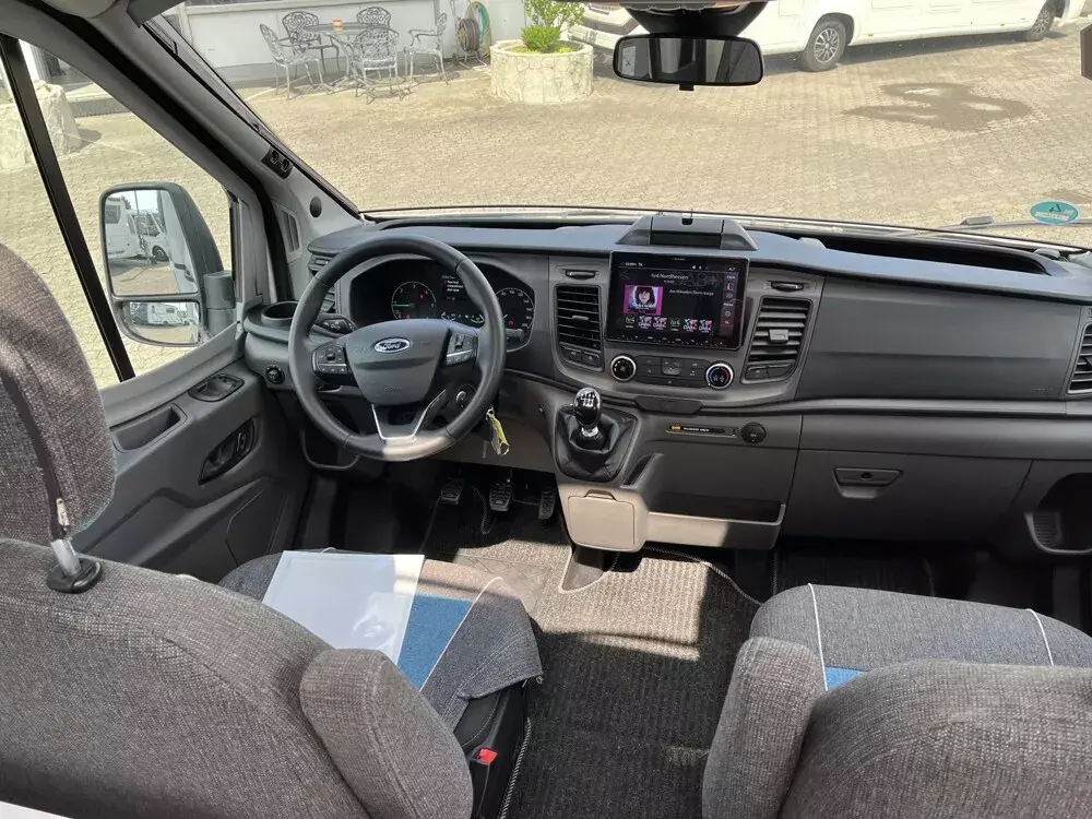 - Comfort Paket T 45 (Klimaanlage inkl. Staub- und Pollenfilter, Handschuhfach mit Deckel, abschließbar, Innenraumpaket Trend-Line, Seitenschutzleisten in Wagenfarbe lackiert, Stoßfänger vorn in Wagenfarbe lackiert, Nebelscheinwerfer, Scheinwerfer mit statischem Abbiegelicht, Außenspiegel elektrisch einstellbar und beheizbar, Alufelge Ford 16 Zoll, schwarz, Frontscheibe, beheizbar, Scheibenwischer mit Regensensor, Notbrems-Assistent, aktiv (kamerabasiert), Fahrspur-Assistent mit Müdigkeitswarner, Fernlicht-Assistent und Fahrspurhalte-Assistent, Scheinwerfer-Assistent mit Tag/Nacht-Sensor, Wohnraumtür mit Fenster inkl. Verdunkelung und Zentralverriegelung (inkl. Fahrerhaustüre), Ausstellfenster in der T-Haube, Verdunklungsjalousien im Fahrerhaus, Panorama-Dachhaube 70 x 50 cm im Wohnraum, Wohnwelt Salerno inkl. Fahrer- und Beifahrer-Sitzbezug, Light Moments: Indirekte Wandflächen-Ambientebeleuchtung, Light Moments: Indirekte Ambientebeleuchtung über den Dachstauschränken, Stauraum-Türe links, Bettumbau Einzelbetten zu Doppelbett)