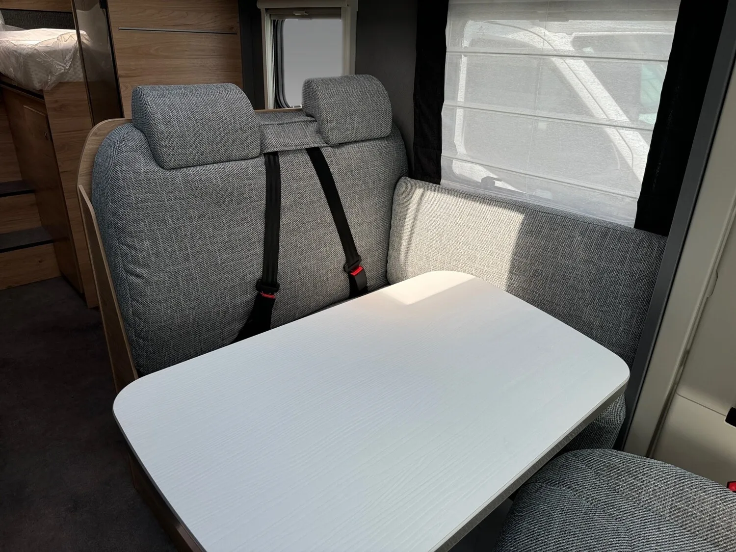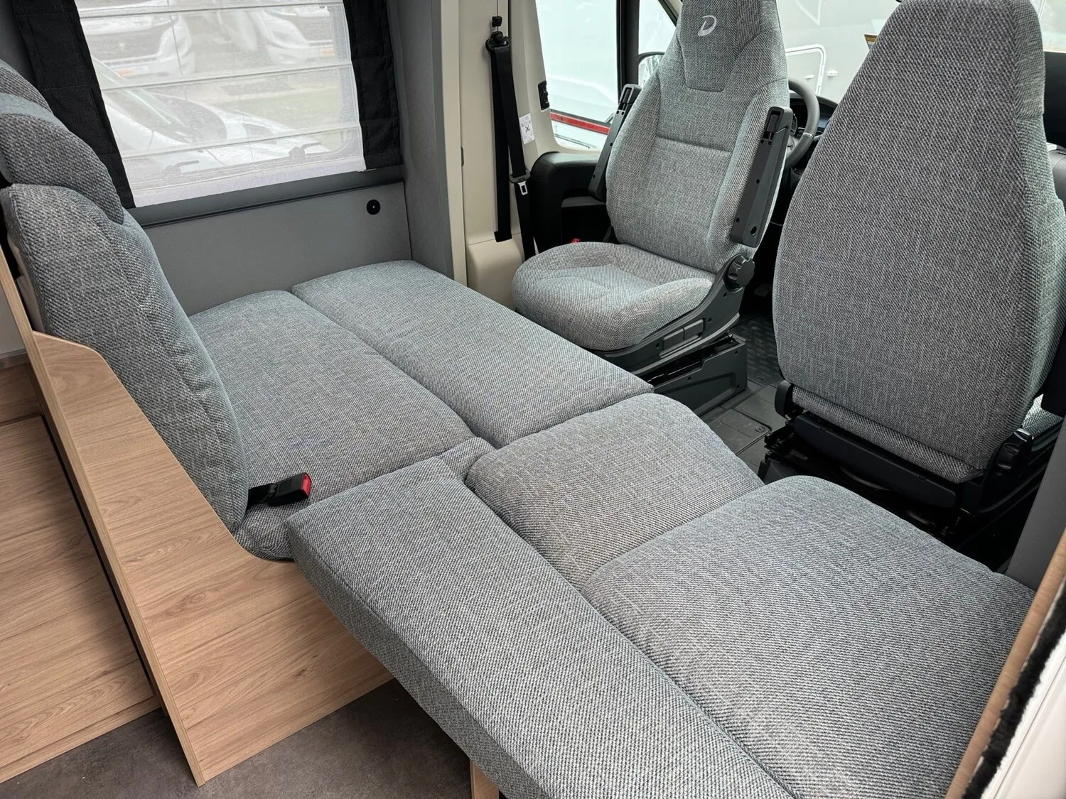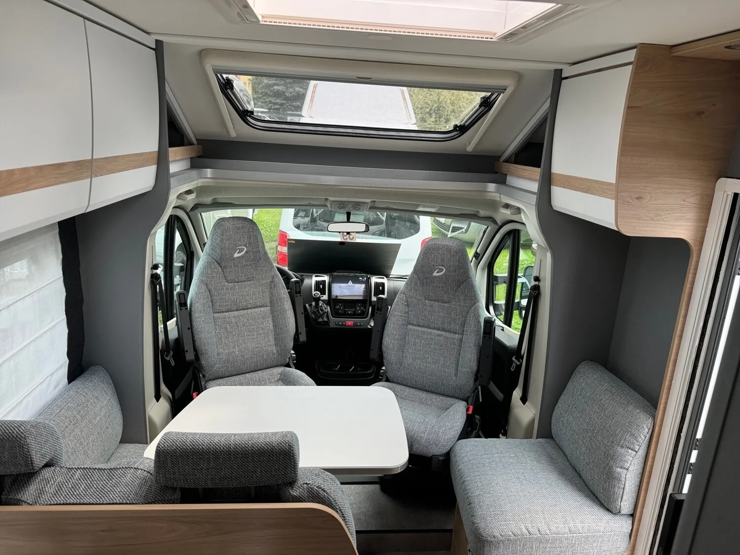 - Family-Paket T 6812, 7052 EB (Ausstellfenster in der T-Haube, Wohnraumtür mit Fenster inkl. Verdunkelung und Zentralverriegelung (inkl. Fahrerhaustüre), Verdunklungsjalousien im Fahrerhaus, Panorama-Dachhaube 70 x 50 cm im Wohnraum, Light Moments: Indirekte Ambientebeleuchtung über den Dachstauschränken, Light Moments: Indirekte Wandflächen-Ambientebeleuchtung, Bettumbau Einzelbetten zu Doppelbett, Gemütliche L-Sitzgruppe mit freistehendem, absenkbarem Tischfuß und 2 integrierte 3-Punkt-Gurte, Stauraum-Türe links)