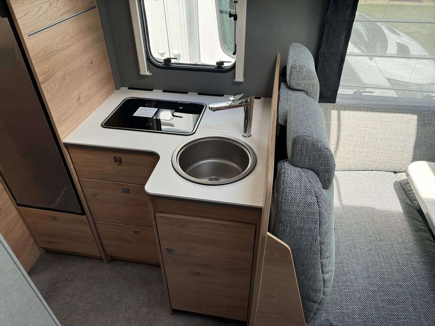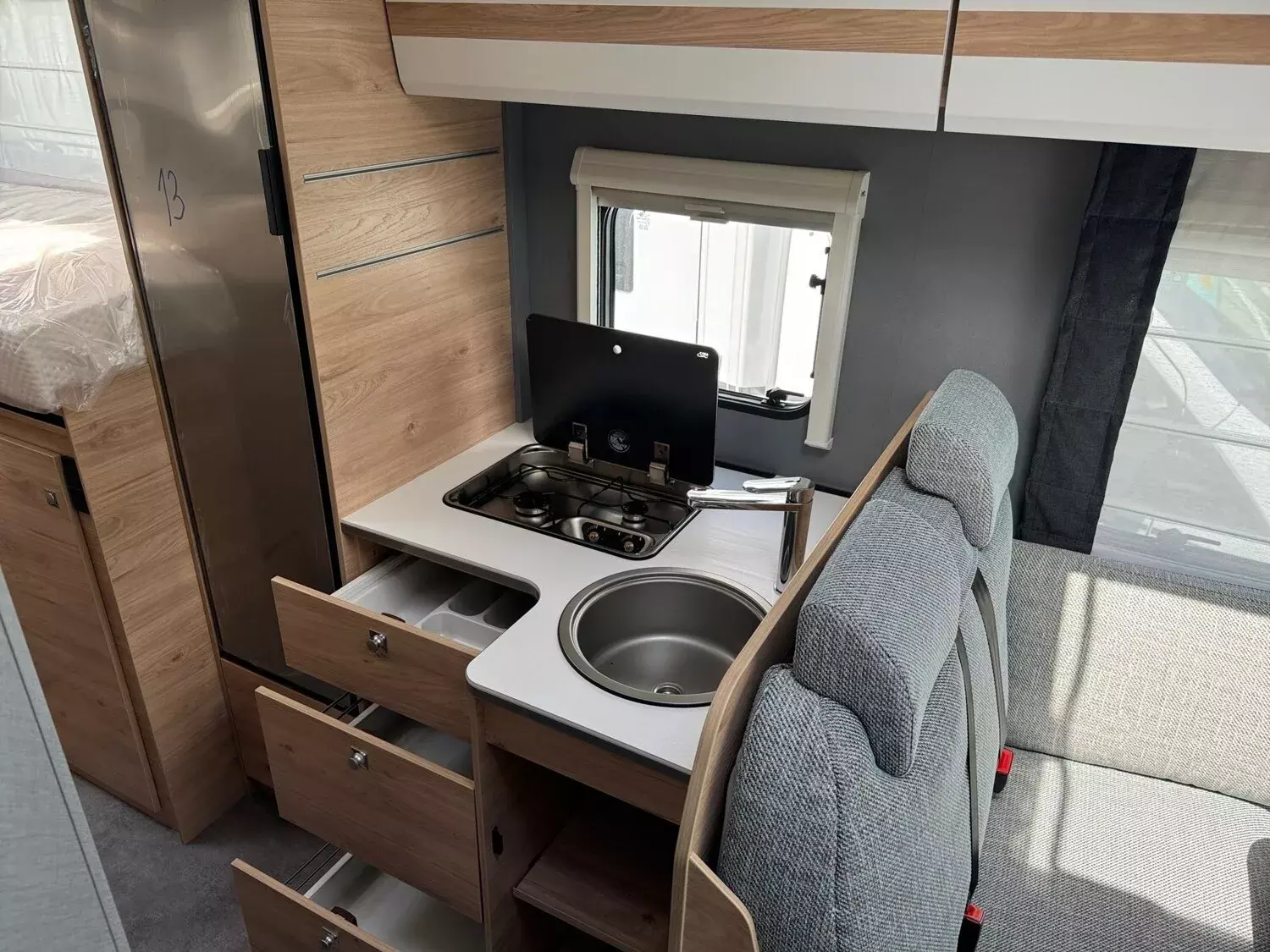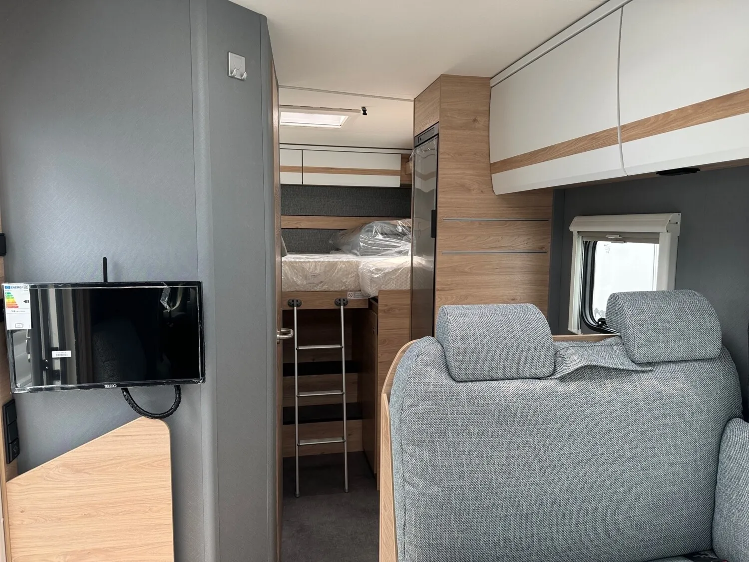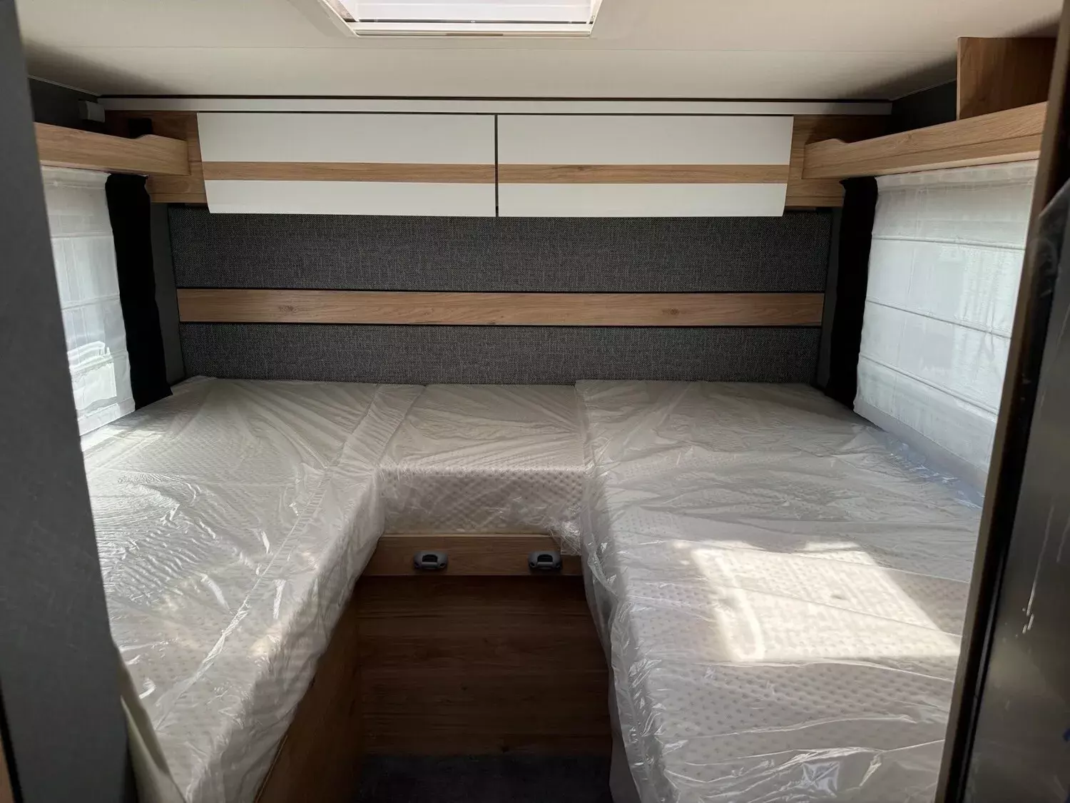 - Family-Paket T 6812, 7052 EB (Ausstellfenster in der T-Haube, Wohnraumtür mit Fenster inkl. Verdunkelung und Zentralverriegelung (inkl. Fahrerhaustüre), Verdunklungsjalousien im Fahrerhaus, Panorama-Dachhaube 70 x 50 cm im Wohnraum, Light Moments: Indirekte Ambientebeleuchtung über den Dachstauschränken, Light Moments: Indirekte Wandflächen-Ambientebeleuchtung, Bettumbau Einzelbetten zu Doppelbett, Gemütliche L-Sitzgruppe mit freistehendem, absenkbarem Tischfuß und 2 integrierte 3-Punkt-Gurte, Stauraum-Türe links)