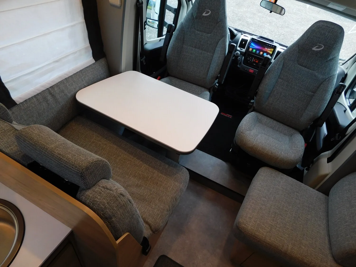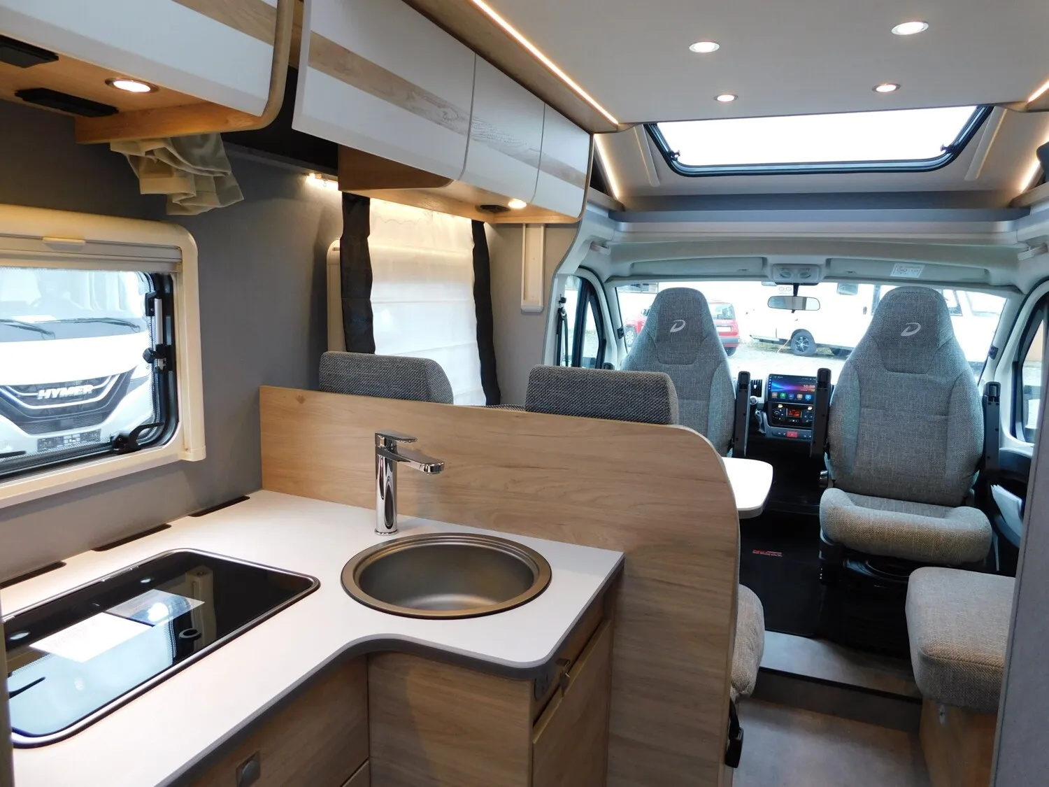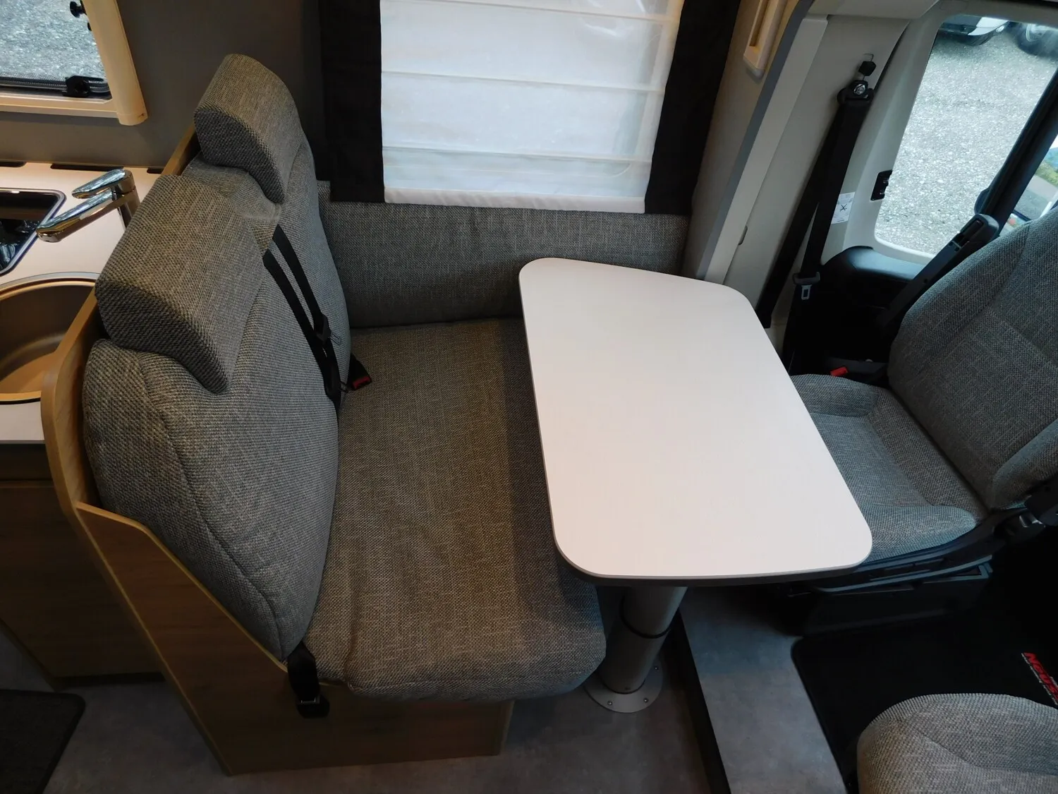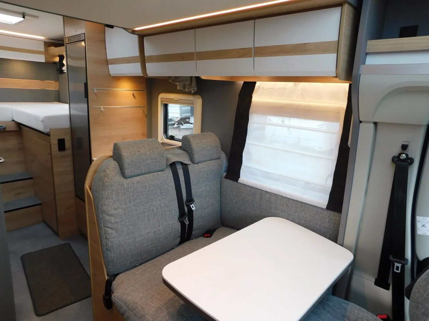 - Family-Paket (Ausstellfenster in der T-Haube, Wohnraumtür mit Fenster inkl. Verdunkelung und Zentralverriegelung (inkl. Fahrerhaustüre), Verdunklungsjalousien im Fahrerhaus, Panorama-Dachhaube 70 x 50 cm im Wohnraum, Indirekte Ambientebeleuchtung über den Dachstauschränken, Indirekte Wandflächen-Ambientebeleuchtung, Bettumbau Einzelbetten zu Doppelbett, Gemütliche L-Sitzgruppe mit freistehendem, absenkbarem Tischfuß und 2 integrierte 3-Punkt-Gurte, Stauraum-Türe links)