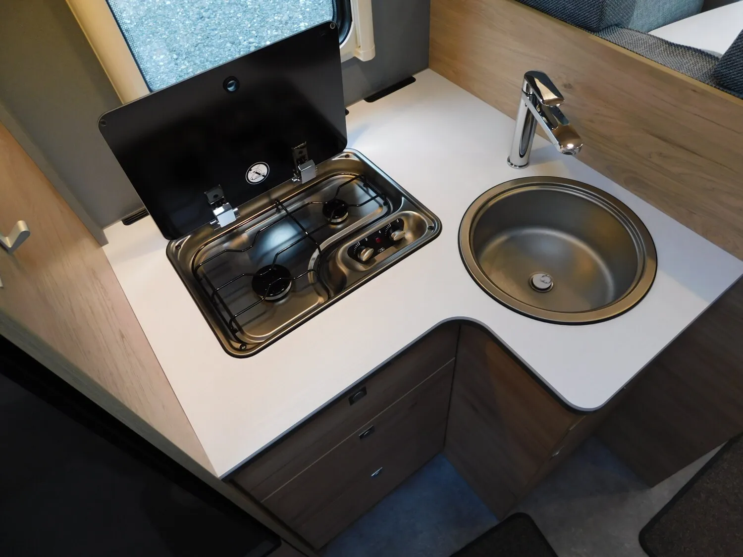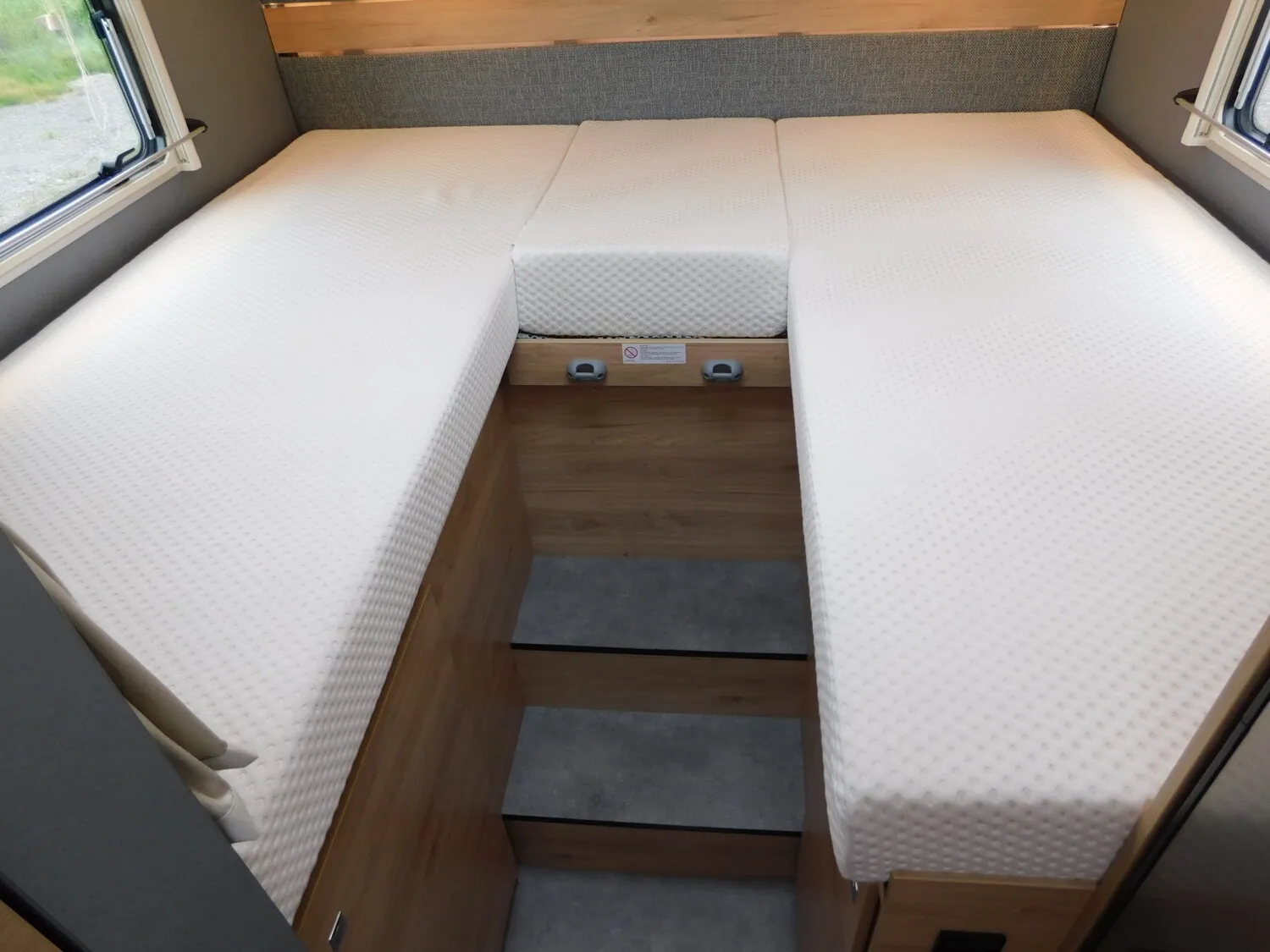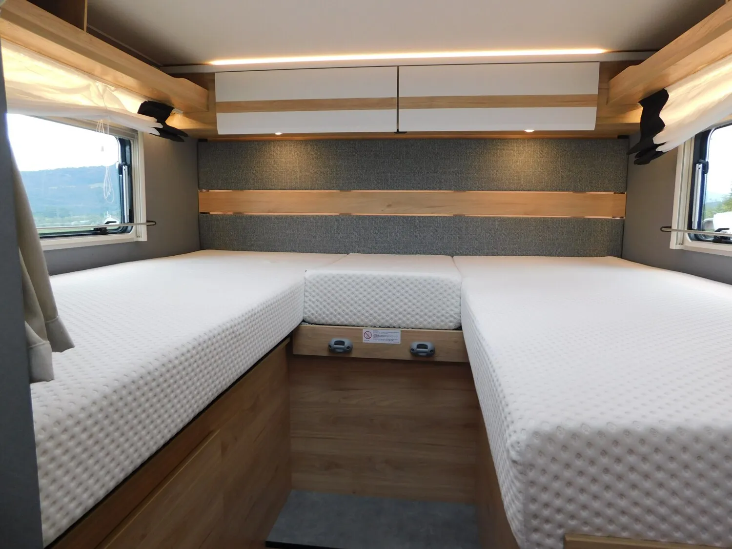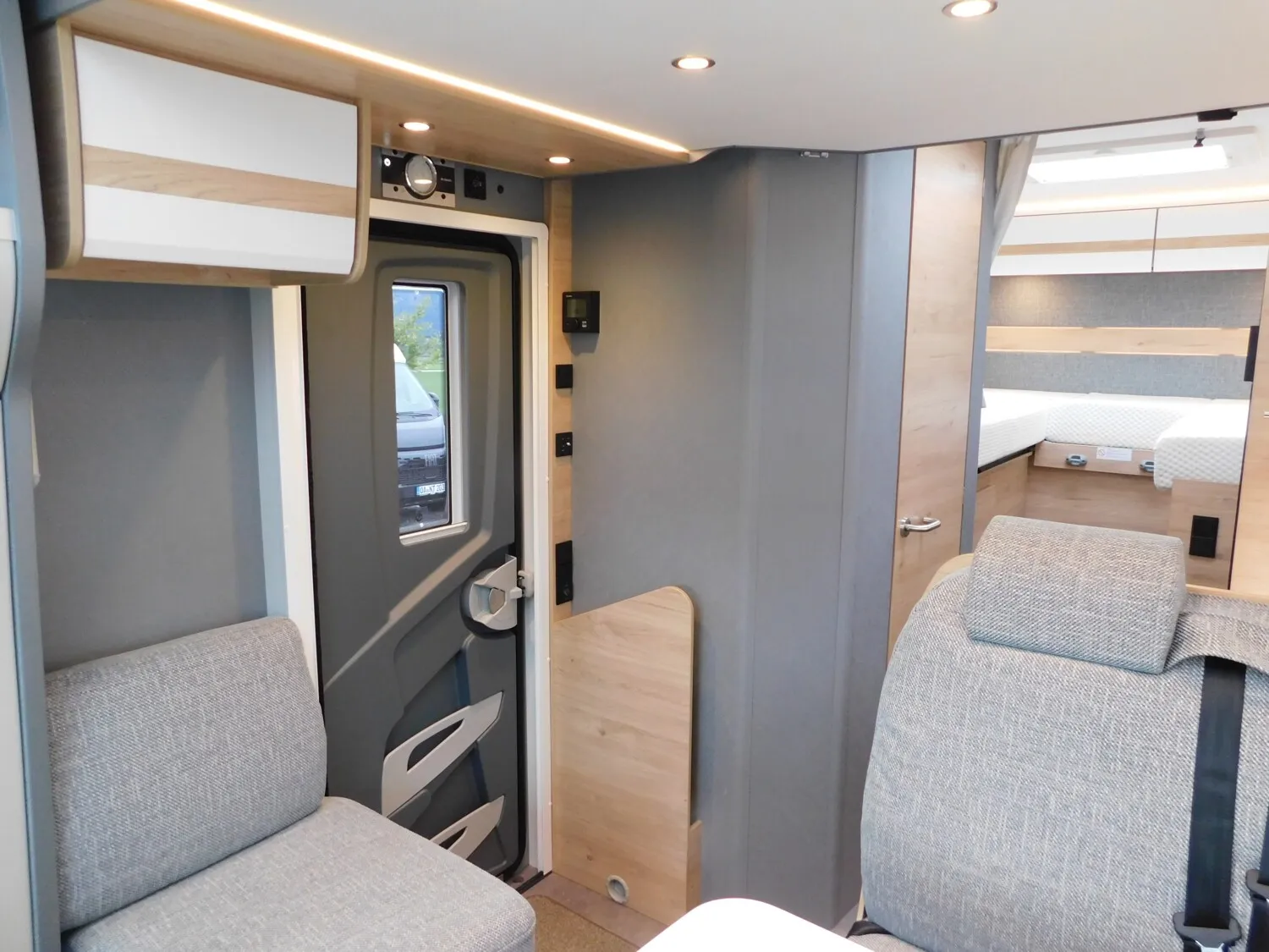 - Family-Paket (Ausstellfenster in der T-Haube, Wohnraumtür mit Fenster inkl. Verdunkelung und Zentralverriegelung (inkl. Fahrerhaustüre), Verdunklungsjalousien im Fahrerhaus, Panorama-Dachhaube 70 x 50 cm im Wohnraum, Indirekte Ambientebeleuchtung über den Dachstauschränken, Indirekte Wandflächen-Ambientebeleuchtung, Bettumbau Einzelbetten zu Doppelbett, Gemütliche L-Sitzgruppe mit freistehendem, absenkbarem Tischfuß und 2 integrierte 3-Punkt-Gurte, Stauraum-Türe links)
