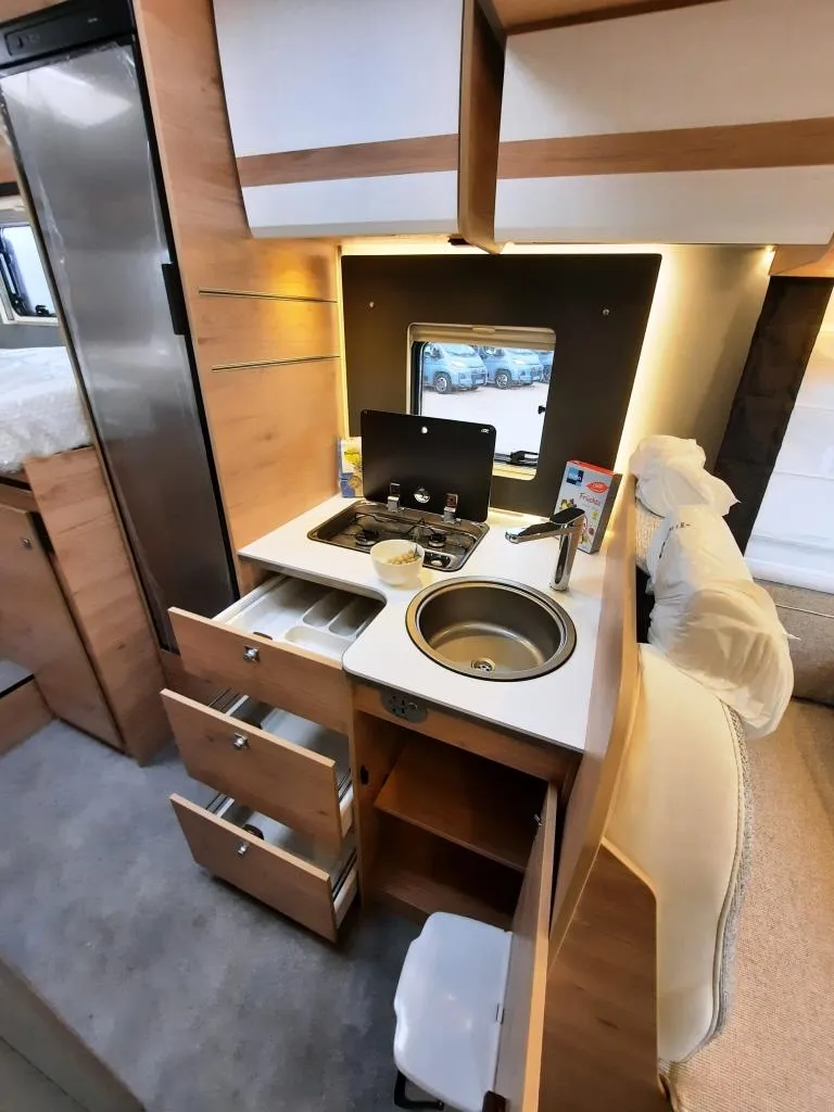 Alufelgen 16 Zoll mit Ganzjahresreifen, Fahrer- und Beifahrerairbag, ABS, EBD, Dieseltank 90L, ESP inkl. ASR, Traction+, Hill Holder und Hill Descent Control, , Tempomat, Nebelscheinwerfer, Pilotensitze, Seitenwände, Heck und Dach aus GFK mit EPS Isolierung, breite Wohnraumtür, Fliegengittertür, Dachschrankklappen mit Softclose, Absorberkühlschrank, 2-Flammen-Kocher, Gaswarmluftheizung 6 kW mit Warmwasserboiler, LED-Beleuchtung im gesamten Fahrzeug, Vorzeltleuchte 12V und vielem mehr*