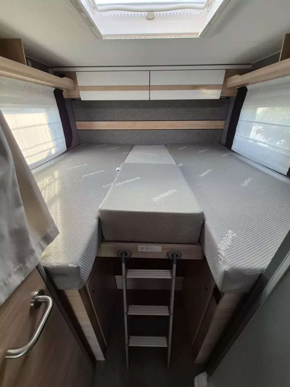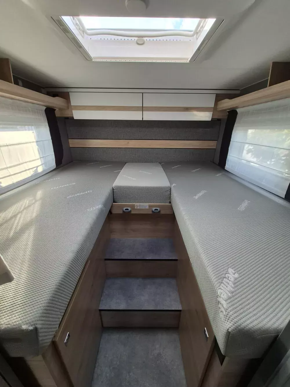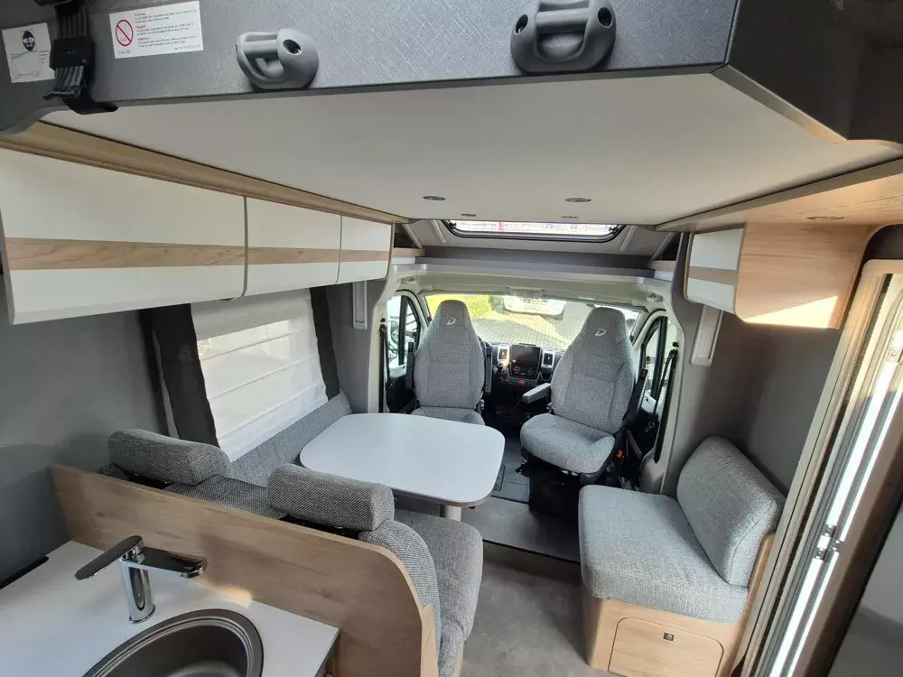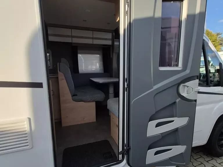 - Family-Paket T 6812, 7052 EB (Ausstellfenster in der T-Haube, Wohnraumtür mit Fenster inkl. Verdunkelung und Zentralverriegelung (inkl. Fahrerhaustüre), Verdunklungsjalousien im Fahrerhaus, Panorama-Dachhaube 70 x 50 cm im Wohnraum, Light Moments: Indirekte Ambientebeleuchtung über den Dachstauschränken, Light Moments: Indirekte Wandflächen-Ambientebeleuchtung, Bettumbau Einzelbetten zu Doppelbett, Gemütliche L-Sitzgruppe mit freistehendem, absenkbarem Tischfuß und 2 integrierte 3-Punkt-Gurte, Stauraum-Türe links)