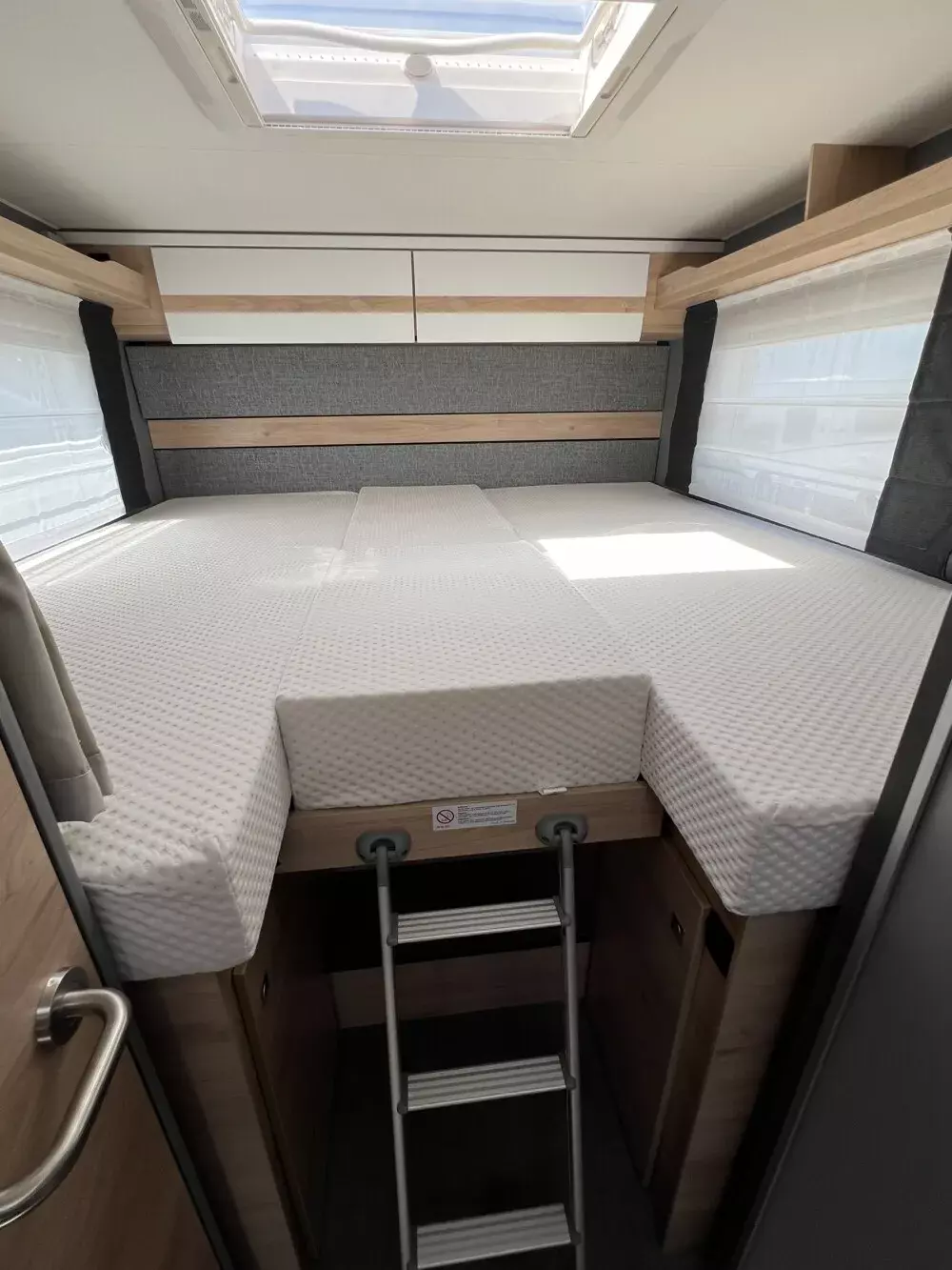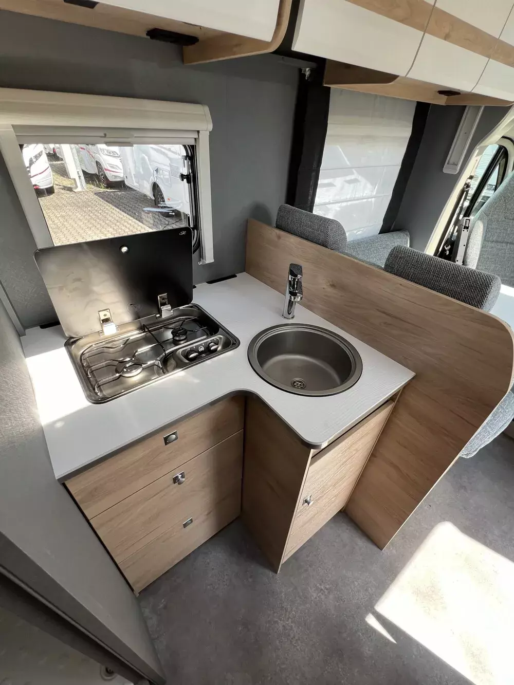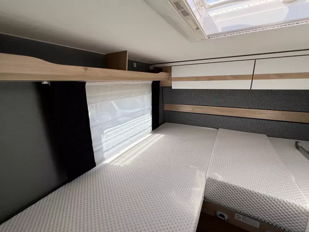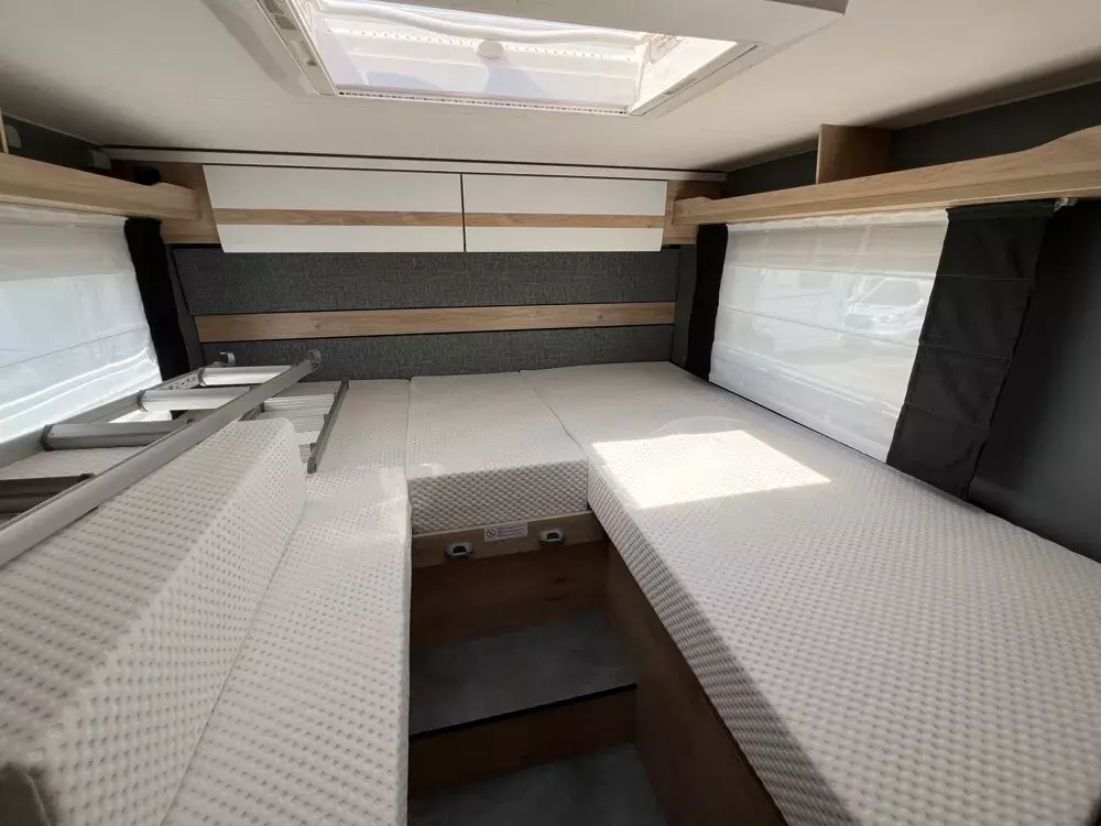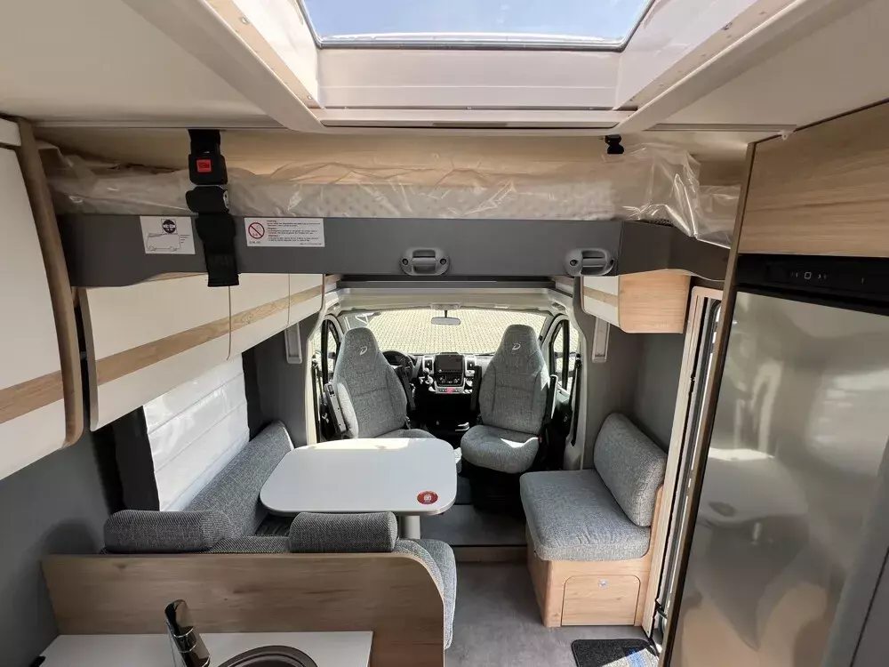 - Family-Paket T 6812, 7052 EB (Ausstellfenster in der T-Haube, Wohnraumtür mit Fenster inkl. Verdunkelung und Zentralverriegelung (inkl. Fahrerhaustüre), Verdunklungsjalousien im Fahrerhaus, Panorama-Dachhaube 70 x 50 cm im Wohnraum, Light Moments: Indirekte Ambientebeleuchtung über den Dachstauschränken, Light Moments: Indirekte Wandflächen-Ambientebeleuchtung, Bettumbau Einzelbetten zu Doppelbett, Gemütliche L-Sitzgruppe mit freistehendem, absenkbarem Tischfuß und 2 integrierte 3-Punkt-Gurte, Stauraum-Türe links)