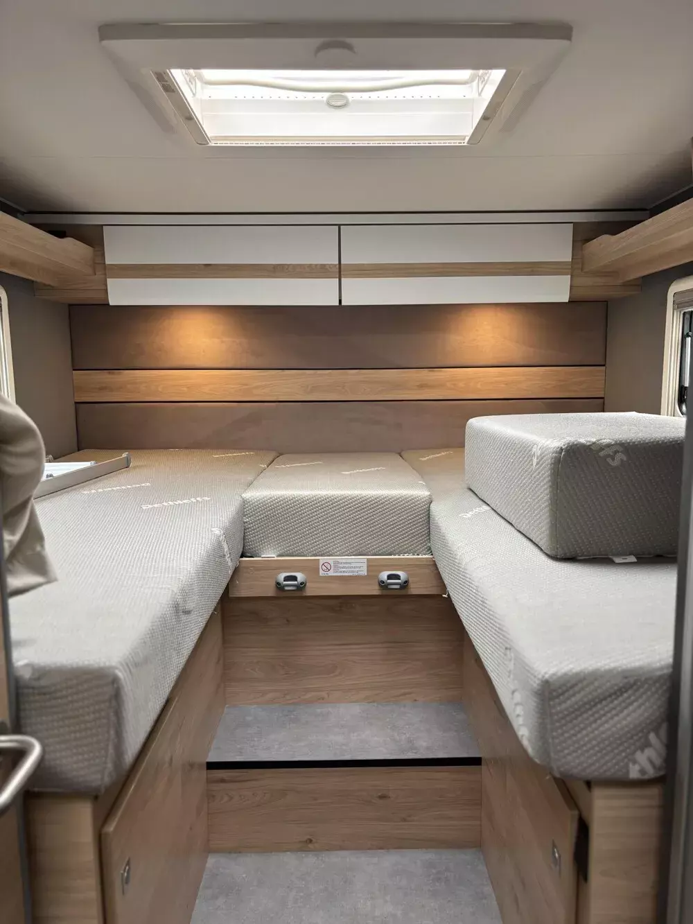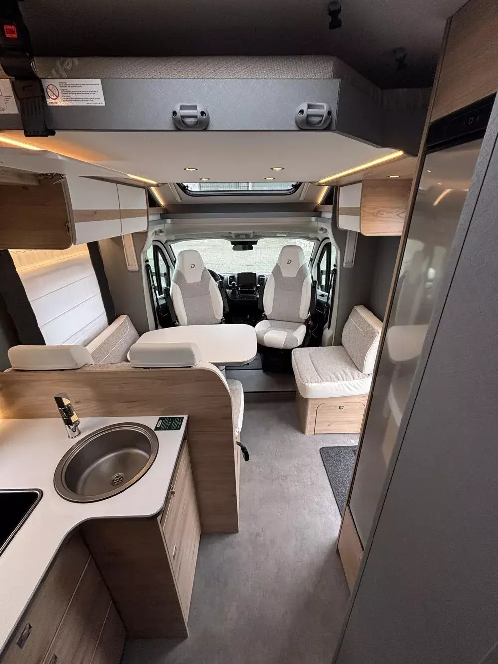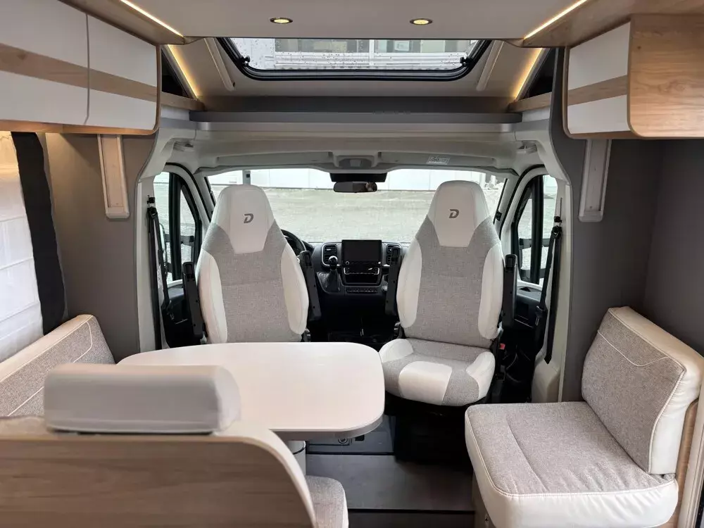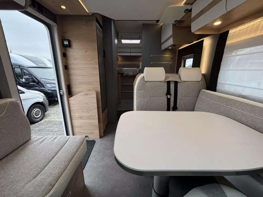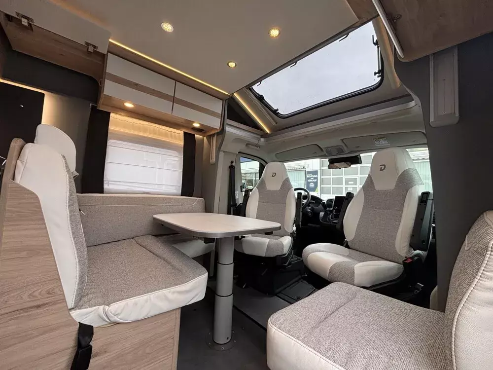 - Active-Paket T 7052 EB (Ausstellfenster in der T-Haube, Wohnraumtür mit Fenster inkl. Verdunkelung und Zentralverriegelung (inkl. Fahrerhaustür), Verdunklungsjalousien im Fahrerhaus, Panorama-Dachhaube 70 x 50 cm im Wohnraum, Light Moments: Indirekte Ambientebeleuchtung über den Dachstauschränken, Light Moments: Indirekte Wandflächen-Ambientebeleuchtung, Stauraum-Türe links, Doppelverglaste Rahmenfenster mit Verdunklung & Mückenschutz inkl. verkleidete Küchenrückwand, Textilleder-Wohnwelt Heron, Vorbereitung Solar, Light Moments: Küchenrückwand beleuchtet, Vorbereitung Dach-Klimaanlage, Digitales Bedienelement für Warmluftheizung, Dethleffs Naviceiver inkl. DAB+, Truck Navigation, Wireless Apple CarPlay und Android Auto, Rückfahrkamera (Einfachkamera), Vorbereitung SAT-Anlage, Active Außendesign (Heckleuchtenträger mit schwarzem Diffusor, erweiterte Beklebung, Skidplate "rot"), Bettumbau Einzelbetten zu Doppelbett, Gemütliche L-Sitzgruppe mit freistehendem, absenkbarem Tischfuß und 2 integrierte 3-Punkt-Gurte, Fenster im Badezimmer, Duschrost, Cassettenmarkise Omnistor 4,5 m (manuell))