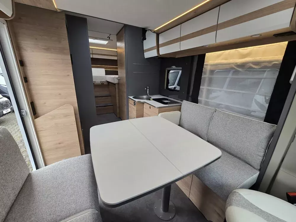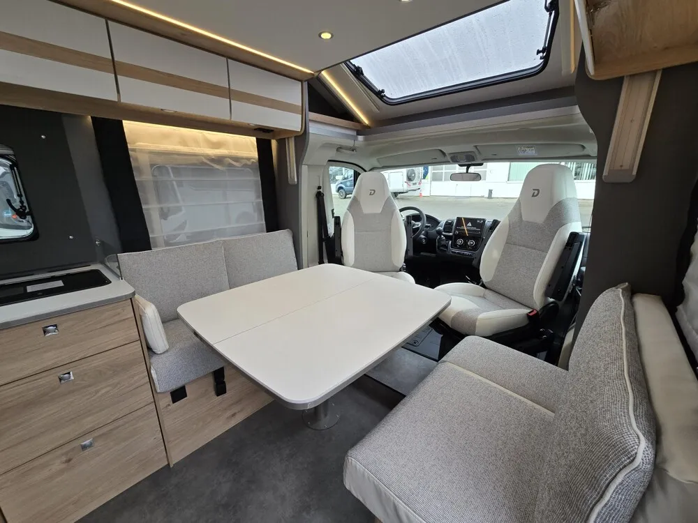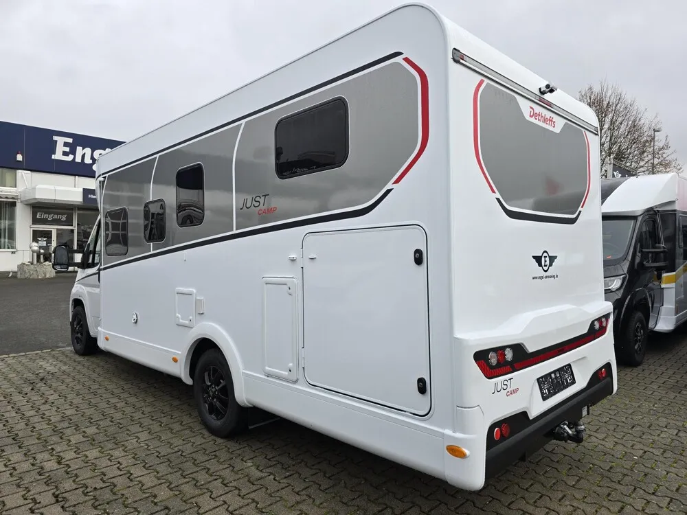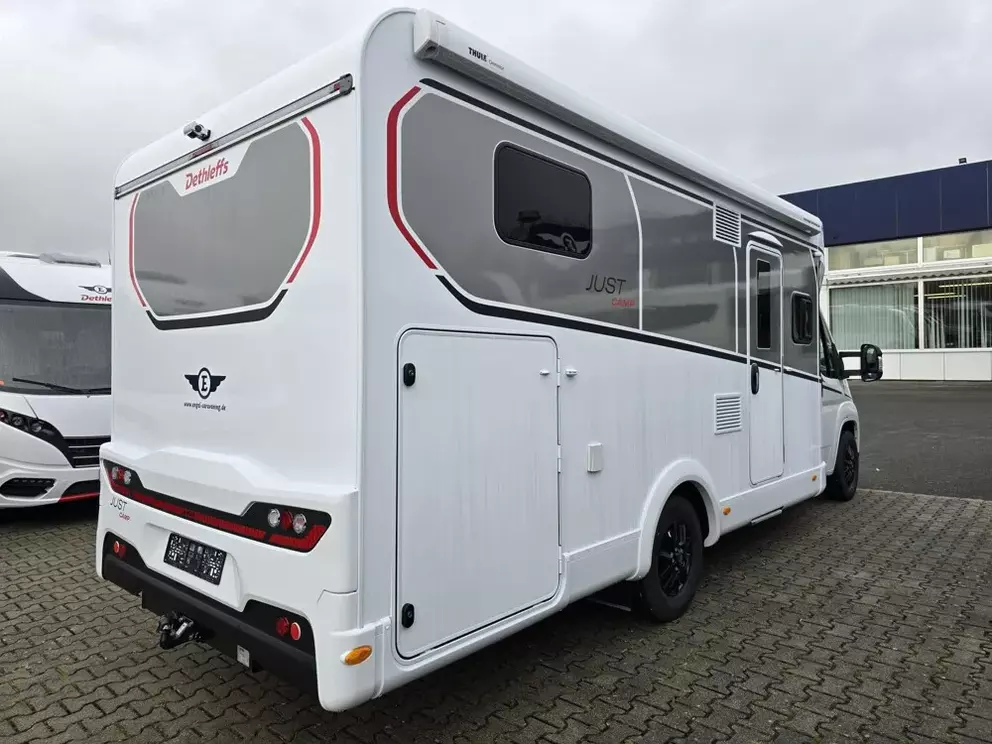 - Active-Paket T 7052 EBL (Ausstellfenster in der T-Haube, Wohnraumtür mit Fenster inkl. Verdunkelung und Zentralverriegelung (inkl. Fahrerhaustür), Verdunklungsjalousien im Fahrerhaus, Panorama-Dachhaube 70 x 50 cm im Wohnraum, Light Moments: Indirekte Ambientebeleuchtung über den Dachstauschränken, Light Moments: Indirekte Wandflächen-Ambientebeleuchtung, Stauraum-Türe links, Doppelverglaste Rahmenfenster mit Verdunklung & Mückenschutz inkl. verkleidete Küchenrückwand, Textilleder-Wohnwelt Heron, Vorbereitung Solar, Light Moments: Küchenrückwand beleuchtet, Vorbereitung Dach-Klimaanlage, Digitales Bedienelement für Warmluftheizung, Dethleffs Naviceiver inkl. DAB+, Truck Navigation, Wireless Apple CarPlay und Android Auto, Rückfahrkamera (Einfachkamera), Vorbereitung SAT-Anlage, Active Außendesign (Heckleuchtenträger mit schwarzem Diffusor, erweiterte Beklebung, Skidplate "rot"), Bettumbau Einzelbetten zu Doppelbett, Fenster im Badezimmer, Duschrost, Cassettenmarkise Omnistor 4,5 m (manuell))