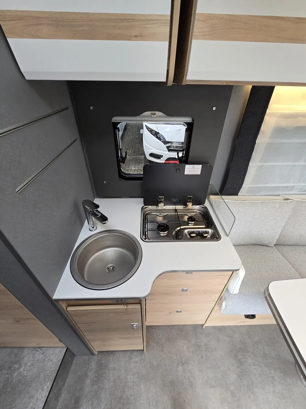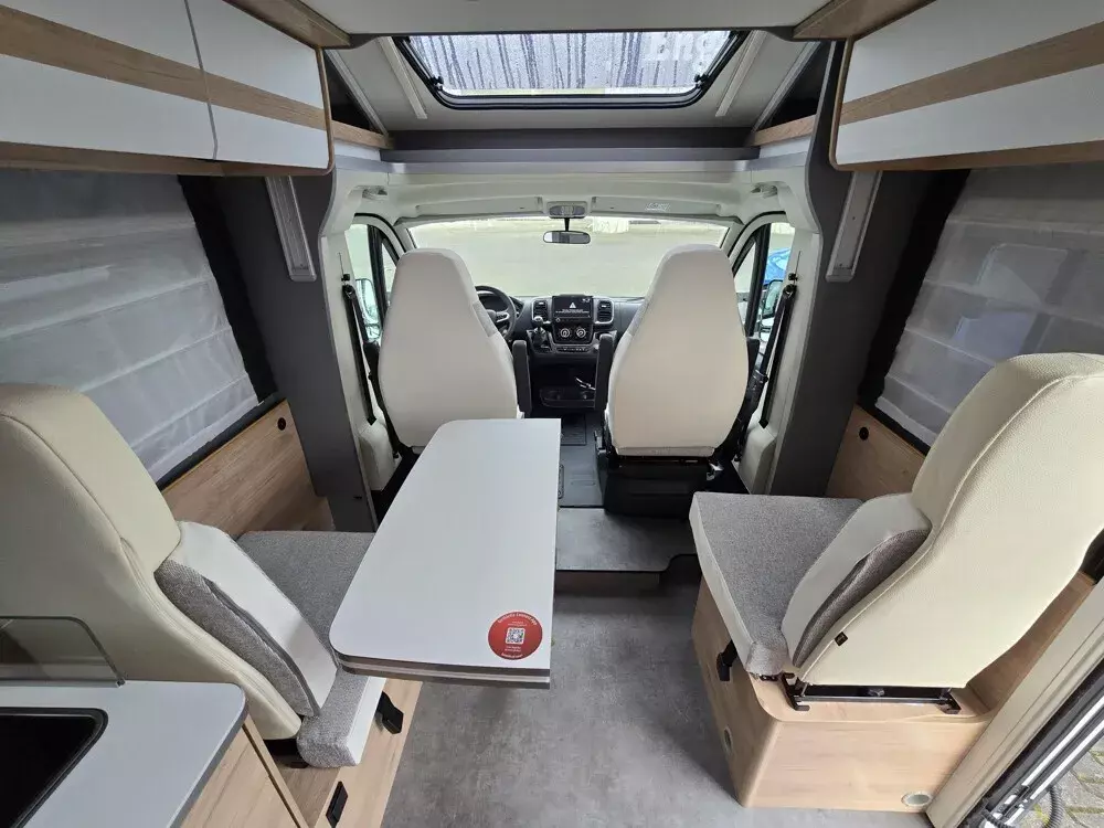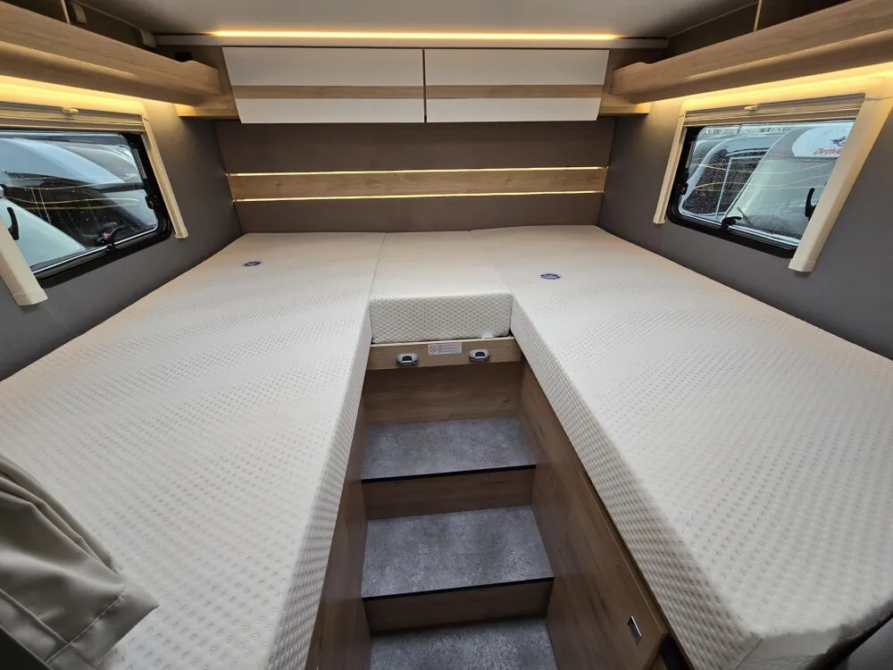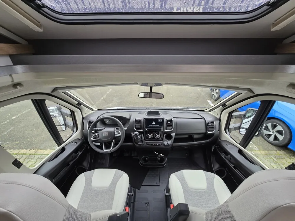 - Active-Paket T 7052 EBL (Ausstellfenster in der T-Haube, Wohnraumtür mit Fenster inkl. Verdunkelung und Zentralverriegelung (inkl. Fahrerhaustür), Verdunklungsjalousien im Fahrerhaus, Panorama-Dachhaube 70 x 50 cm im Wohnraum, Light Moments: Indirekte Ambientebeleuchtung über den Dachstauschränken, Light Moments: Indirekte Wandflächen-Ambientebeleuchtung, Stauraum-Türe links, Doppelverglaste Rahmenfenster mit Verdunklung & Mückenschutz inkl. verkleidete Küchenrückwand, Textilleder-Wohnwelt Heron, Vorbereitung Solar, Light Moments: Küchenrückwand beleuchtet, Vorbereitung Dach-Klimaanlage, Digitales Bedienelement für Warmluftheizung, Dethleffs Naviceiver inkl. DAB+, Truck Navigation, Wireless Apple CarPlay und Android Auto, Rückfahrkamera (Einfachkamera), Vorbereitung SAT-Anlage, Active Außendesign (Heckleuchtenträger mit schwarzem Diffusor, erweiterte Beklebung, Skidplate "rot"), Bettumbau Einzelbetten zu Doppelbett, Fenster im Badezimmer, Duschrost, Cassettenmarkise Omnistor 4,5 m (manuell))