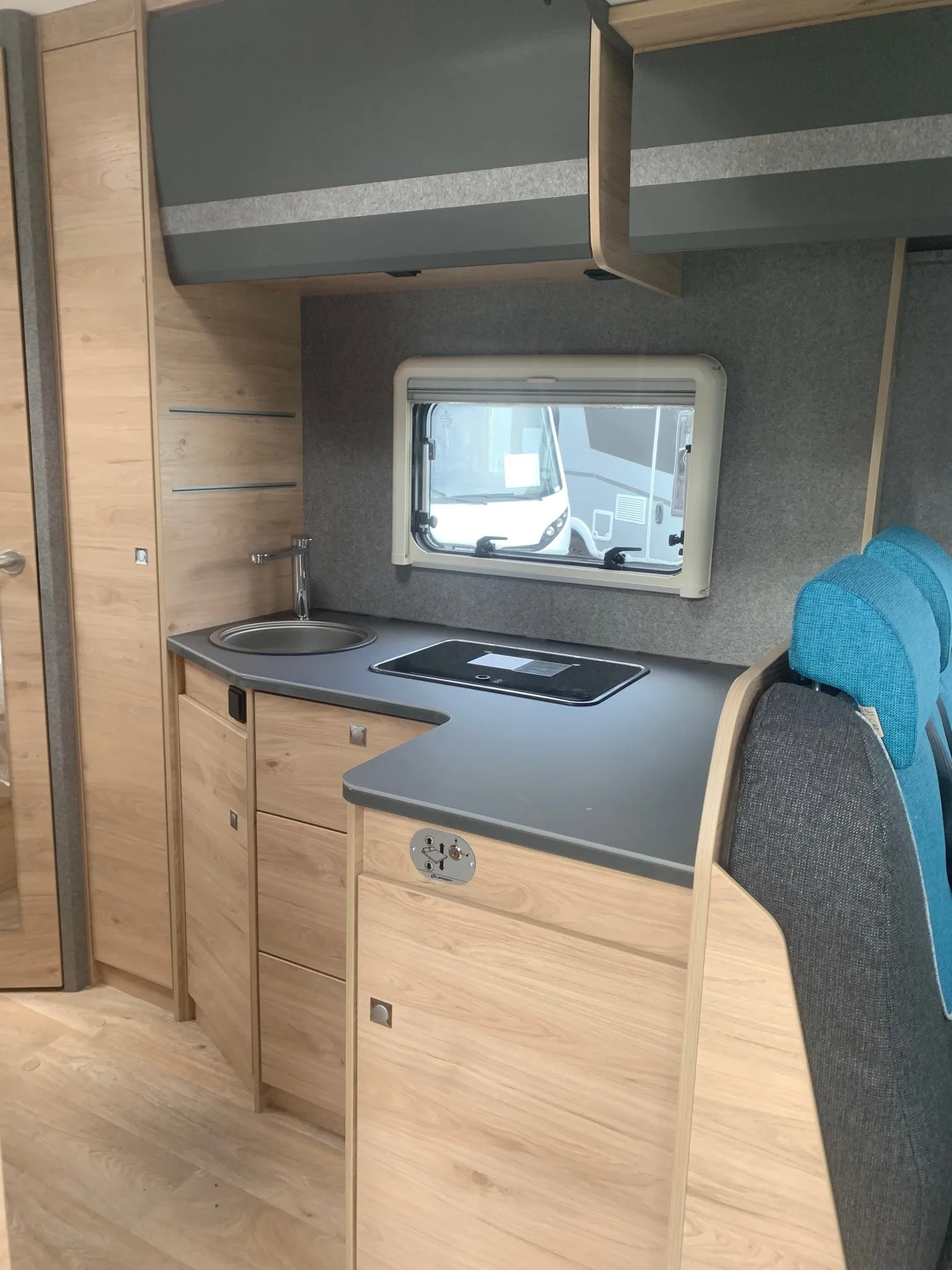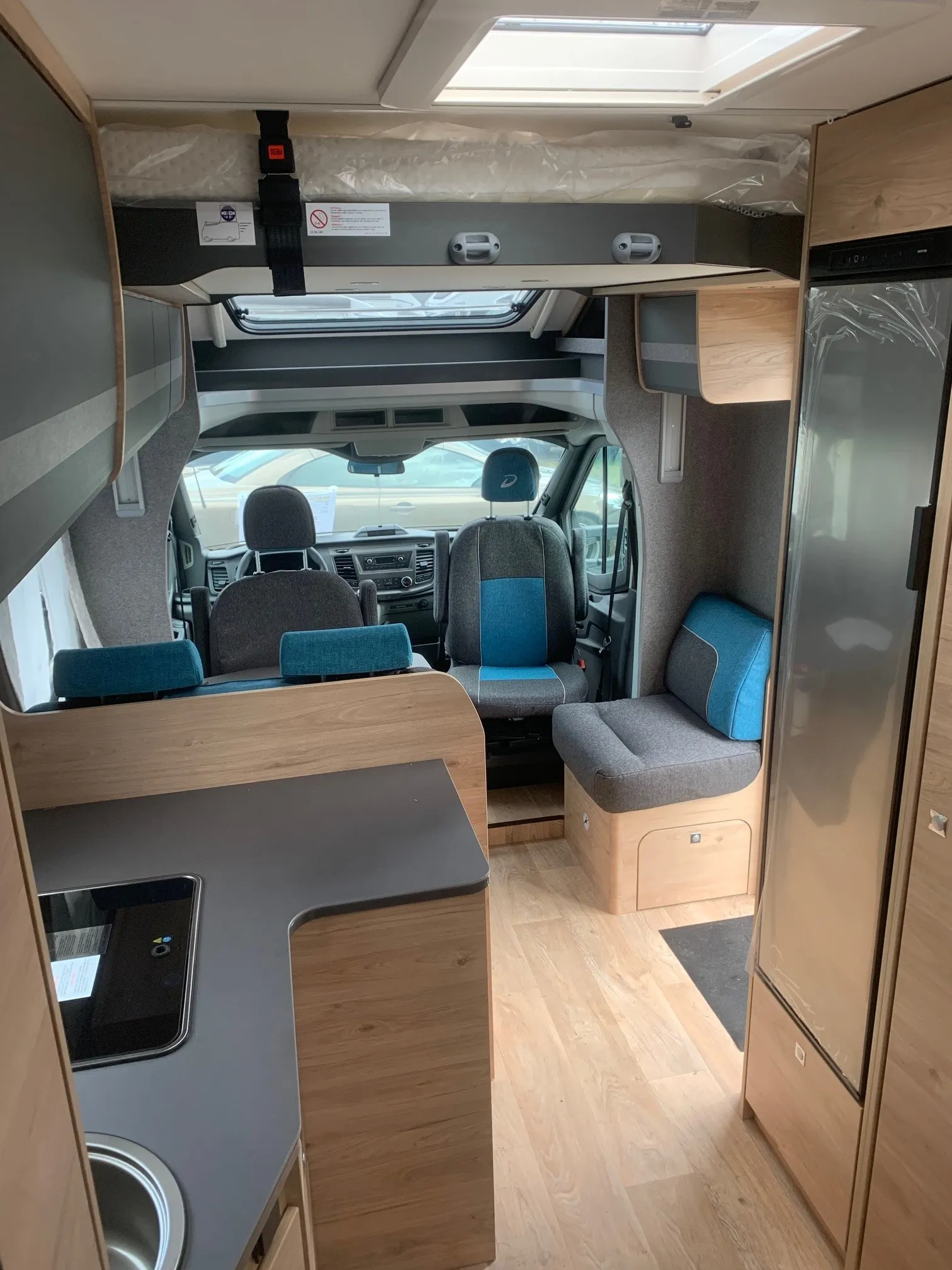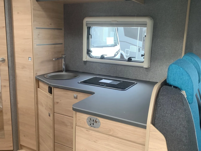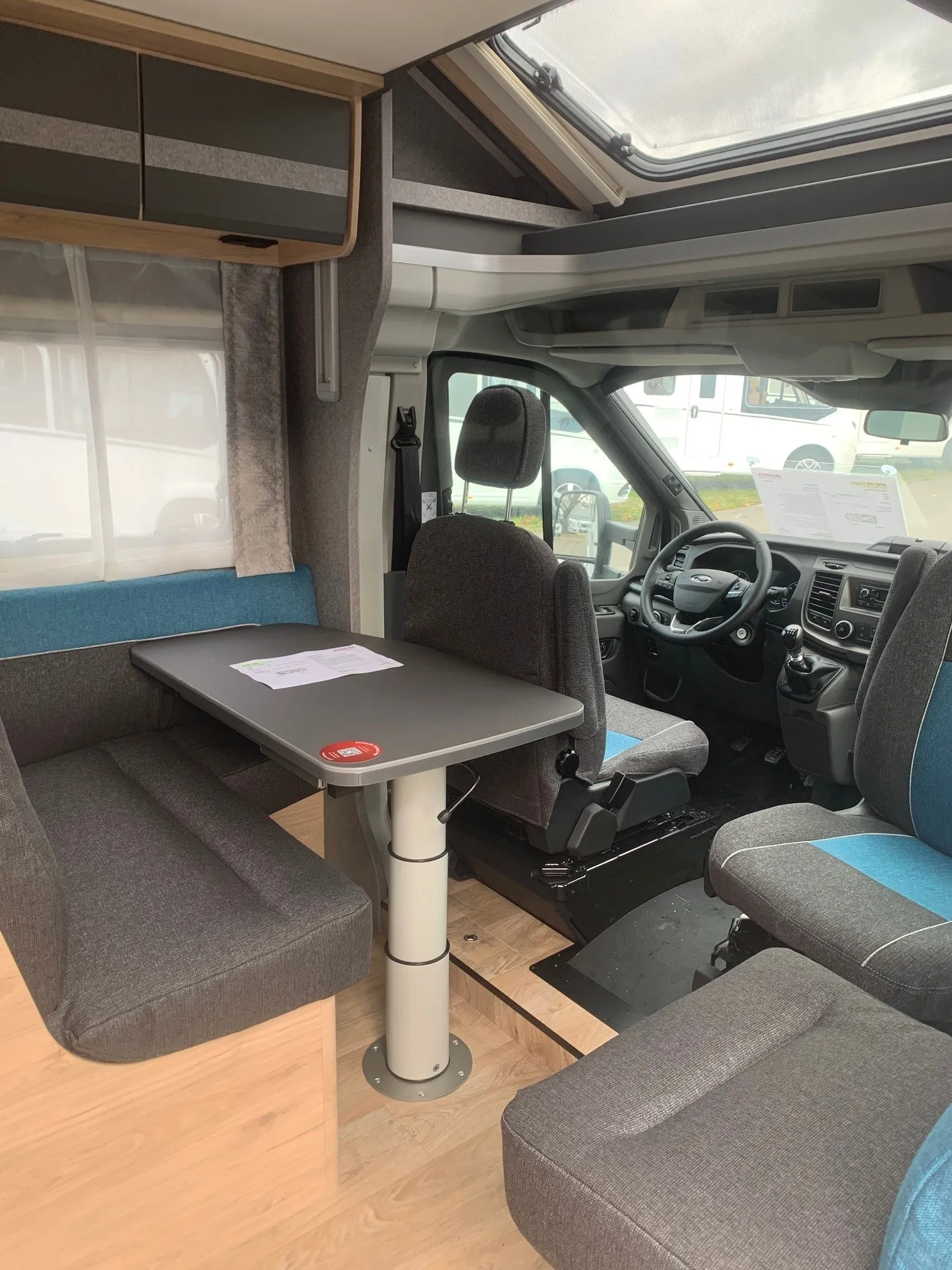 - Comfort Paket T 6905 (Alufelge Ford 16 Zoll, schwarz, Klimaanlage inkl. Staub- und Pollenfilter, Handschuhfach mit Deckel, abschließbar, Innenraumpaket Trend-Line, Seitenschutzleisten in Wagenfarbe lackiert, Stoßfänger vorn in Wagenfarbe lackiert, Nebelscheinwerfer, Scheinwerfer mit statischem Abbiegelicht, Außenspiegel elektrisch einstellbar und beheizbar, Scheinwerfer-Assistent mit Tag/Nacht-Sensor, Scheibenwischer mit Regensensor, Notbrems-Assistent, aktiv (kamerabasiert), Frontscheibe, beheizbar, Fahrspur-Assistent mit Müdigkeitswarner, Fernlicht-Assistent und Fahrspurhalte-Assistent, Wohnraumtür mit Fenster inkl. Verdunkelung und Zentralverriegelung (inkl. Fahrerhaustüre), Panorama-Dachhaube 70 x 50 cm im Wohnraum, Wohnwelt Salerno inkl. Fahrer- und Beifahrer-Sitzbezug, Light Moments: Indirekte Wandflächen-Ambientebeleuchtung, Light Moments: Indirekte Ambientebeleuchtung über den Dachstauschränken, Verdunklungsjalousien im Fahrerhaus, Ausstellfenster in der T-Haube, Gemütliche L-Sitzgruppe mit freistehendem, absenkbarem Tischfuß und 2 integrierte 3-Punkt-Gurte, Stauraum-Türe links)