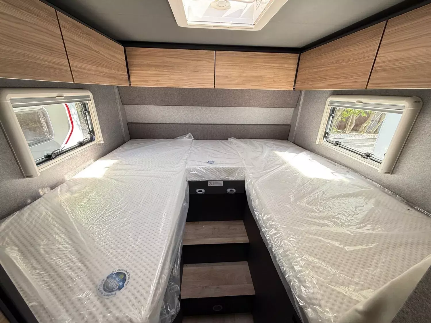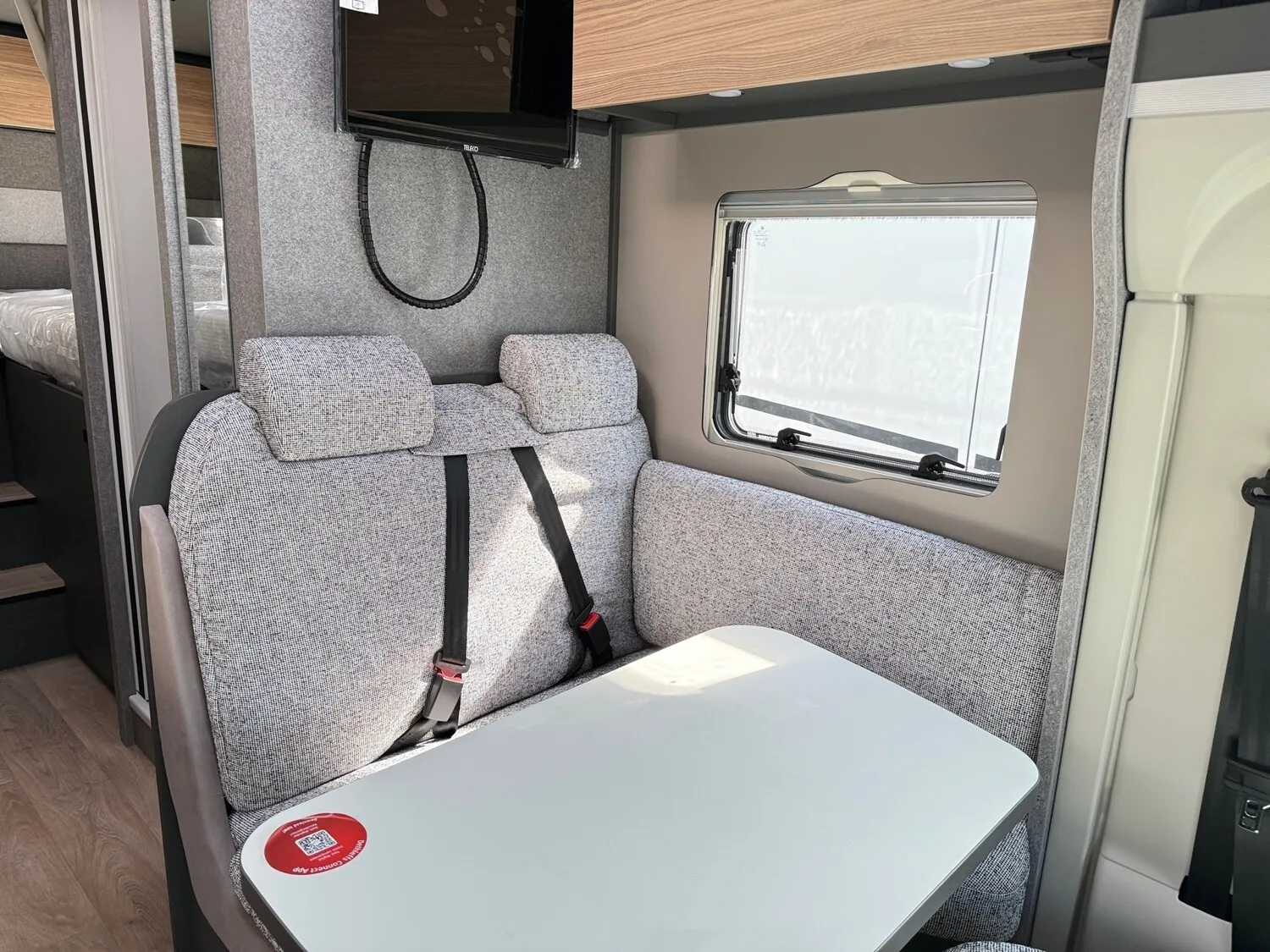 - Family-Paket T 6617 EB (Wohnraumtür mit Fenster inkl. Verdunkelung und Zentralverriegelung (inkl. Fahrerhaustür), Verdunklungsjalousien im Fahrerhaus, Light Moments: Indirekte Ambientebeleuchtung über den Dachstauschränken, Light Moments: Indirekte Wandflächen-Ambientebeleuchtung, Light Moments: Küchenrückwand beleuchtet, Light Moments: Verkleidete Sitztruhenwange mit indirekter Beleuchtung, Gemütliche L-Sitzgruppe mit freistehendem, absenkbarem Tischfuß und 2 integrierte 3-Punkt-Gurte, Bettumbau Einzelbetten zu Doppelbett)