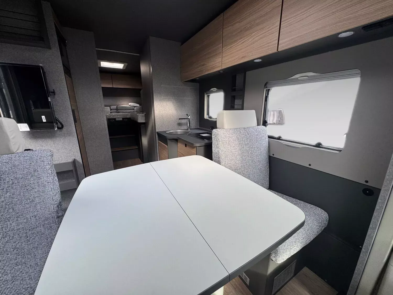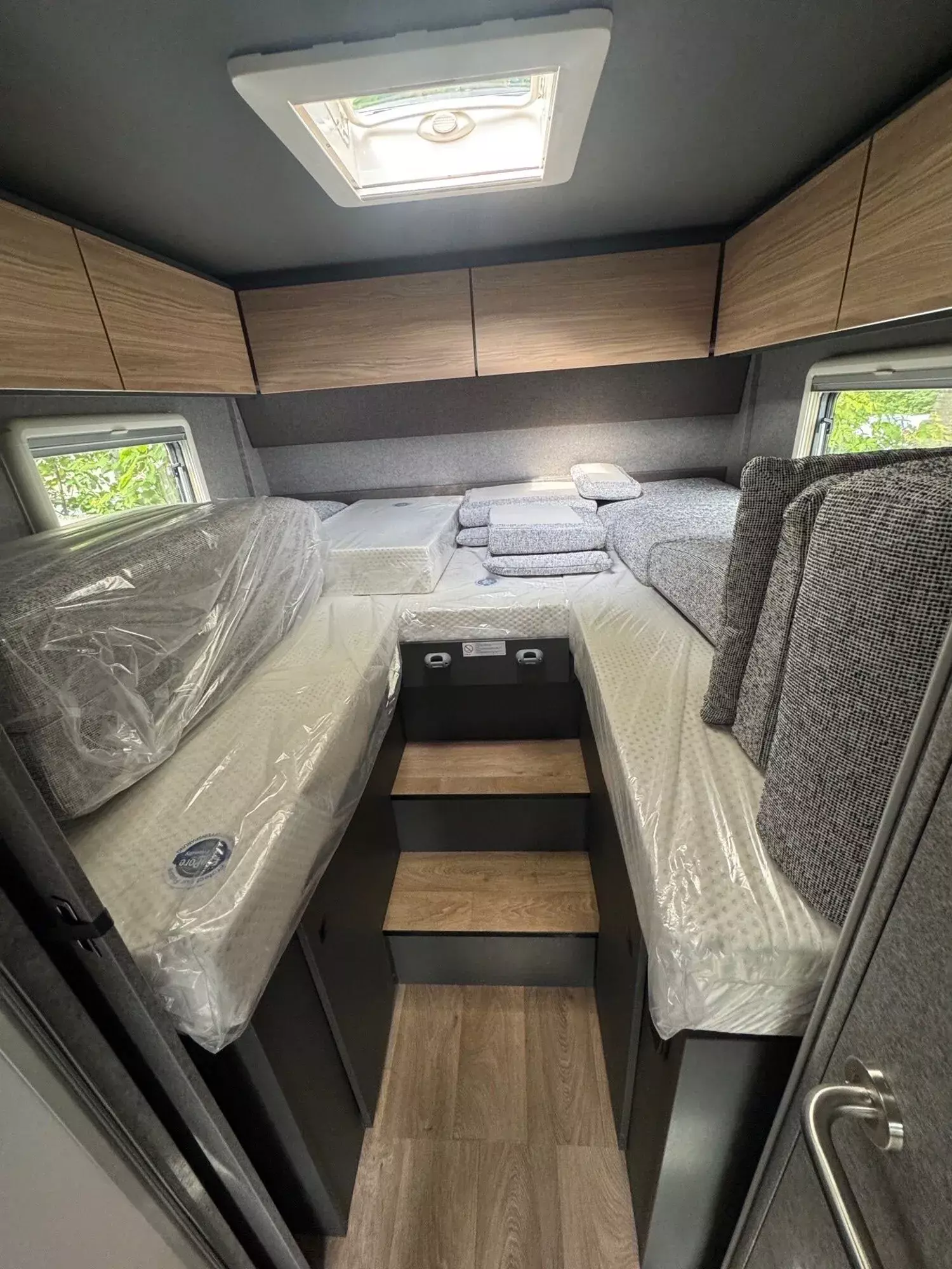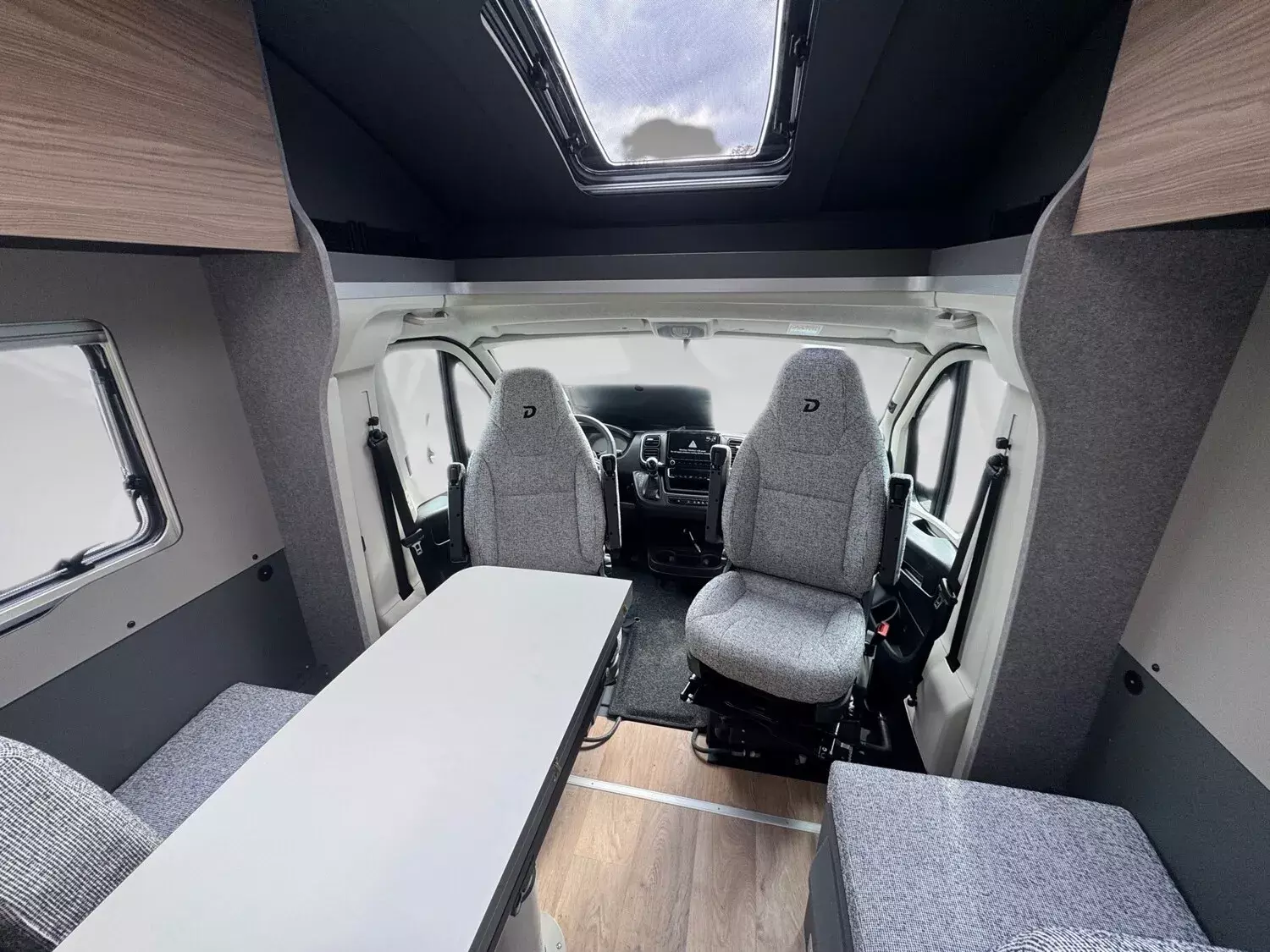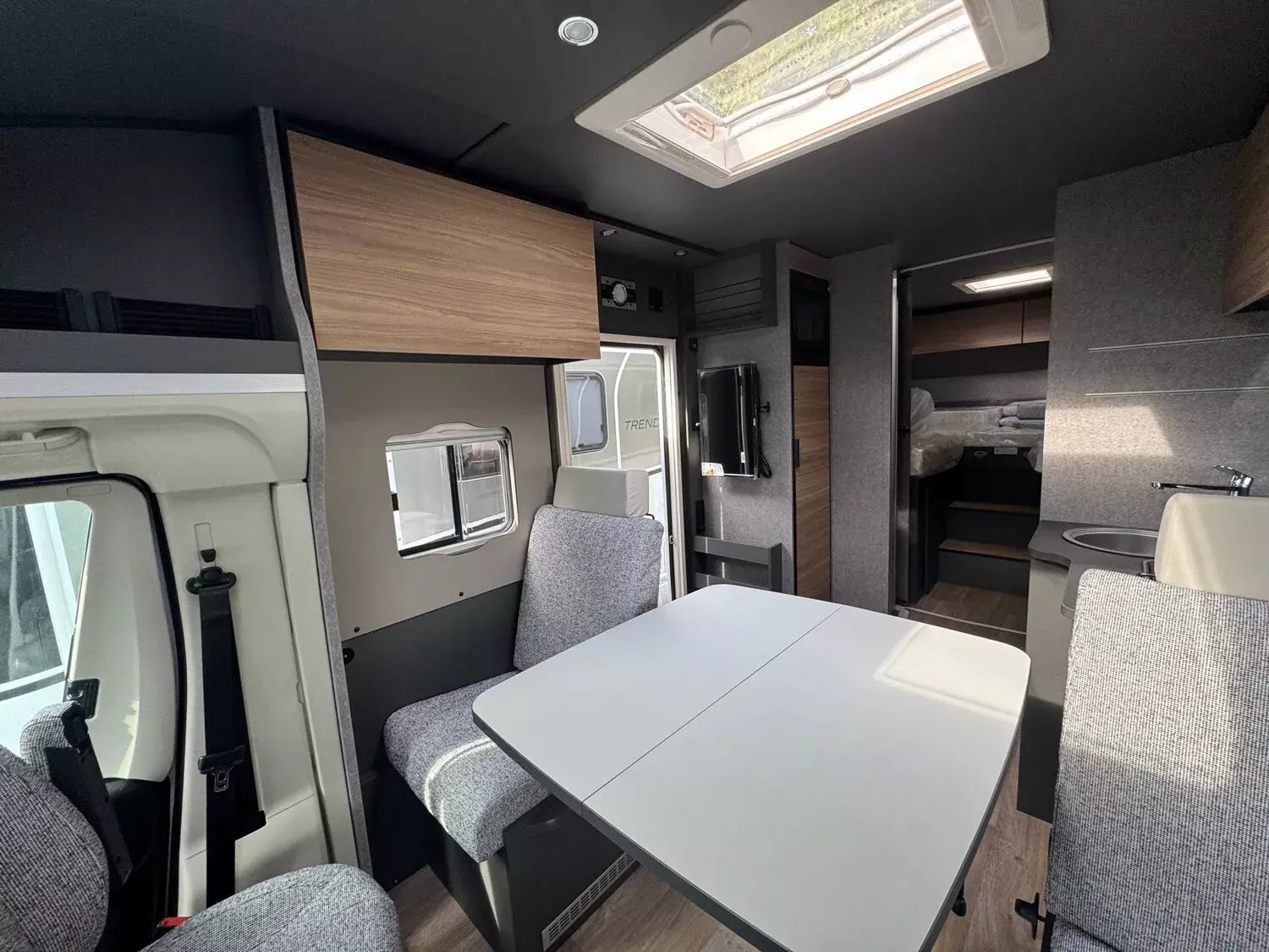 - Family-Paket T 6817, 7057 EB (Wohnraumtür mit Fenster inkl. Verdunkelung und Zentralverriegelung (inkl. Fahrerhaustür), Verdunklungsjalousien im Fahrerhaus, Light Moments: Indirekte Ambientebeleuchtung über den Dachstauschränken, Light Moments: Indirekte Wandflächen-Ambientebeleuchtung, Light Moments: Küchenrückwand beleuchtet, Light Moments: Indirekte Beleuchtung im Badezimmer mit beleuchteter Duschkonsole, Light Moments: Eingangsmodul mit indirekter Beleuchtung, Light Moments: Verkleidete Sitztruhenwange mit indirekter Beleuchtung, Gemütliche L-Sitzgruppe mit freistehendem, absenkbarem Tischfuß und 2 integrierte 3-Punkt-Gurte, Bettumbau Einzelbetten zu Doppelbett)