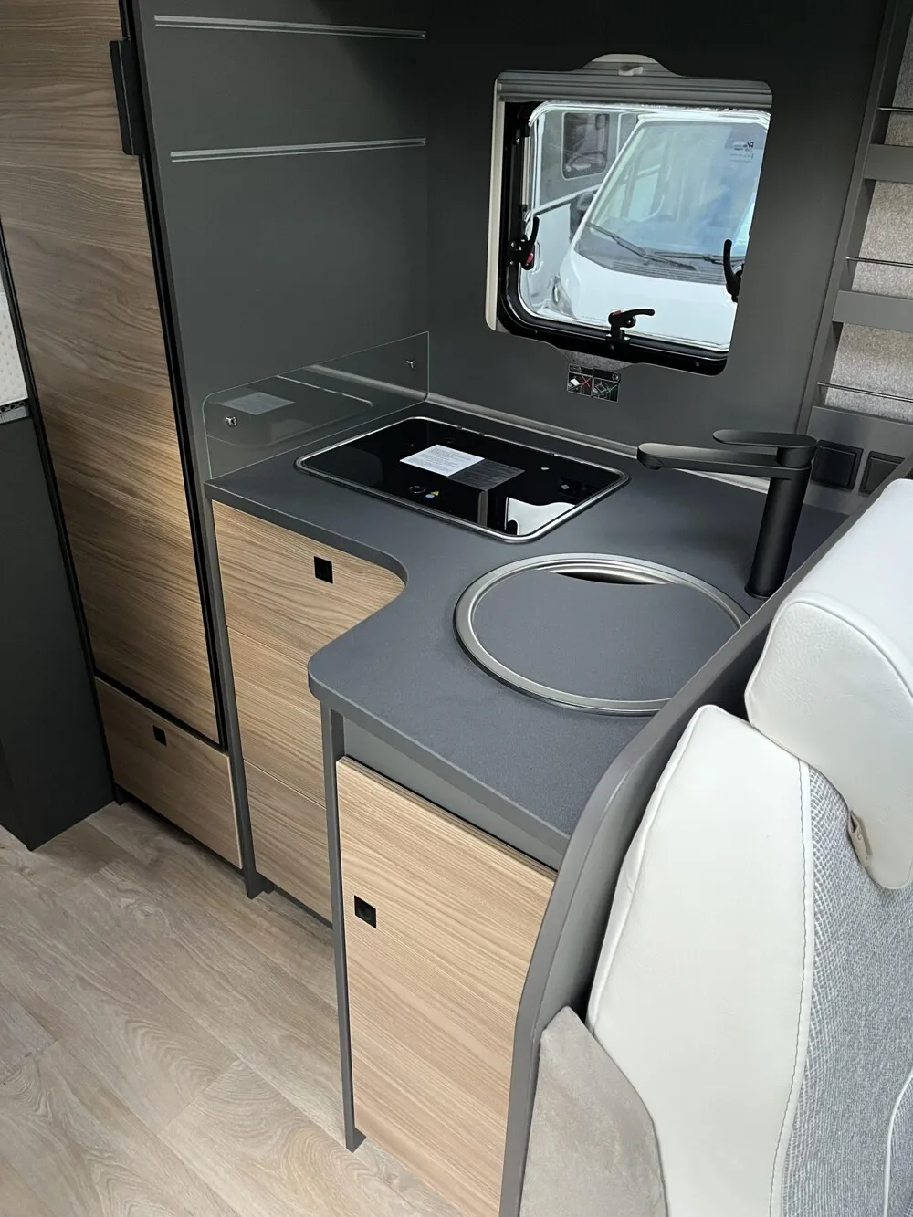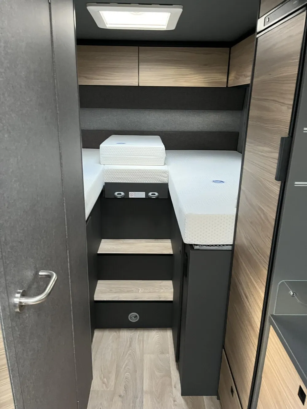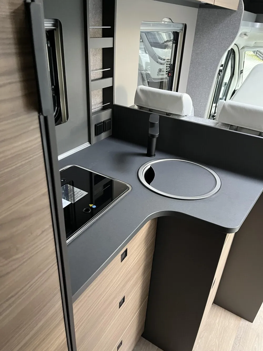 - Active-Paket T 6817, 7057 EB (Wohnraumtür mit Fenster inkl. Verdunkelung und Zentralverriegelung (inkl. Fahrerhaustür), Verdunklungsjalousien im Fahrerhaus, Light Moments: Indirekte Ambientebeleuchtung über den Dachstauschränken, Light Moments: Indirekte Wandflächen-Ambientebeleuchtung, Light Moments: Küchenrückwand beleuchtet, Light Moments: Indirekte Beleuchtung im Badezimmer mit beleuchteter Duschkonsole, Light Moments: Eingangsmodul mit indirekter Beleuchtung, Light Moments: Verkleidete Sitztruhenwange mit indirekter Beleuchtung, Gemütliche L-Sitzgruppe mit freistehendem, absenkbarem Tischfuß und 2 integrierte 3-Punkt-Gurte, Bettumbau Einzelbetten zu Doppelbett, Außenfarbe Chassis Schwarz Metallic, Außendesign GT (Heckleuchtenträger mit schwarzem Diffusor, erweiterte Beklebung, Skidplate "rot"), Integrierte Einlinsen Rückfahrkamera, Vorbereitung SAT-Anlage, Vorbereitung Dach-Klimaanlage, Vorbereitung Solar, Duschrost, Dethleffs Naviceiver inkl. DAB+, Truck Navigation, Wireless Apple CarPlay und Android Auto, Textilleder-Wohnwelt Heron, Fenster im Badezimmer)