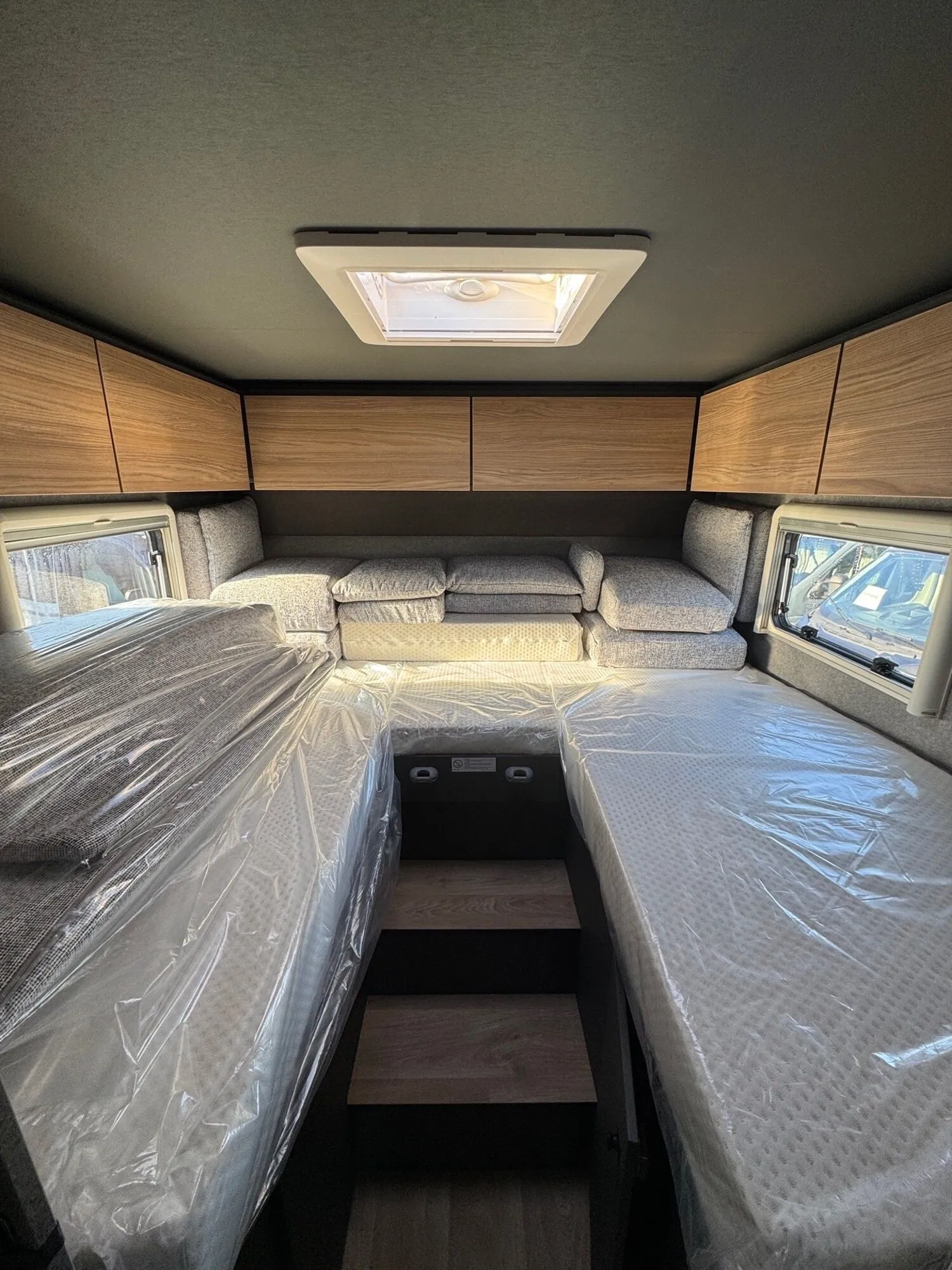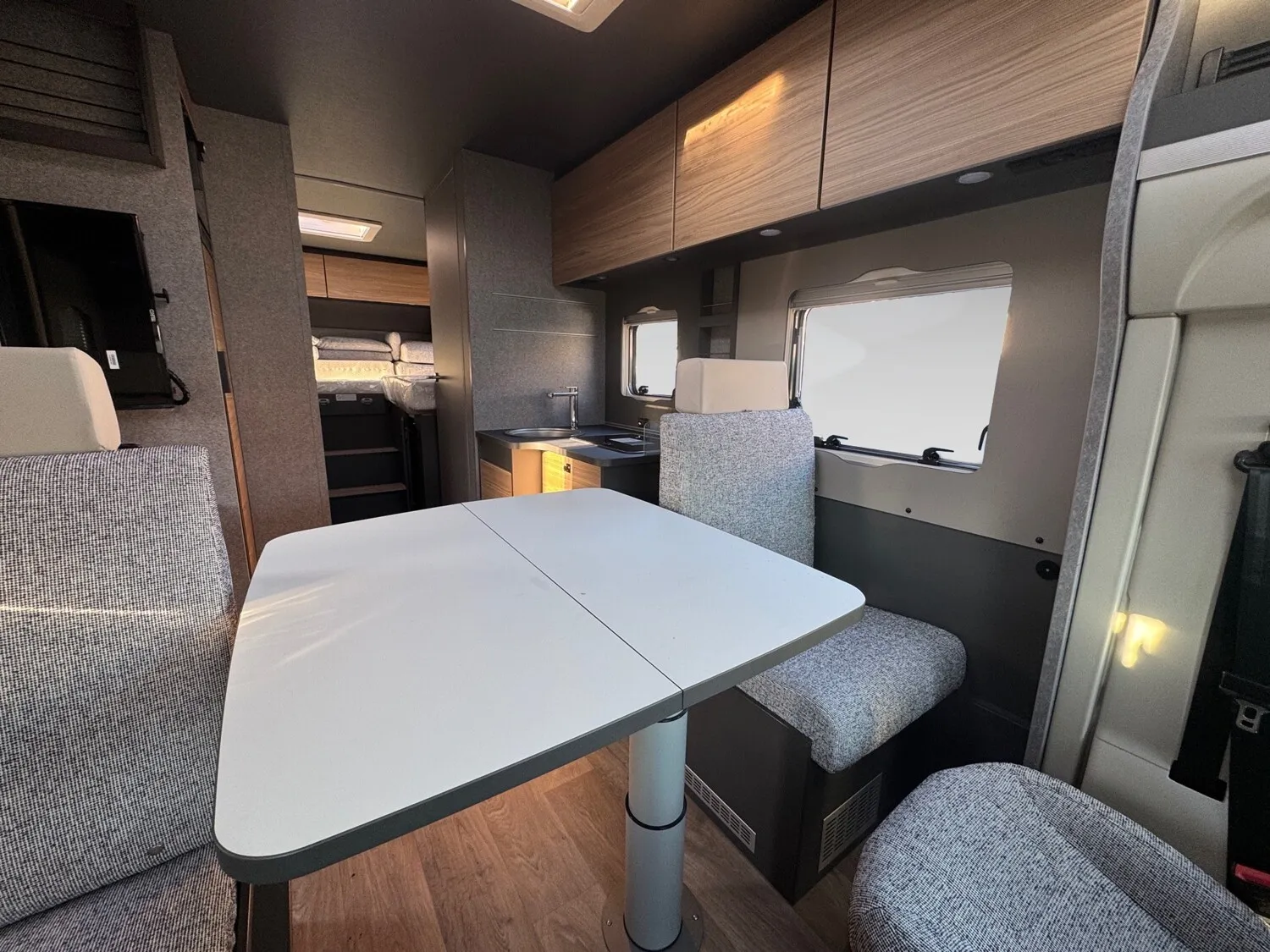 - Family-Paket T 7057 EBL (Wohnraumtür mit Fenster inkl. Verdunkelung und Zentralverriegelung (inkl. Fahrerhaustür), Verdunklungsjalousien im Fahrerhaus, Light Moments: Indirekte Ambientebeleuchtung über den Dachstauschränken, Light Moments: Indirekte Wandflächen-Ambientebeleuchtung, Light Moments: Küchenrückwand beleuchtet, Light Moments: Indirekte Beleuchtung im Badezimmer mit beleuchteter Duschkonsole, Light Moments: Eingangsmodul mit indirekter Beleuchtung, Bettumbau Einzelbetten zu Doppelbett)