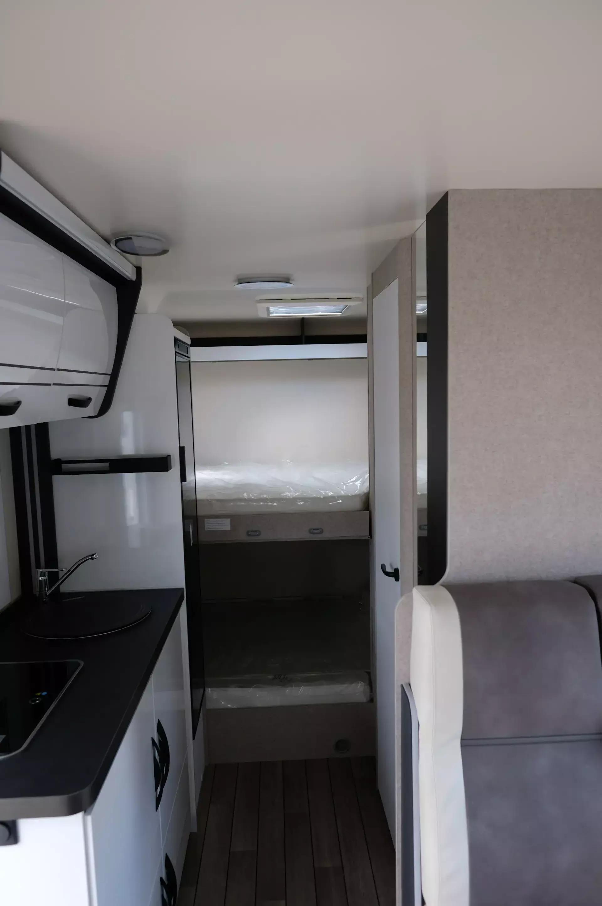 Einer für Alle. Alkoven, Sitzgruppe und Etagenbetten mit großer Garage. Hier findet jeder und alles seinen Platz !