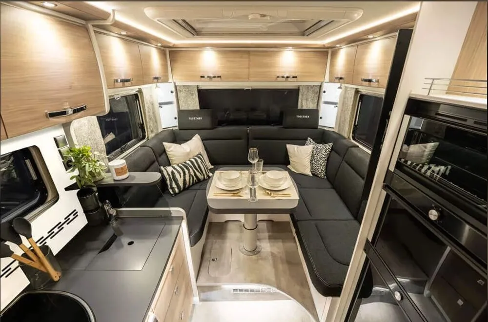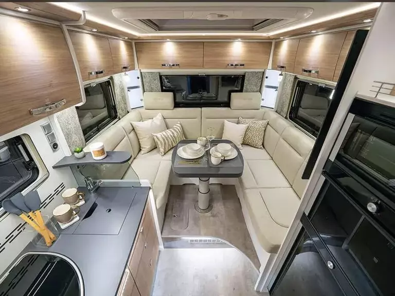 - ED. TOGETHER Serienausstattung (Mod. 2026) (Spezielle EDITION TOGETHER Außenbeklebung, hochwertige Stoffauswahl, manueller Sichtschutz/Verdunklungsplissee bei Alkoven/Teilintegriert, bei integrierten mit Taglichtfunktion, Stauraumbeleuchtung unter Sitzgruppe, man. Heckstützen (Entfall bei Bestellung Option Luftfederung), Zentralversorgung, Keramik-Toilette, zweite Thedfordkassette, Batterie 300 AH LiFePO4, dimmbare Ambiente- und Spotbeleuchtung, Leseleuchten, Warmwasserheizung ALDE 3030,Frischwassertank mit einstellbarer 50 l Fahrebefüllung, 2 x 100 W Solarmodul, Wechselrichter, DuoControl, Rückfahrkamera, zusätzlich TV Steckdose, WiFi Router, 32 Zoll Smart TV, 11 Jahre Dichtigkeitsgarantie, Markise, Beleuchtungsprofil für Markise A 680 Plus: 4 m Markise manuell (Anthr.) I 680/A 740/I 740 Plus: 4,5 m Markise manuell (Anthr.). Steckdosen: 4 x 230 V Stecldosen (wie Exklusiv Ausstattung), je nach Grundriss 2 bis 4 USB Steckdosen (wie Exklusiv Ausstattung), Steckdosen in hinterer Heckgarage auf rechter Seite 1 x 12 V und 1 x 230 V (wie Luxury Ausstattung), zusätzliche 230 V Steckdose in Küche (Pos. 13), unterhalb der hinteren, linken Eckvitrine (Pos. 33), in Ablage/Stauraum über Kühlschrank (Pos. 35), hinter dem linken Fahrerhaussitz an Kommode (Pos. 3). Zusätzliche USB Steckdose unterhalb der hinteren rechten Eckvitrine (Pos. 34).)