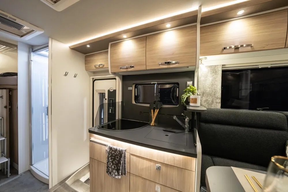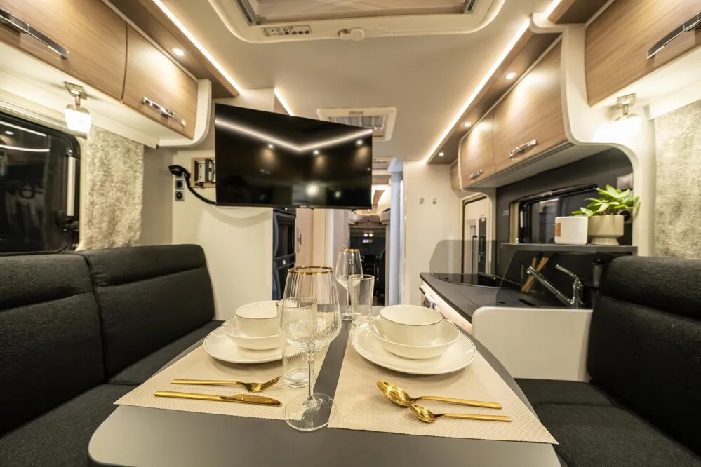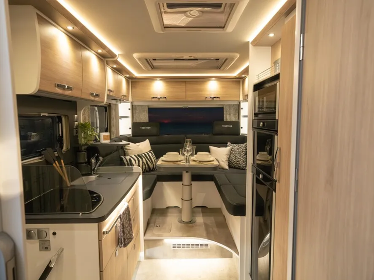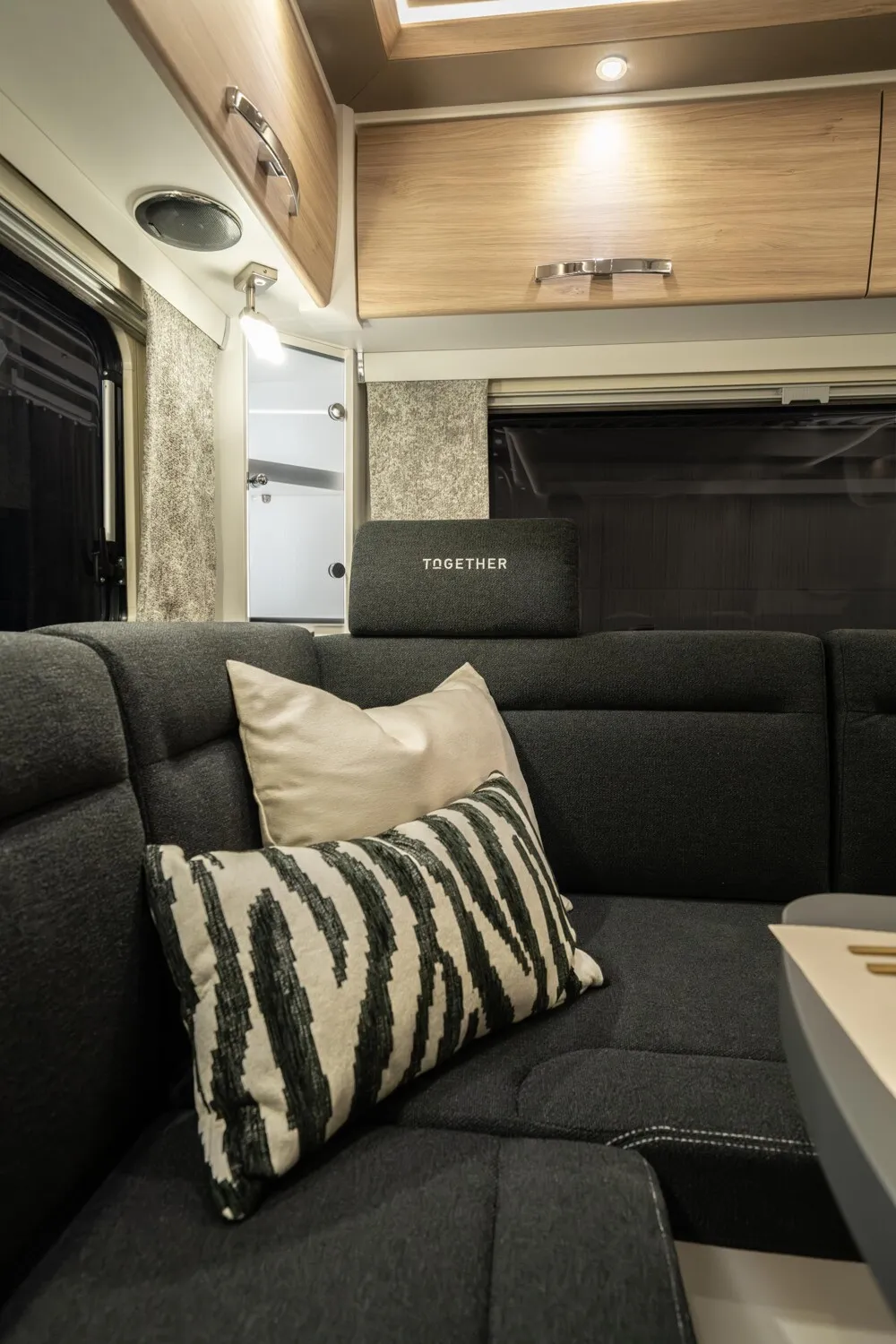 - ED. TOGETHER Serienausstattung (bestehend aus:Spezielle EDITION TOGETHER Außenbeklebung, hochwertige Stoffauswahl, manueller Sichtschutz/Verdunklungsplissee bei Alkoven/Teilintegriert, bei Integrierten mit Taglichtfunktion, man. Heckstützen (Entfall bei Bestellung Option Luftfederung), Zentralversorgung, Keramik-Toilette, zweite Thetfordkassette, Batterie 320 Ah LiFePO4, dimmbare Ambiente- und Spotbeleuchtung, Leseleuchten, Warmwasserheizung ALDE, Frischwassertank mit einstellbarer 50 l Fahrbefüllung, 2x 110 W Solarmodul, Wechselrichter, DuoControl, Rückfahrkamera, zusätzlich. TV Steckdose, WiFi Router, 32 Zoll Smart TV, 11 Jahre Dichtigkeitsgarantie, Markise, Beleuchtungsprofil für Markise.A 680 PLUS: 4 m Markise manuell (Anthr.)I 680 / A 740 / I 740 PLUS: 4,5 m Markise manuell (Anthr.)Steckdosen:4 x 230 V Steckdosen (wie Exklusiv Ausstattung), je nach Grundriss 3 bis 4 x USB Steckdosen (wie Exklusiv Ausstattung), Steckdosen in hinterer Heckgarage auf rechter Seite 1x 12 V und 1x 230 V (wie Luxury Ausstattung), zusätzliche 230 V Steckdosen in Küche (Pos. 13), unterhalb der hinteren, linken Eckvitrine (Pos. 33), in Ablage/Stauraum über Kühlschrank (Pos. 35), bei Integrierten: hinter dem linken Fahrerhaussitz an Kommode (Pos. 3). Zusätzliche USB Steckdose unterhalb der hinteren rechten Eckvitrine (Pos. 34).)