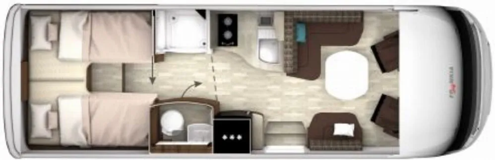 - Entfall L.Sitzgruppe (und Winkelküche, dafür Längssitzgruppe und Längsküche. Achtung: Es entfällt dadurch ein serienmäßiger Gurtsitzplatz!|(nur bestellbar bei 740-7400 GD/QD)