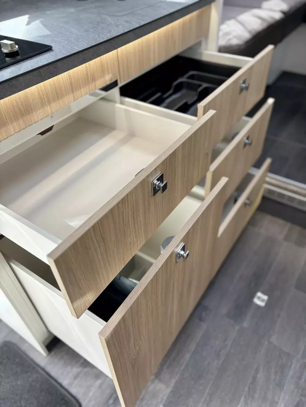 - Steckdosenpaket 7400 PLUS Pure (3x 230 V Steckdose an Positionen 13, 33 und 35 (1x bei Küchensteckdosen, 1x unterhalb der hinteren linken Eckvitrine, 1x in Ablage/Stauraum oberhalb Kühlschrank) und 1x USB an Position 24 (1x bei vorderem PLUS Hubbett mittig in Ablage)