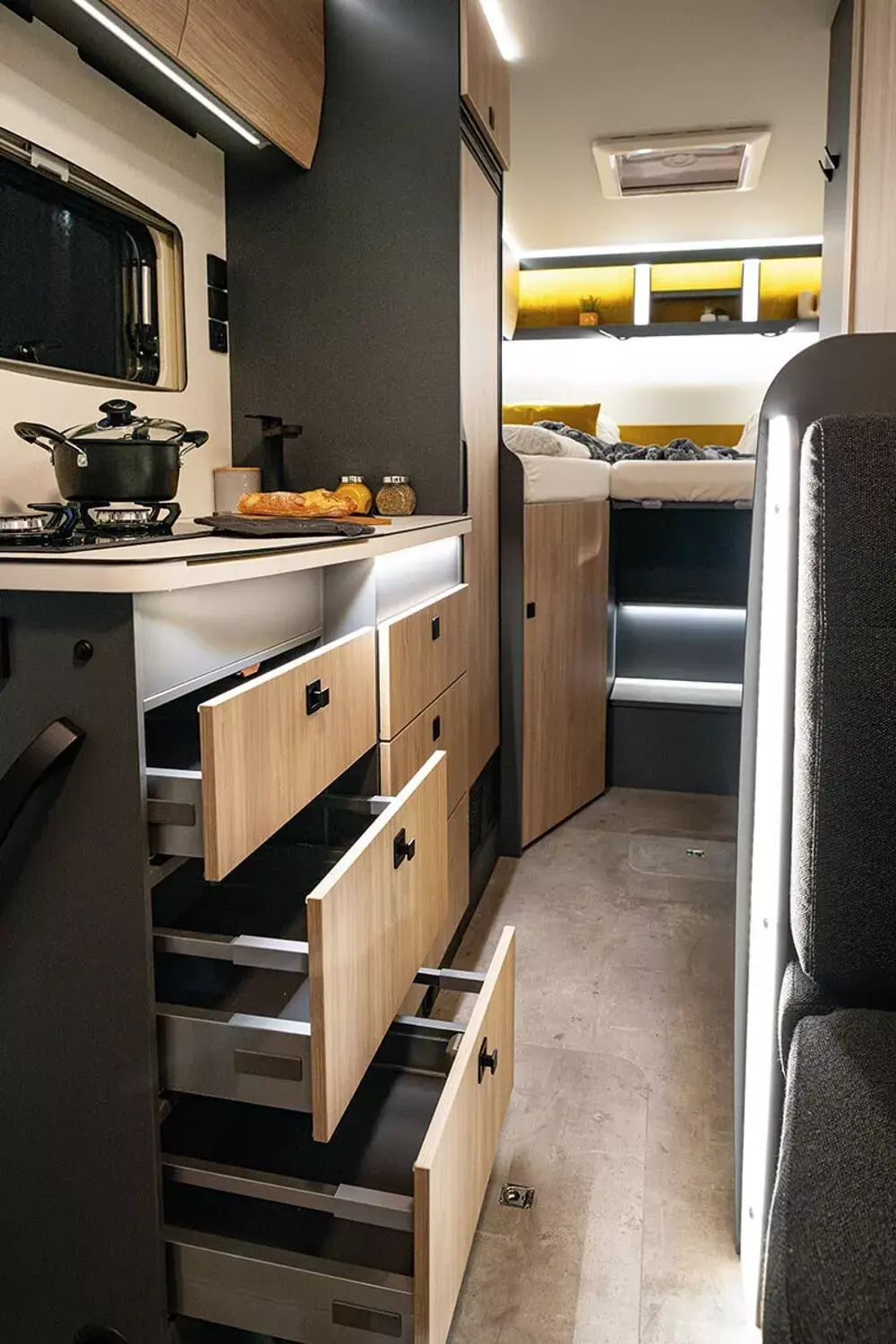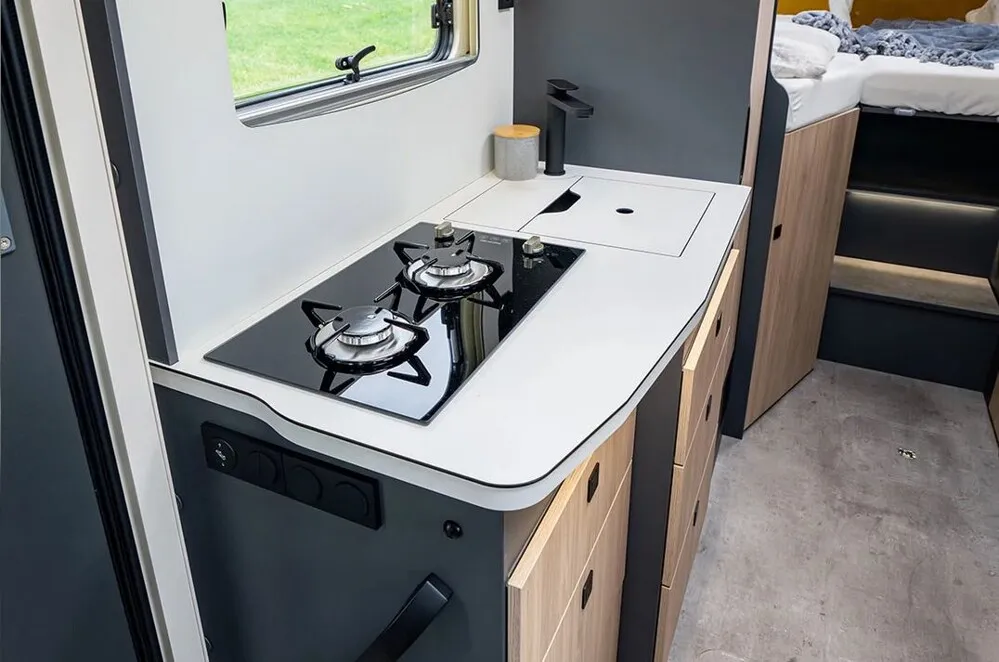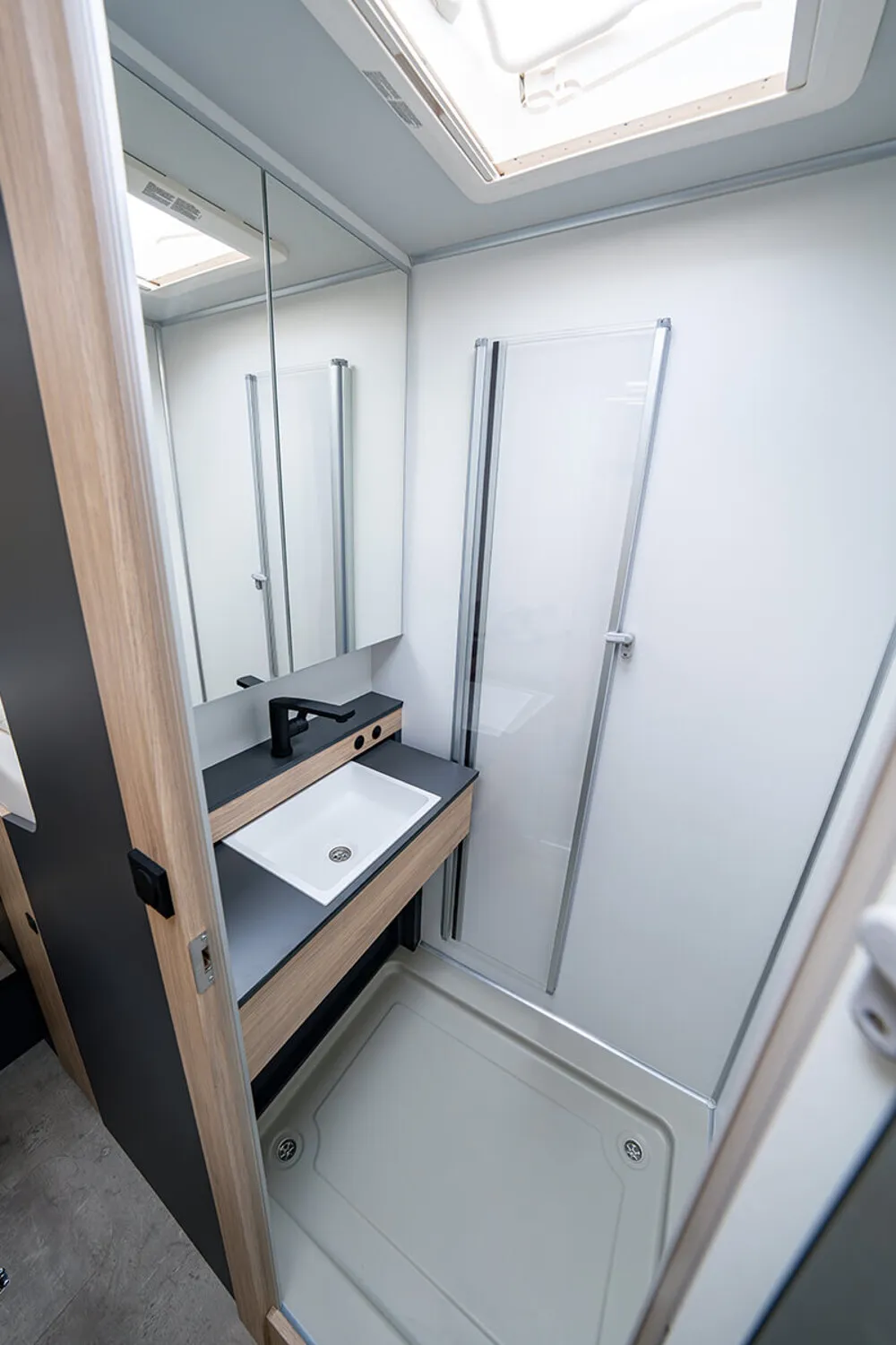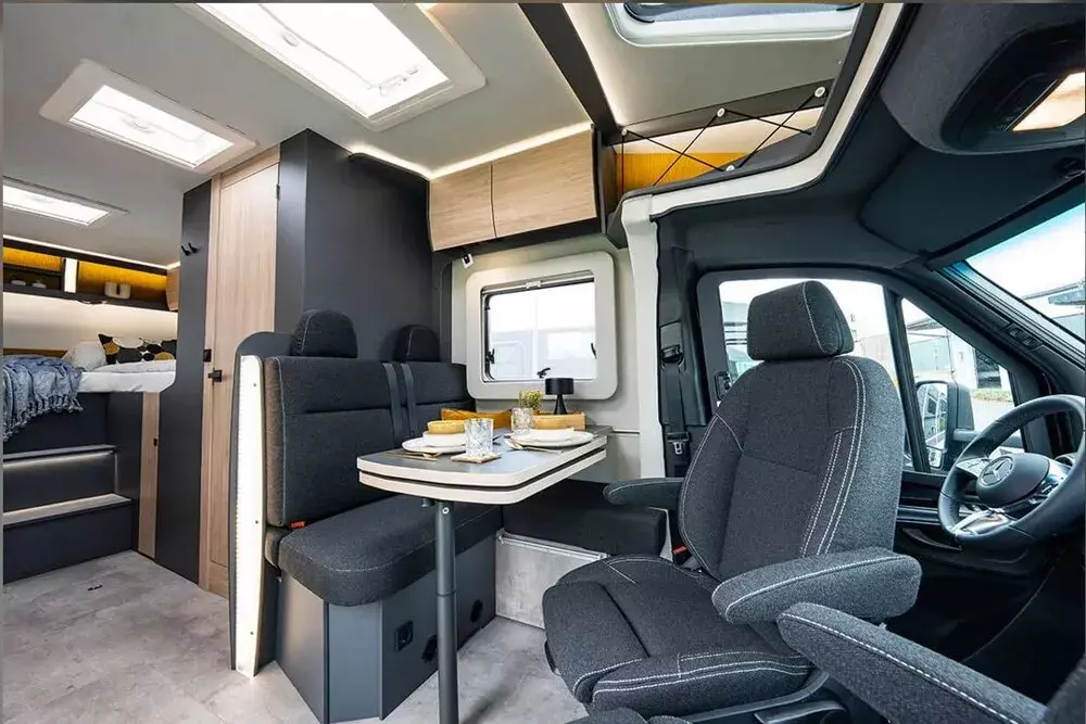 - Neo Licht-Paket (Beleuchtung der Duschsäule, Beleuchtung an der Trittstufe, Lichtband unterhalb der Küchenplatte, Entfall Mini-Heki über Sitzgruppe, dafür Midi-Heki)