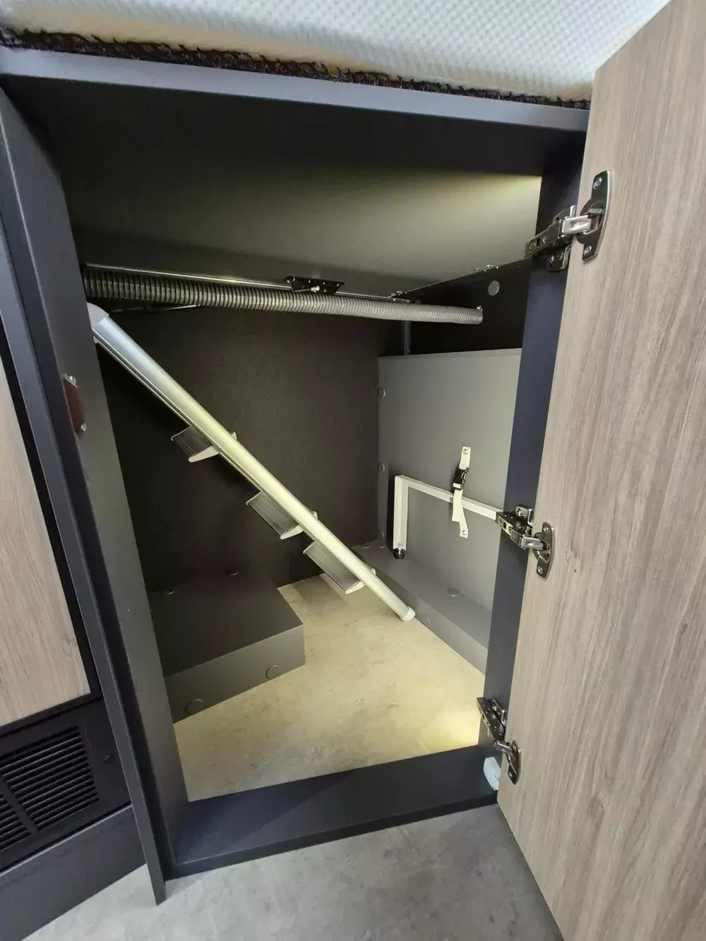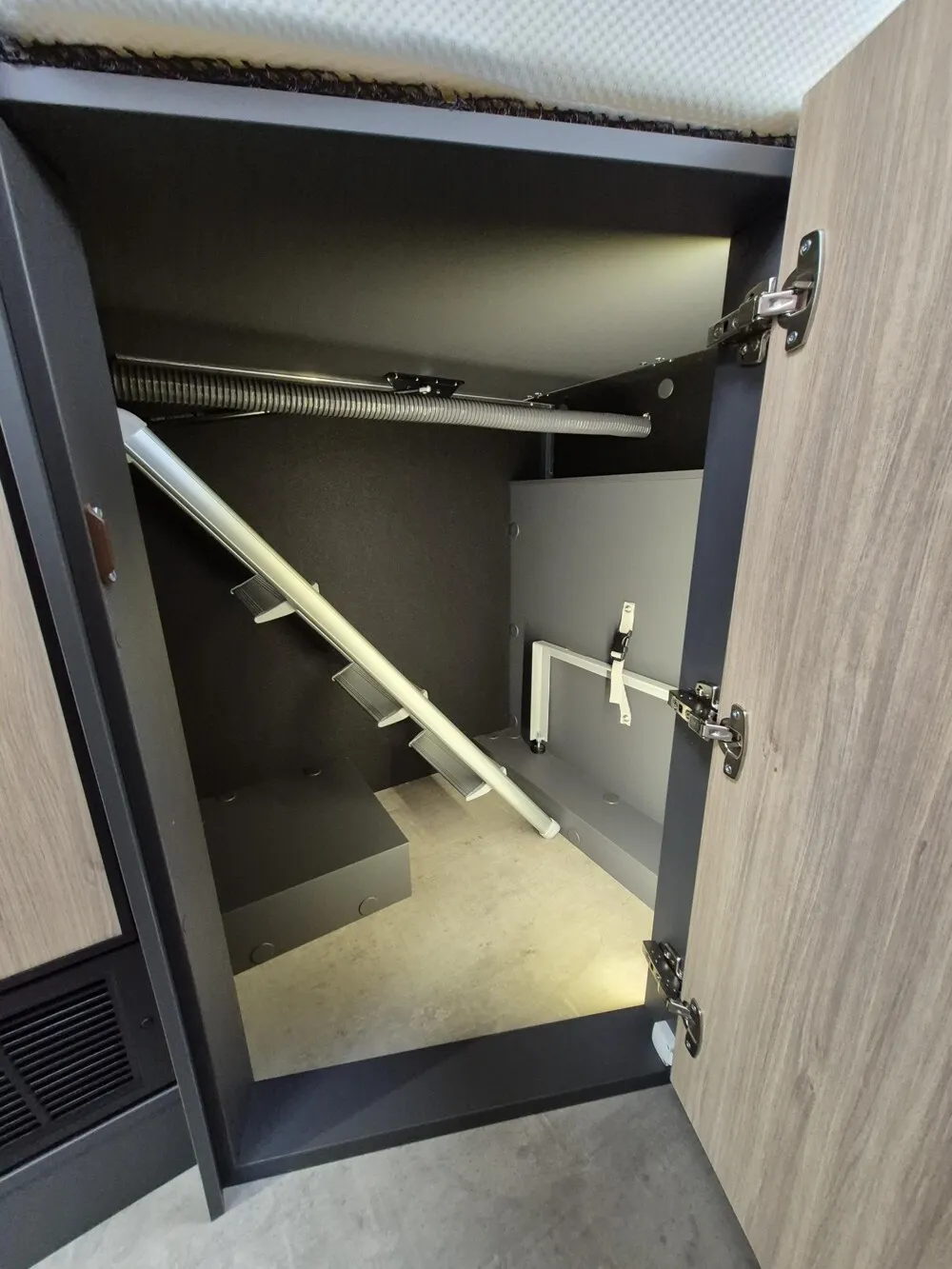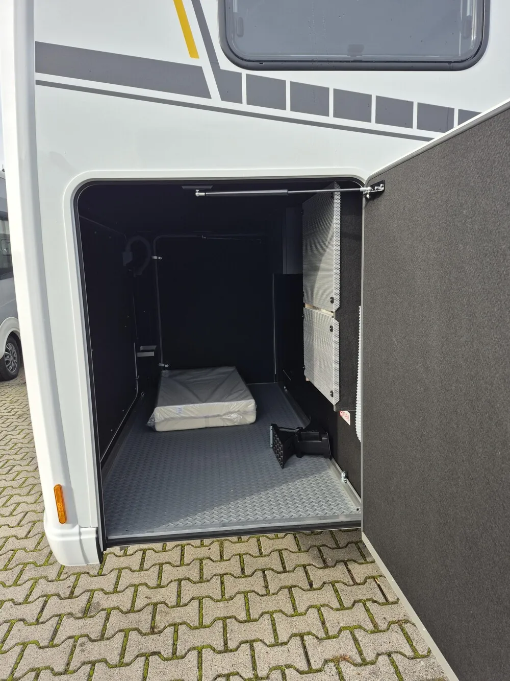 - Neo Smart-Load-Paket (Selbsteinziehende Kabeltrommel inkl. Durchführung in der Außenwand, Heckklappe, Bei Neo GDK: Klappmechanismus für Kleiderschrank unter GD-Bett auf der rechten Fahrzeugseite, Easy-Load-Funktion in Sitzgruppe inkl. Polster (Klappmechanismus für erweiterten Stauraum)