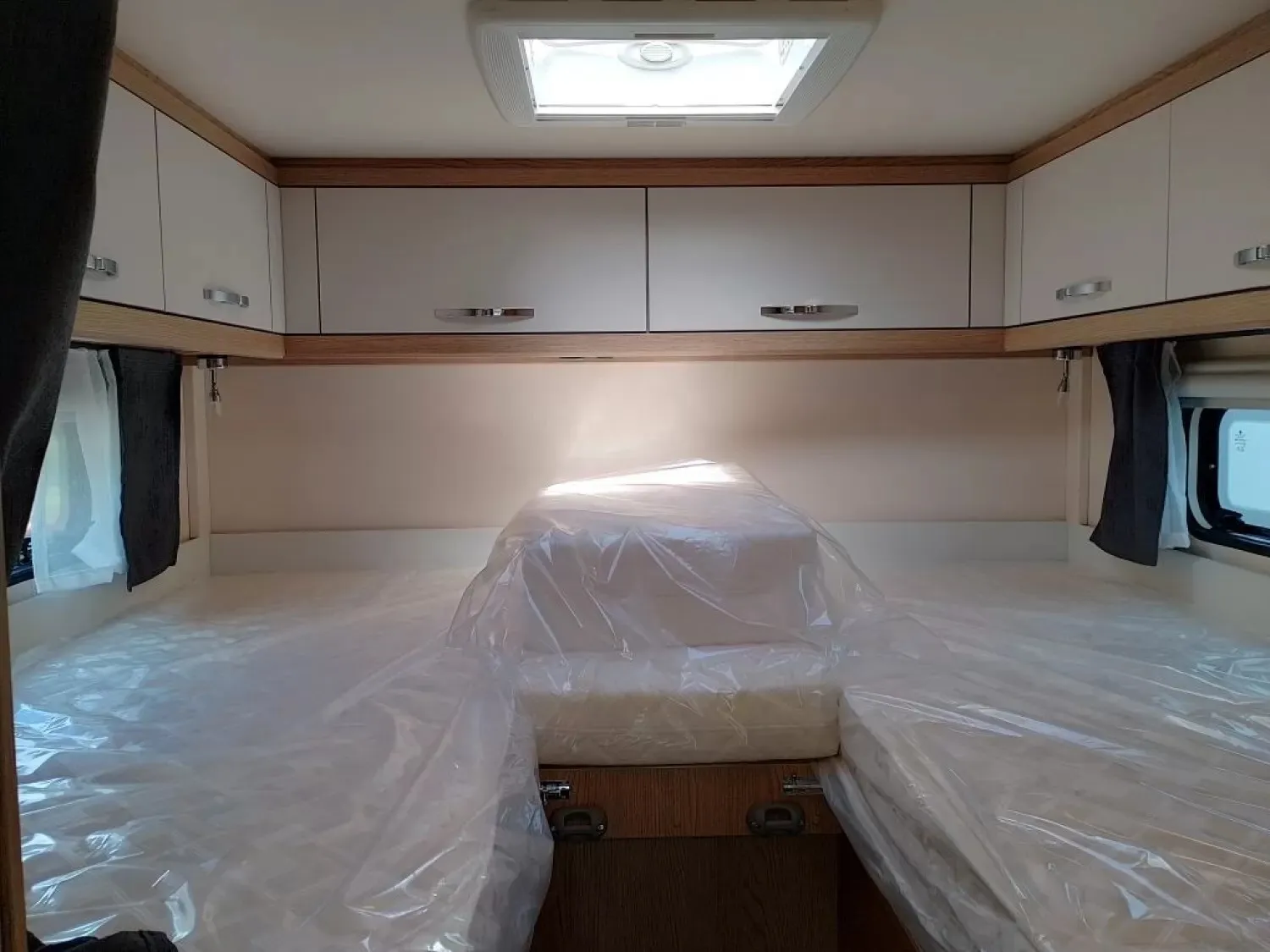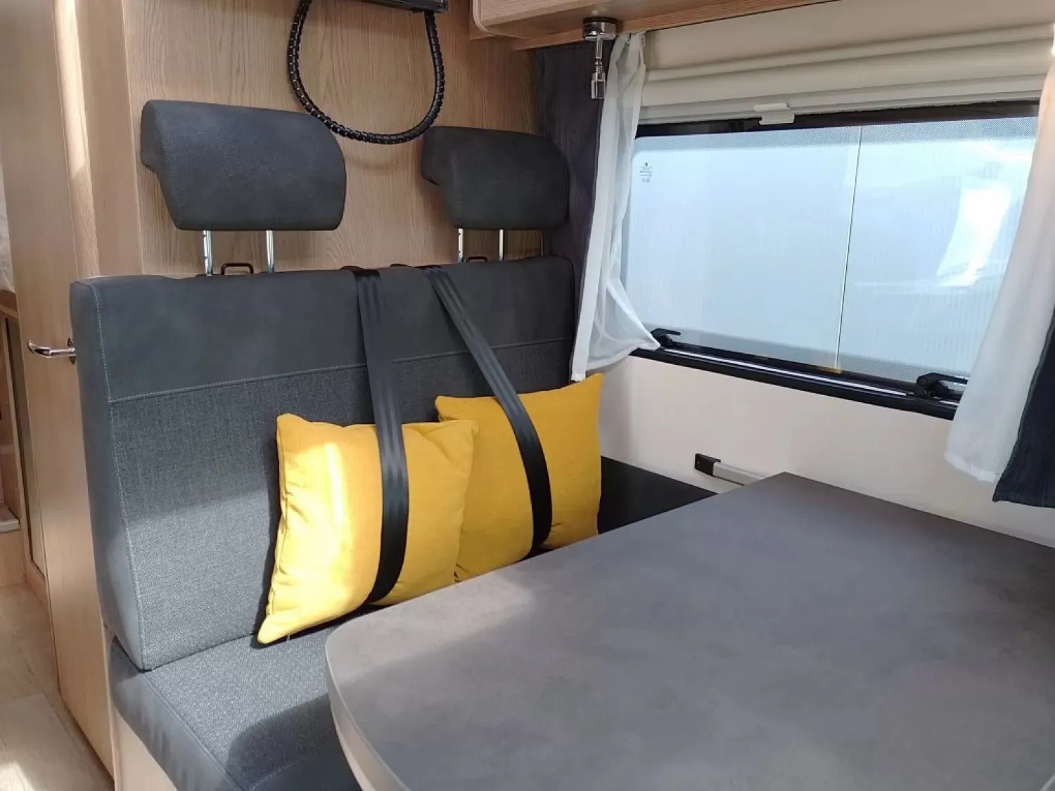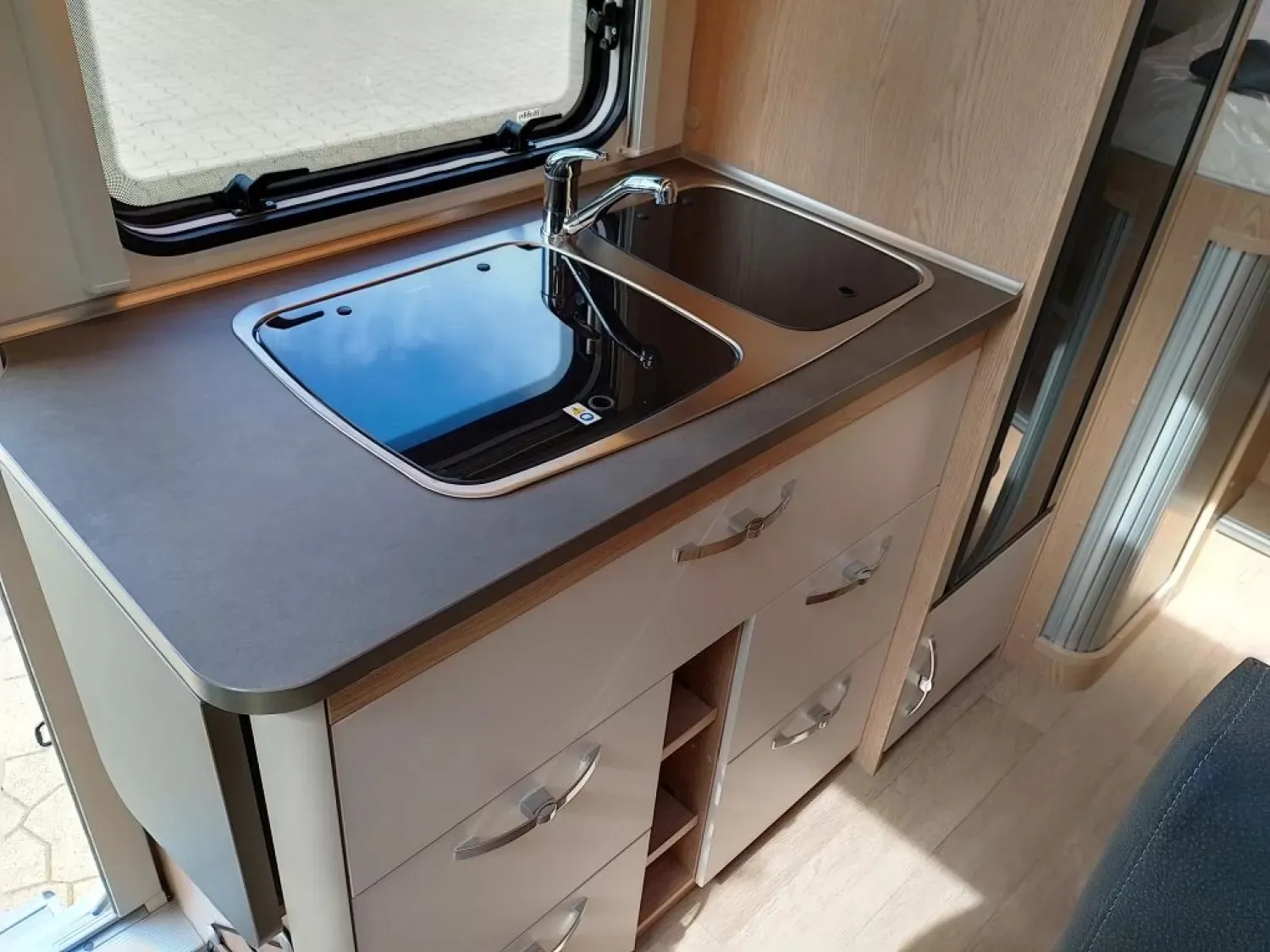 - Rahmenfenster, ausstellbar, doppelt verglast und getönt, auf der Fahrerseite im Schlafbereich, 840 x 260 mm