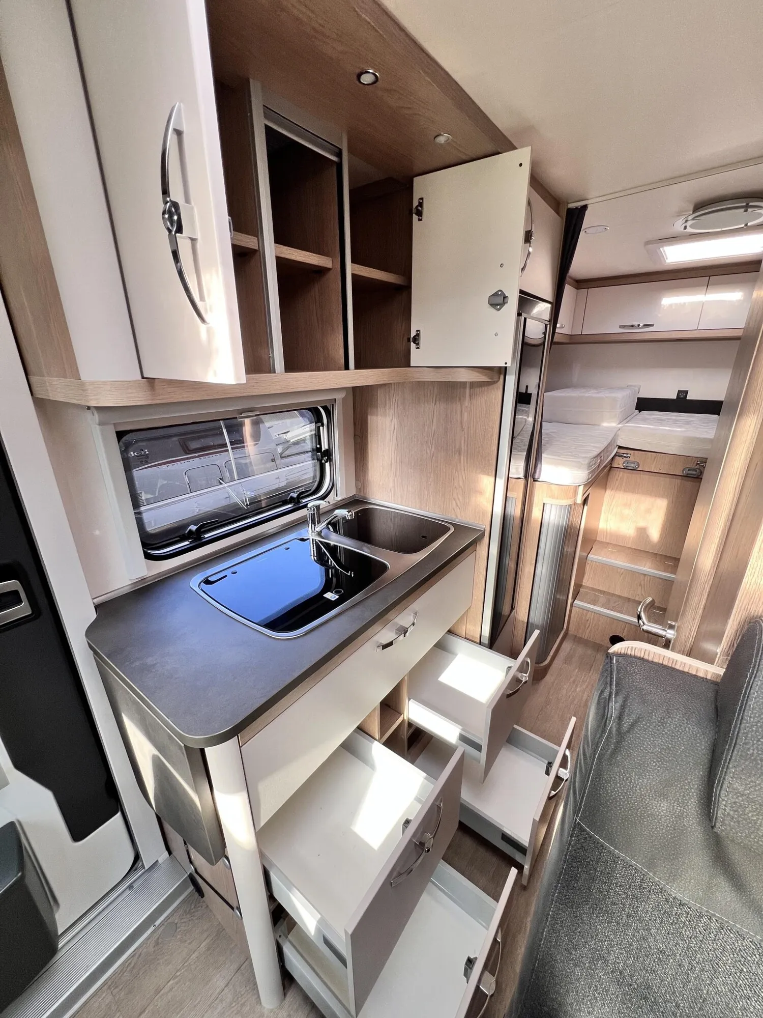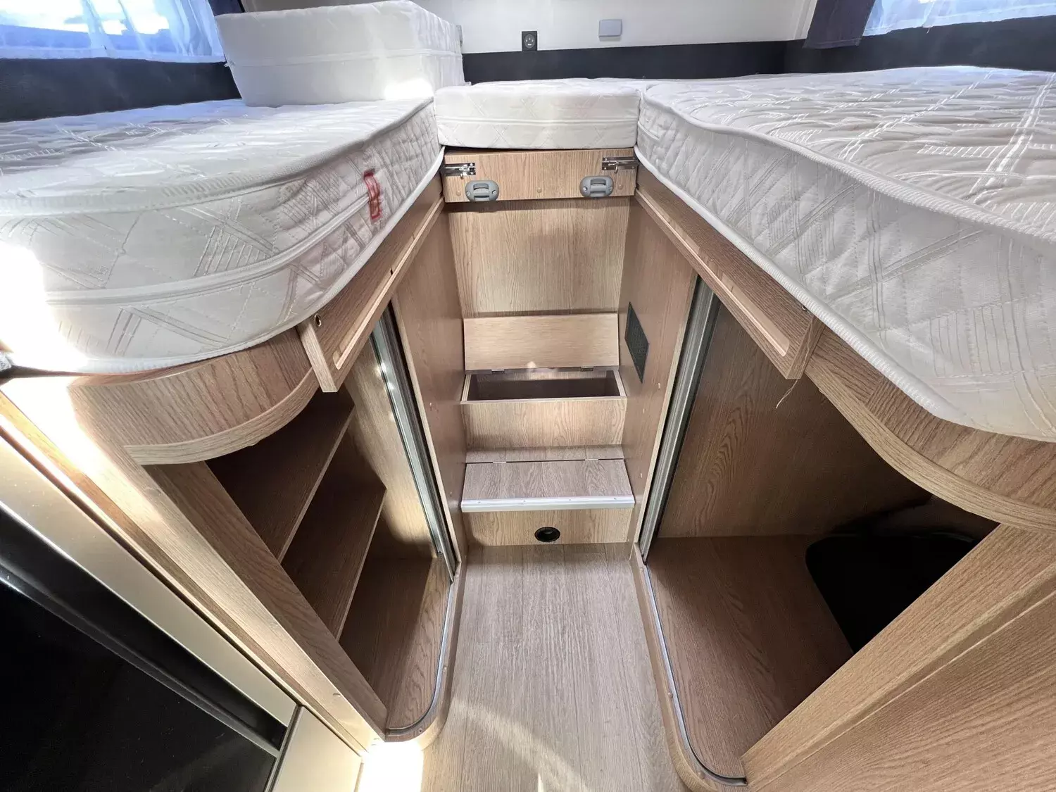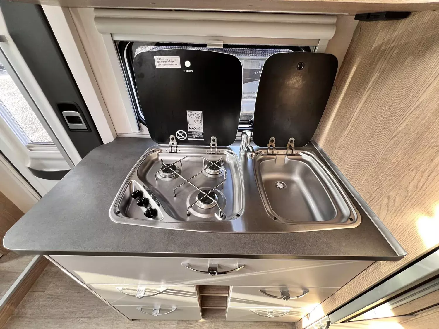 - Vorhängefenster, ausstellbar, doppelt verglast und getönt, auf der Fahrerseite im Schlafbereich, 840 x 260 mm